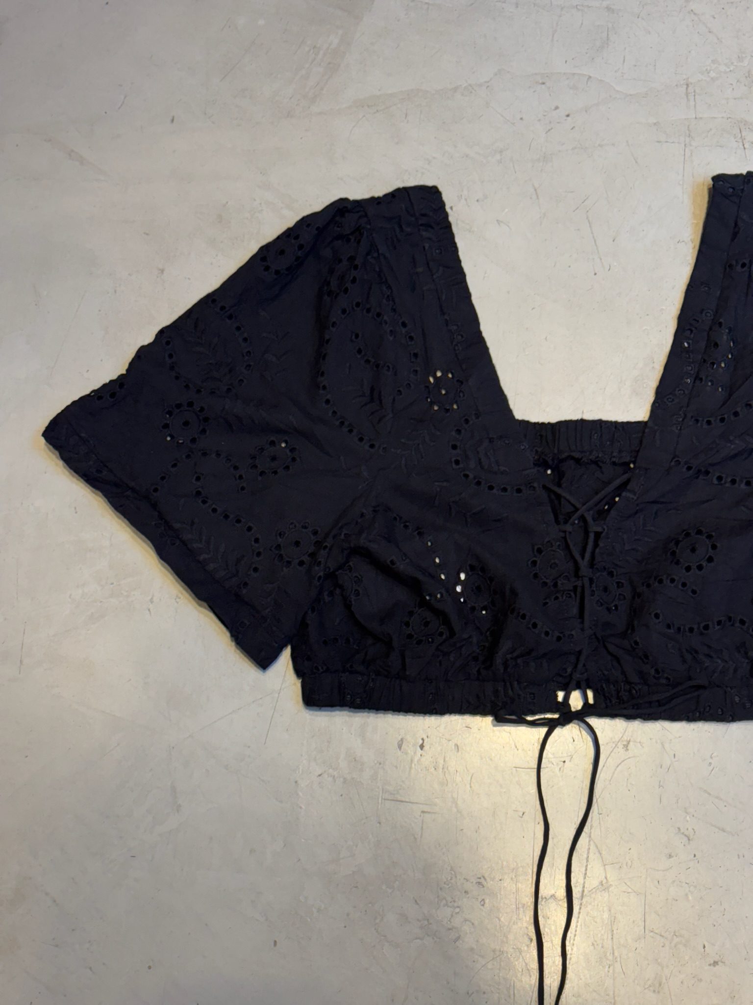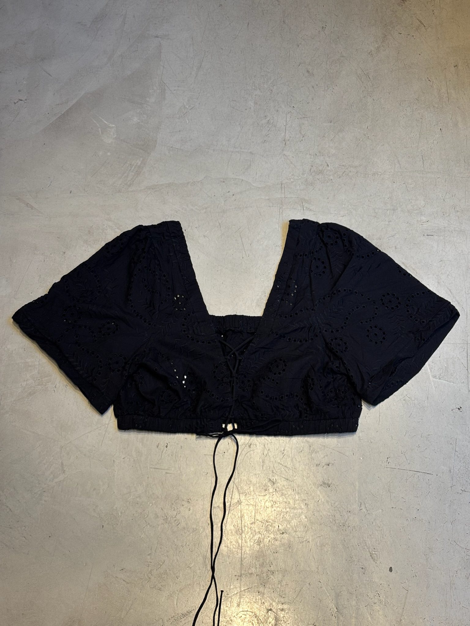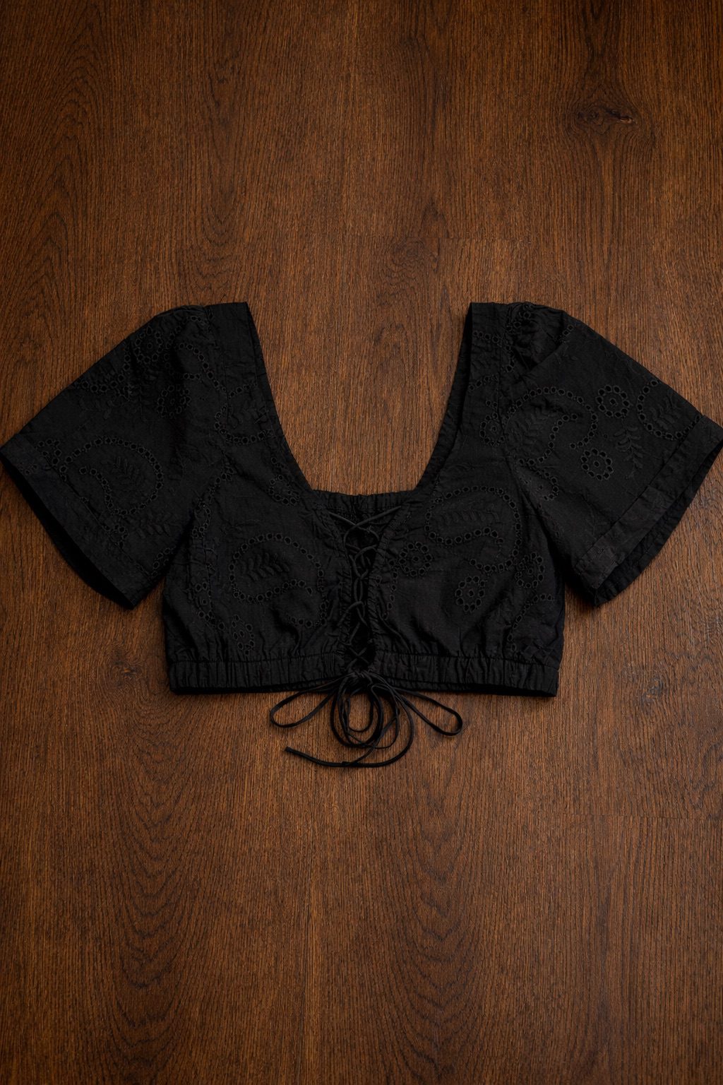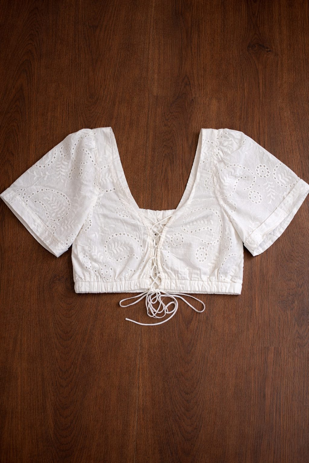 Blusa crop top confeccionada en tela broderie 100% algodón, con bordado calado y detalles de puntilla. Escote cuadrado y mangas cortas abullonadas que le dan un estilo cottagecore chic. Ajuste frontal mediante cordón para regular el calce. Ideal para combinar con faldas midi o pantalones de tiro alto en verano