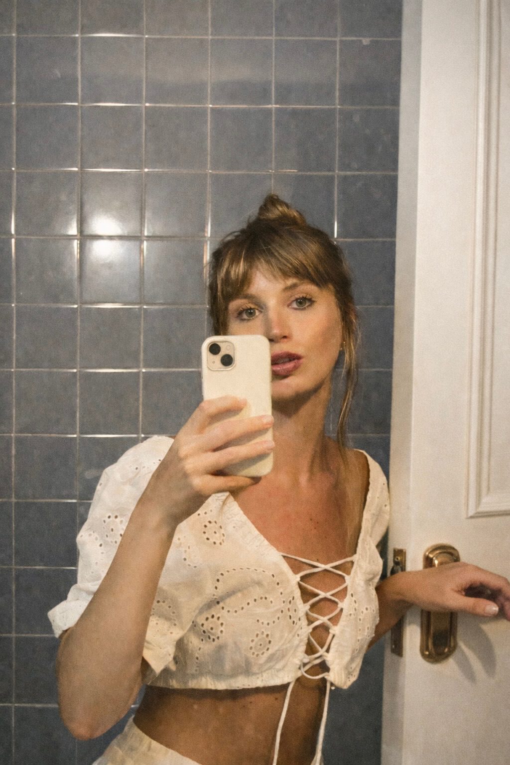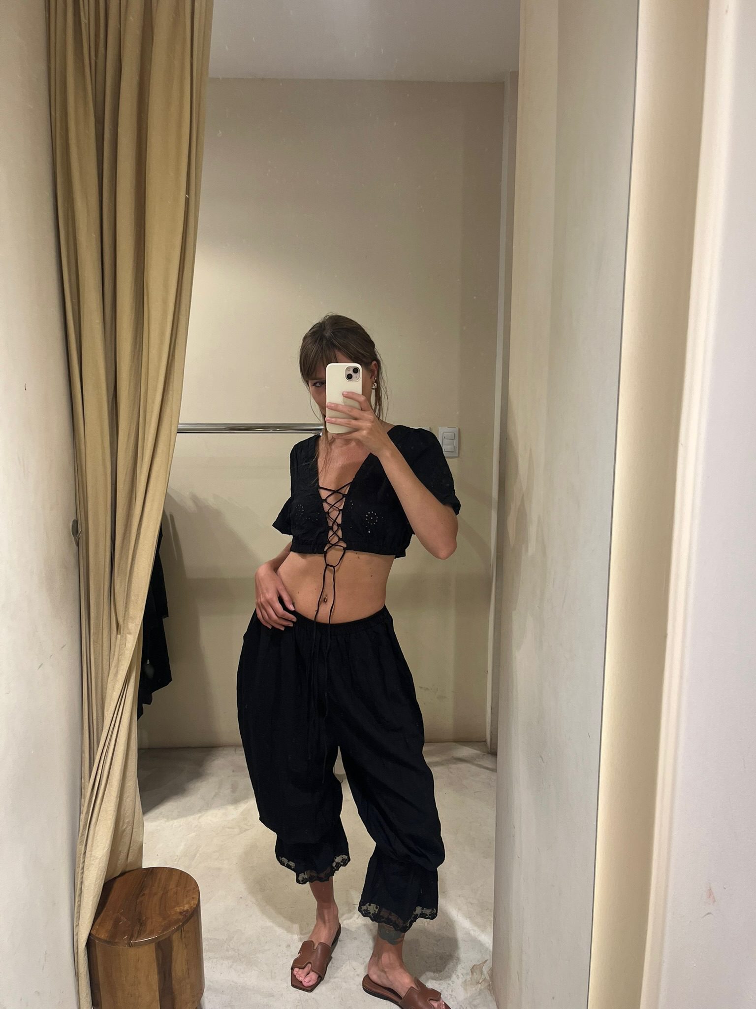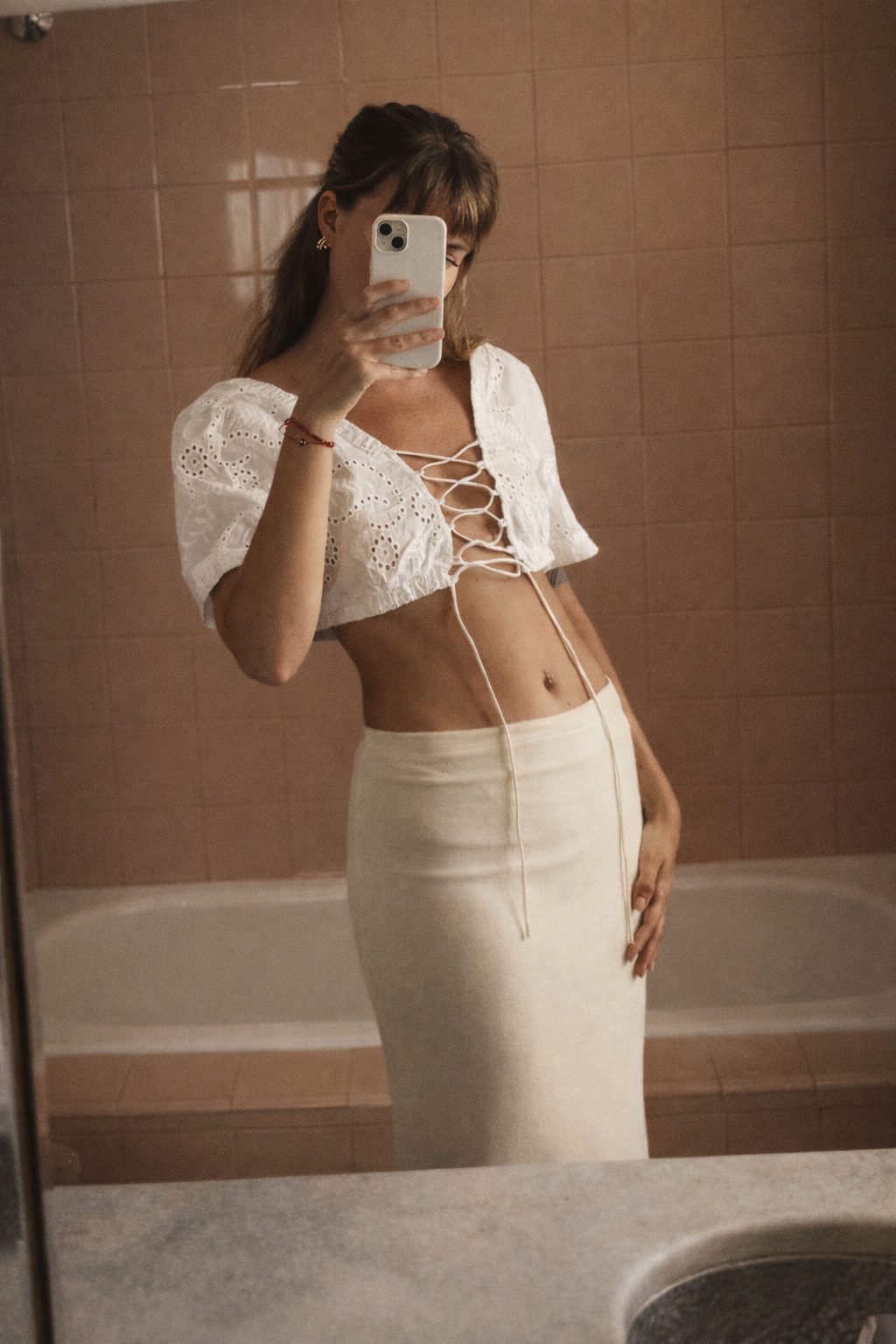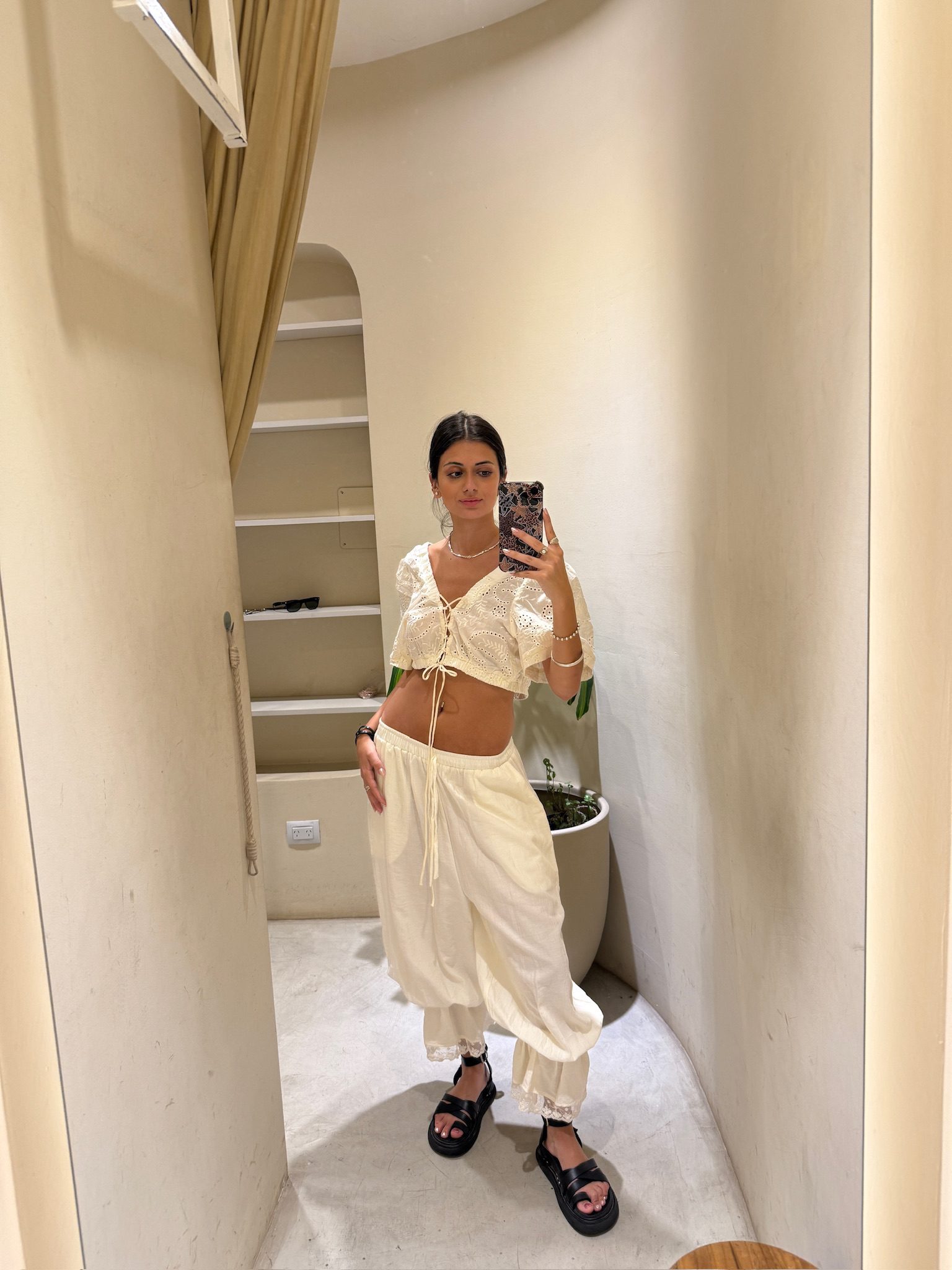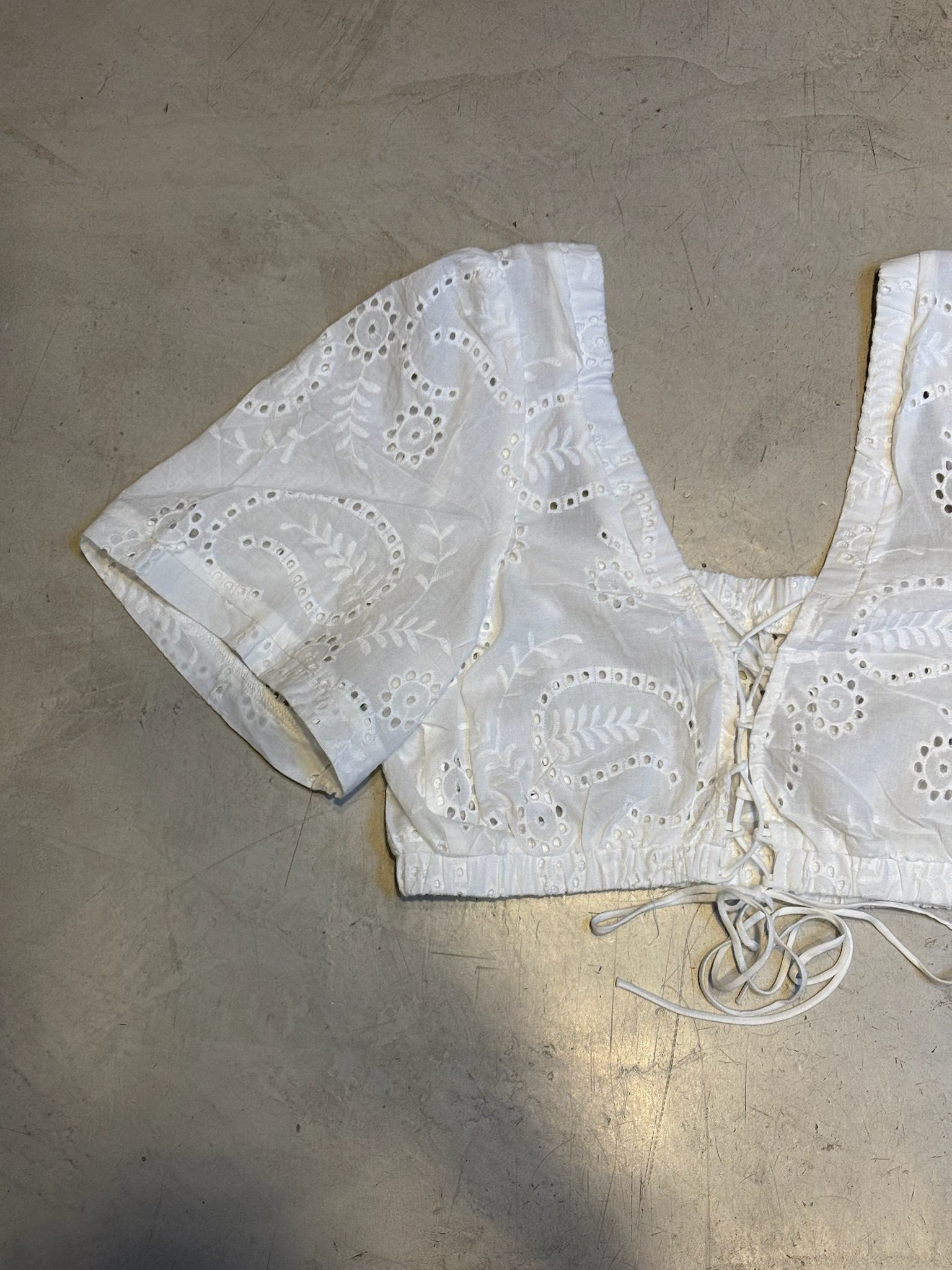 Blusa crop top confeccionada en tela broderie 100% algodón, con bordado calado y detalles de puntilla. Escote cuadrado y mangas cortas abullonadas que le dan un estilo cottagecore chic. Ajuste frontal mediante cordón para regular el calce. Ideal para combinar con faldas midi o pantalones de tiro alto en verano