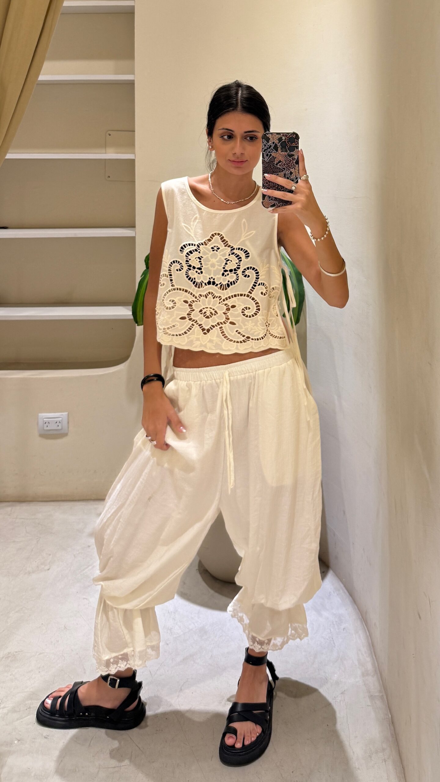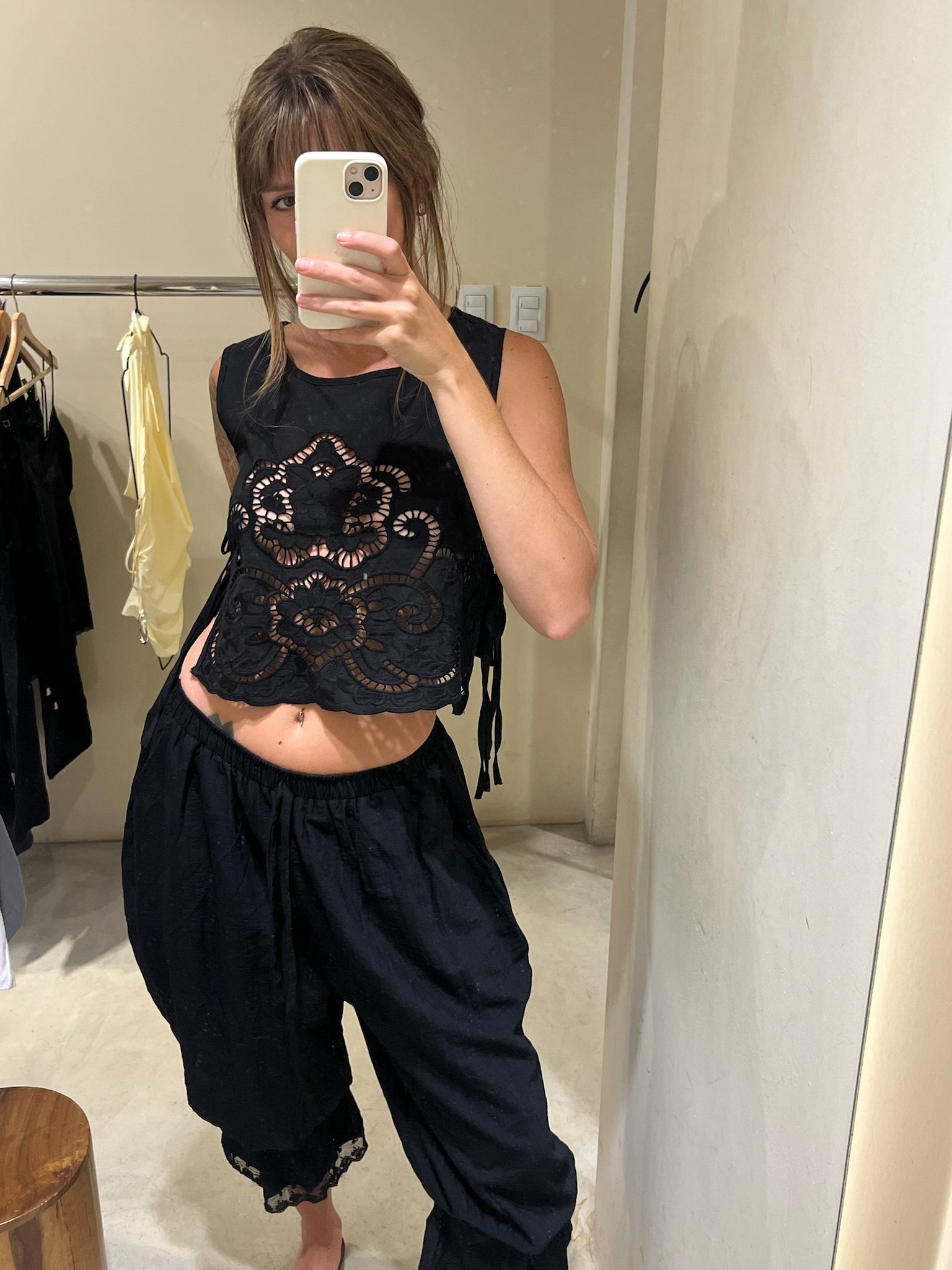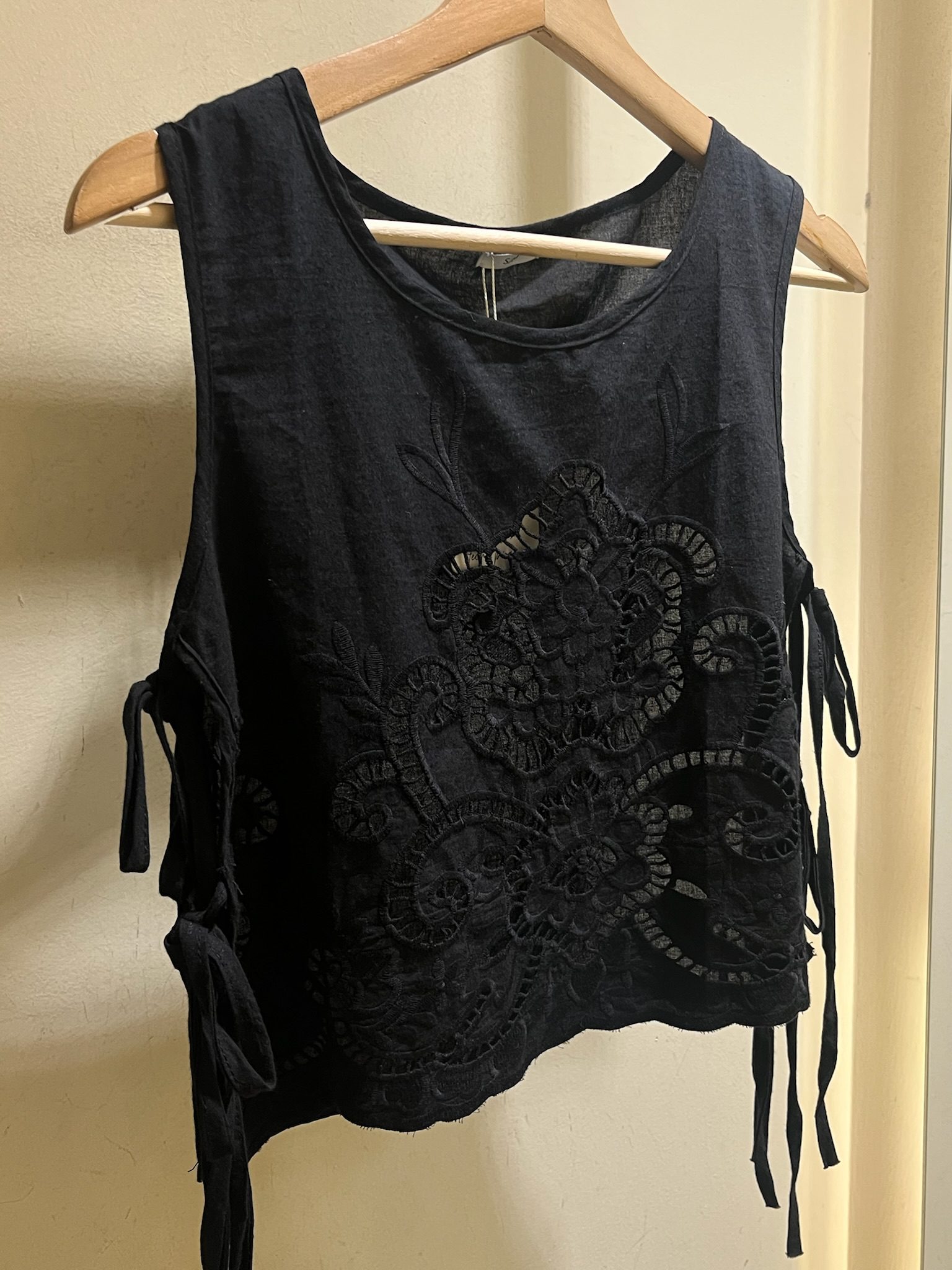 Top rústico con detalle de bordado calado circular grande en el frente. Confeccionado en tela de lino rústico, con lazos ajustables a los lados para un calce versátil y femenino. Ideal para looks boho chic de verano.