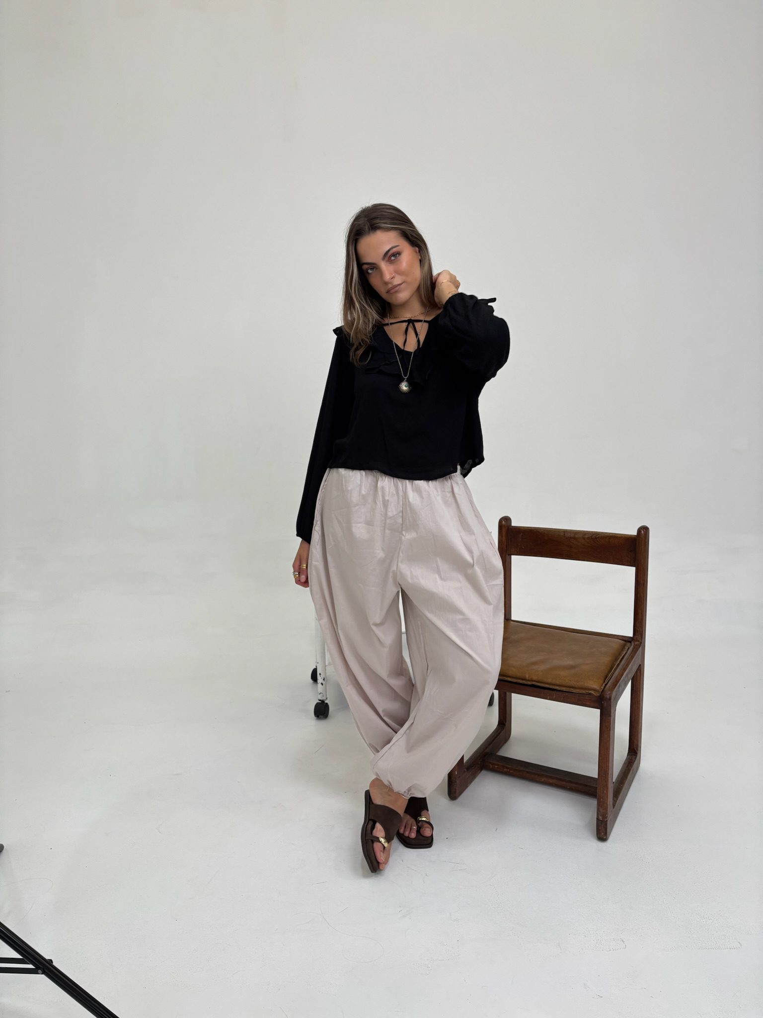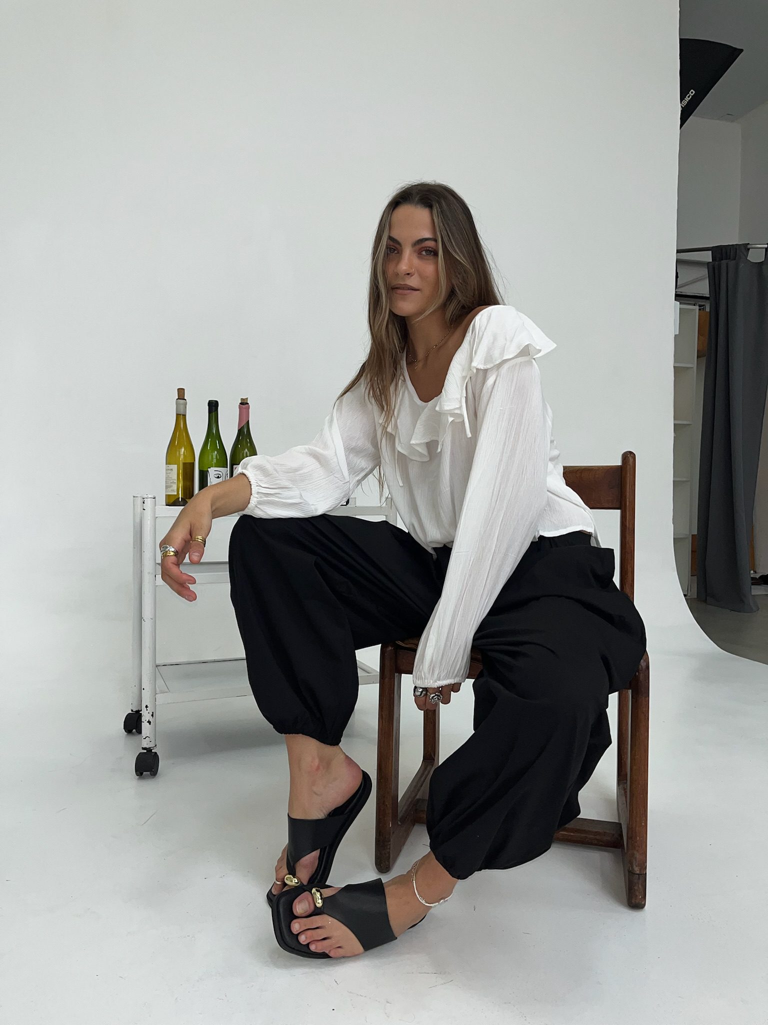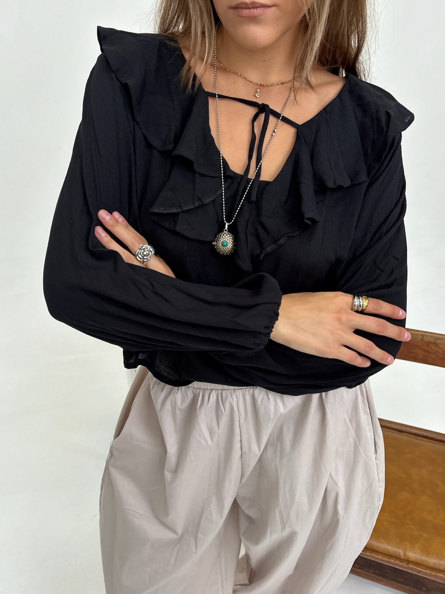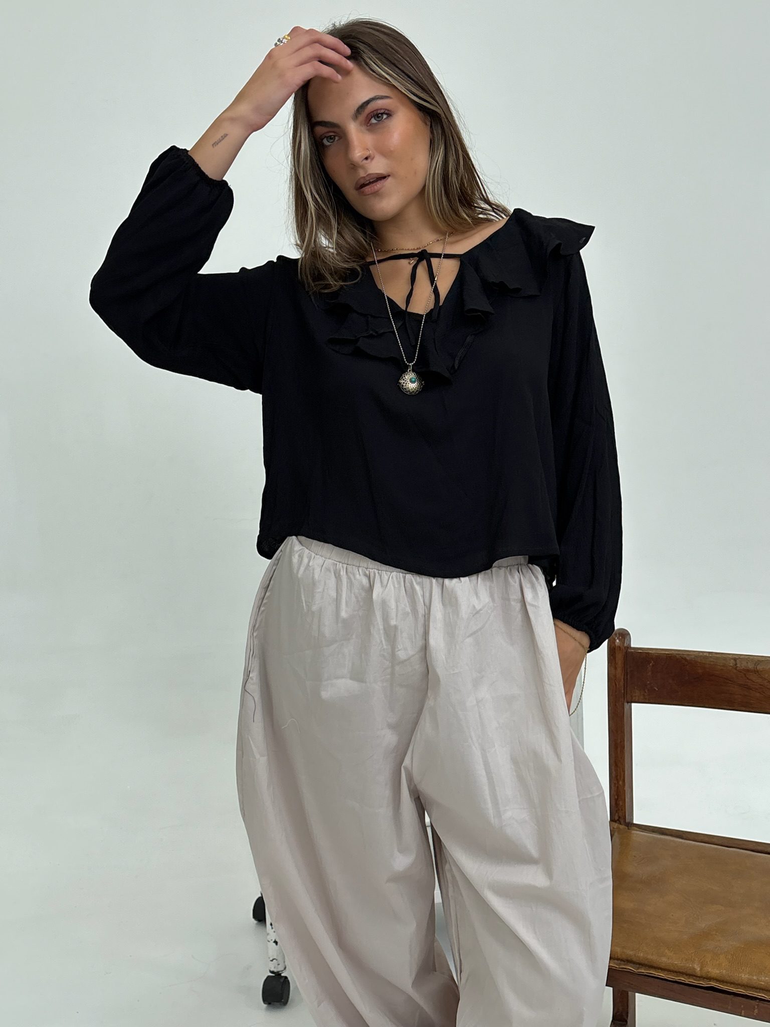 La BLUSA CAMERON es la pieza que estabas buscando para añadir un aire sofisticado y romántico a tu colección. El volado amplio en el escote y el lazo ajustable le dan un fit delicado y femenino, mientras que el color negro la mantiene versátil. Su tejido ligero y caída fluida garantiza comodidad total.