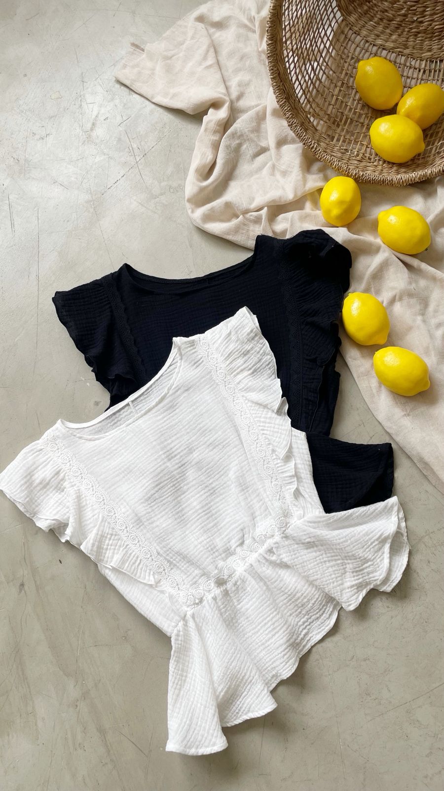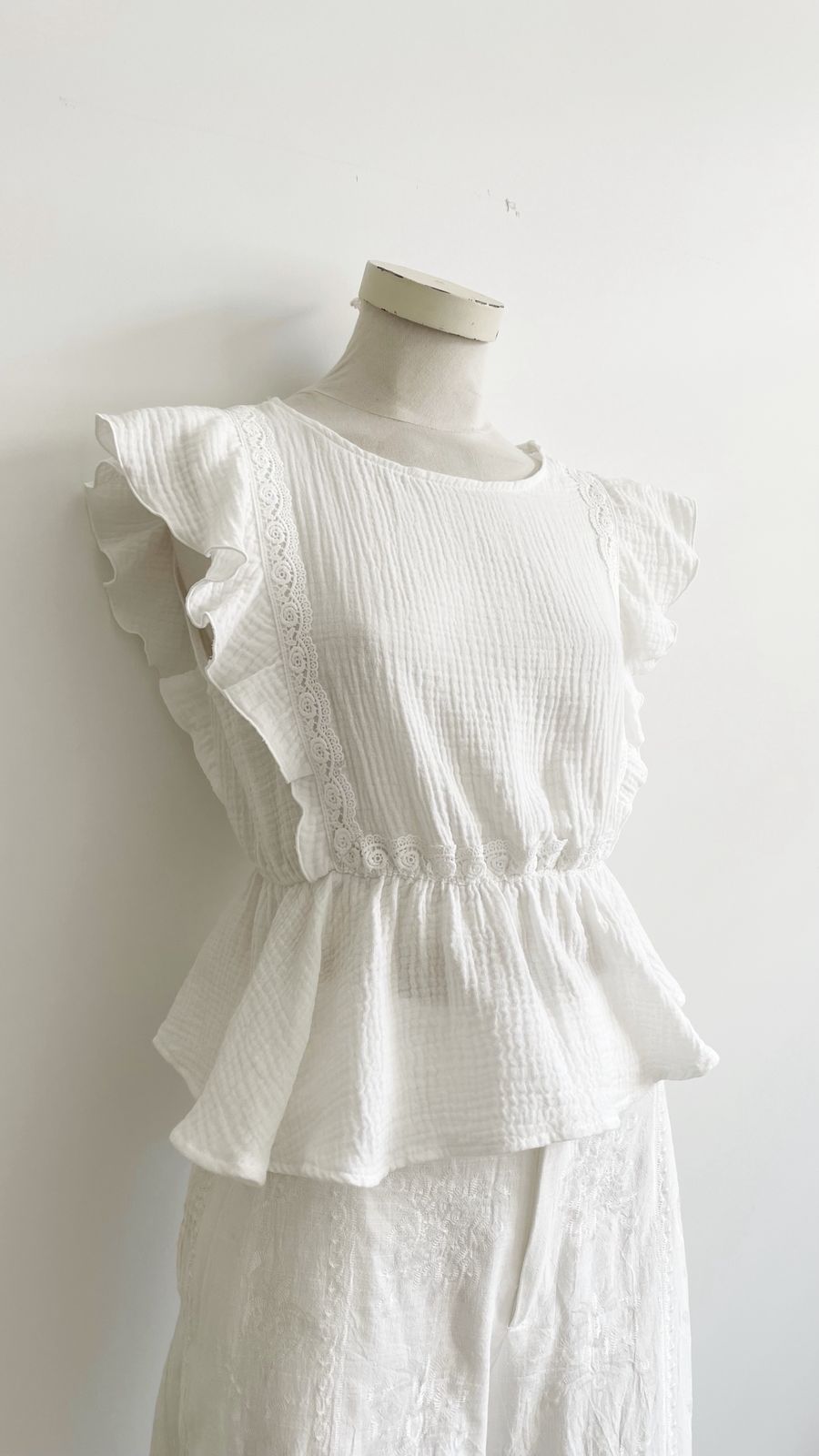 Blusa romántica de cuello redondo, confeccionada en baby cotton para un acabado suave y ligero. Presenta delicados volados en los hombros y un fino detalle de puntilla a lo largo del escote y la cintura. Su bajo está acabado en un elástico que crea un efecto peplum (ajustado en la cintura). Es la prenda perfecta para un look femenino y de verano.