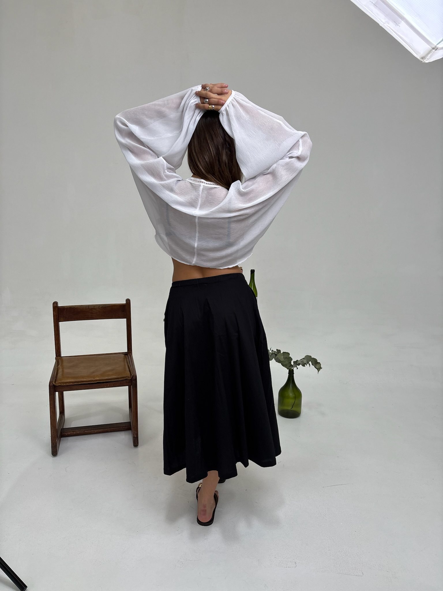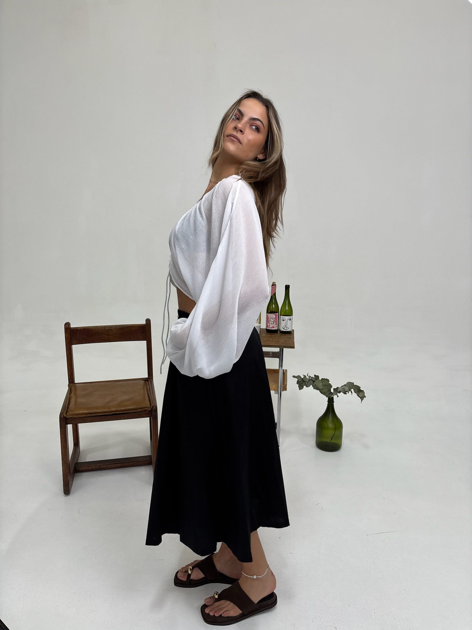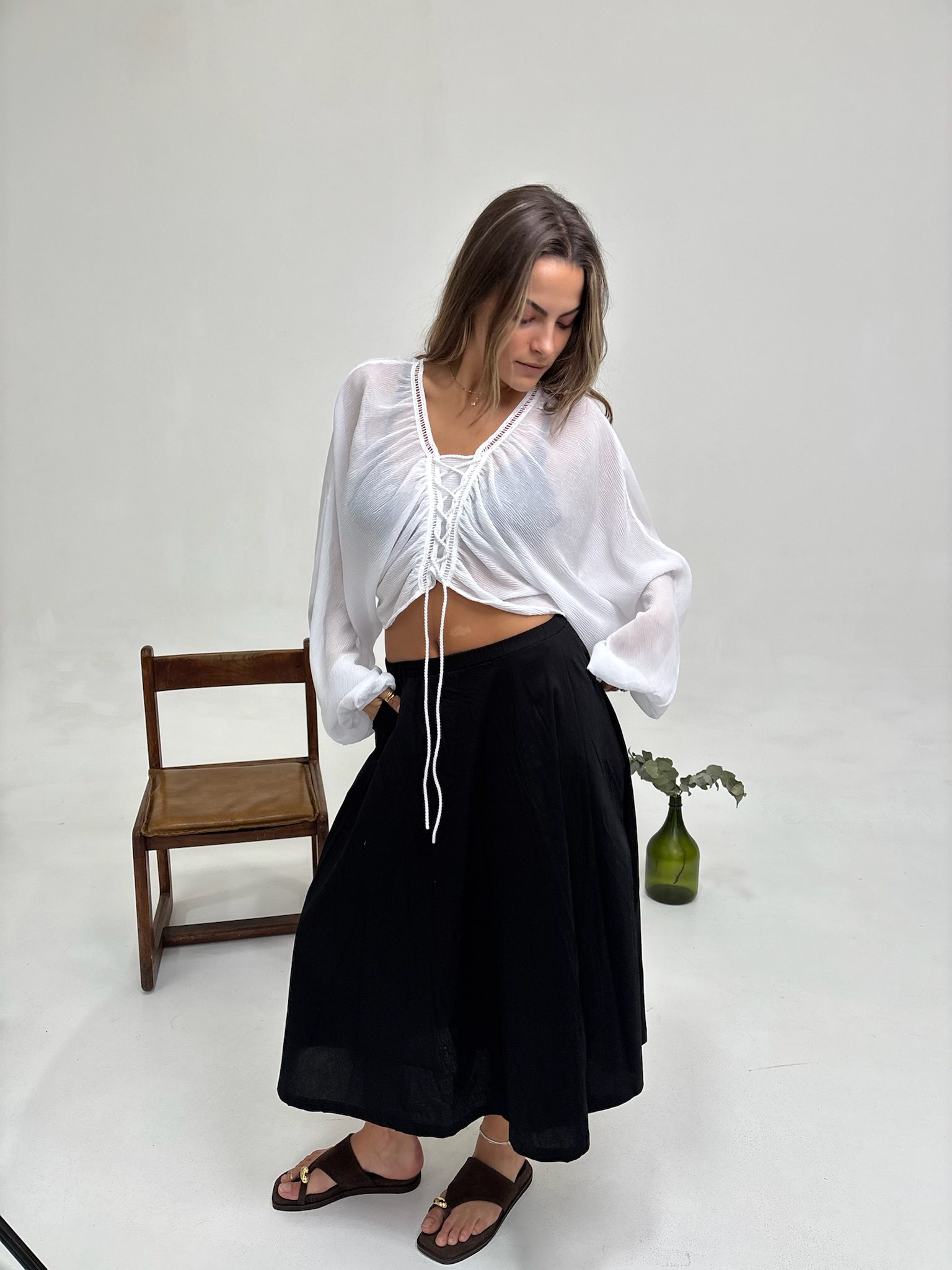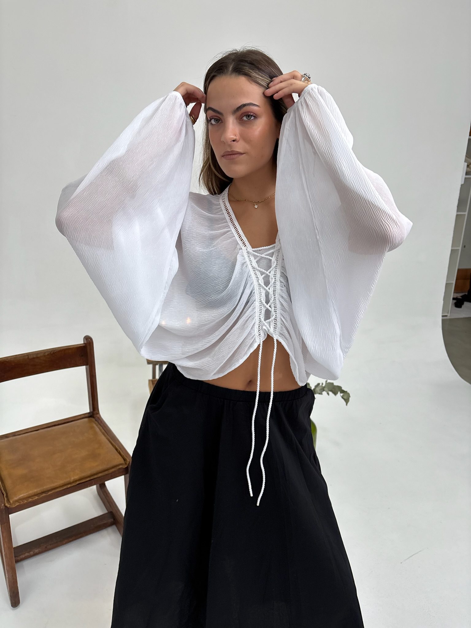 La BLUSA MUNBAI es una pieza liviana y con una personalidad única. Su tejido de gasa blanca semi-transparente presenta un original patrón de Chevron en relieve que le da cuerpo y textura. Con un escote en V fruncido y un corte holgado, es la prenda ideal para suavizar un look de denim.