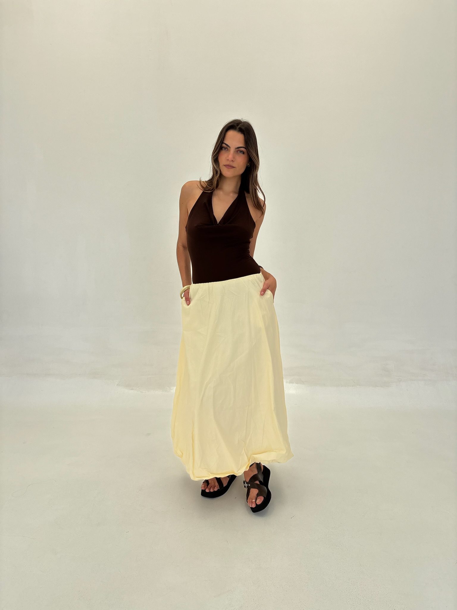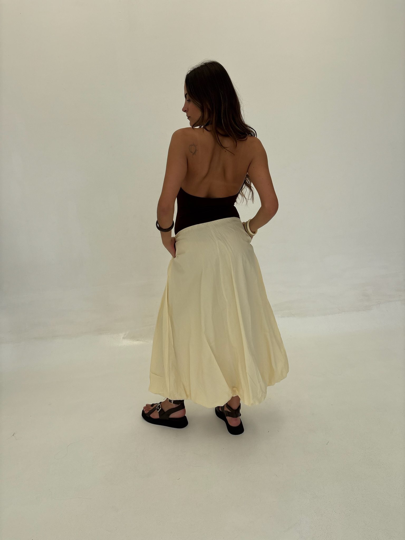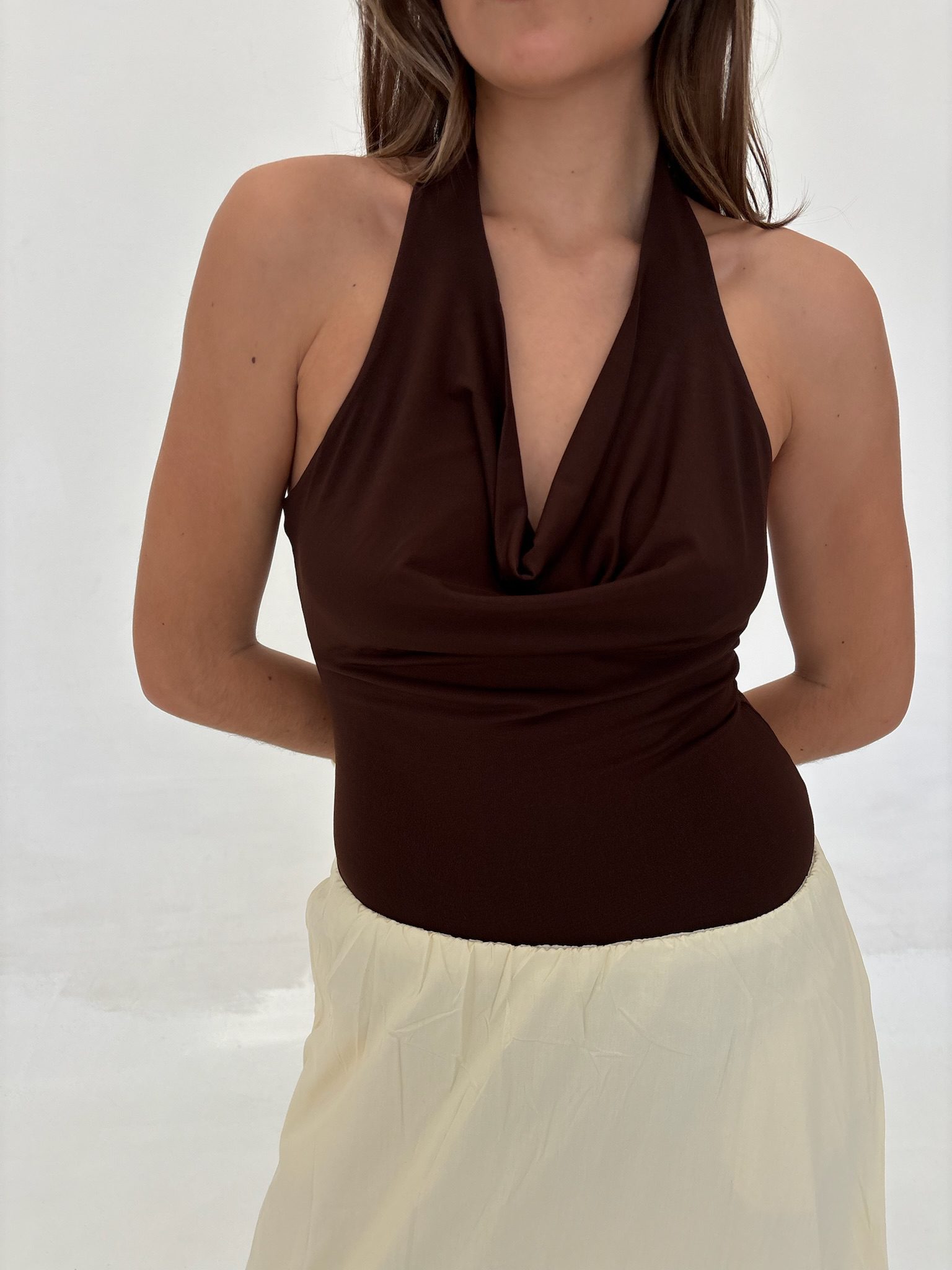 El Body Abuchonado es una prenda de diseño entallado. Cuenta con un cuello redondo y mangas largas con un efecto abuchonado en los hombros. Es un body versátil para combinar con diferentes partes de abajo, como pantalones o faldas.