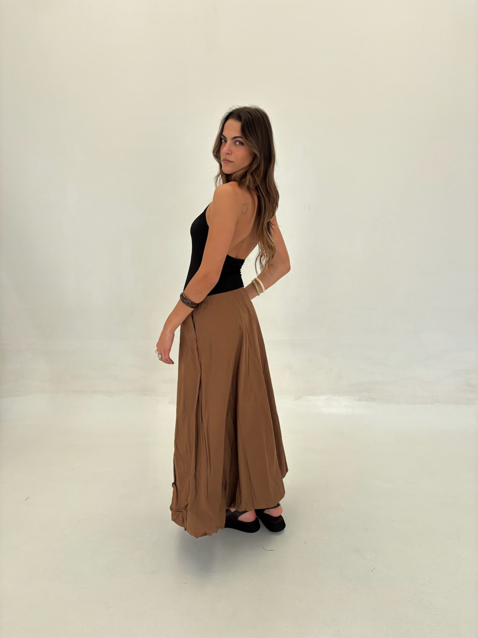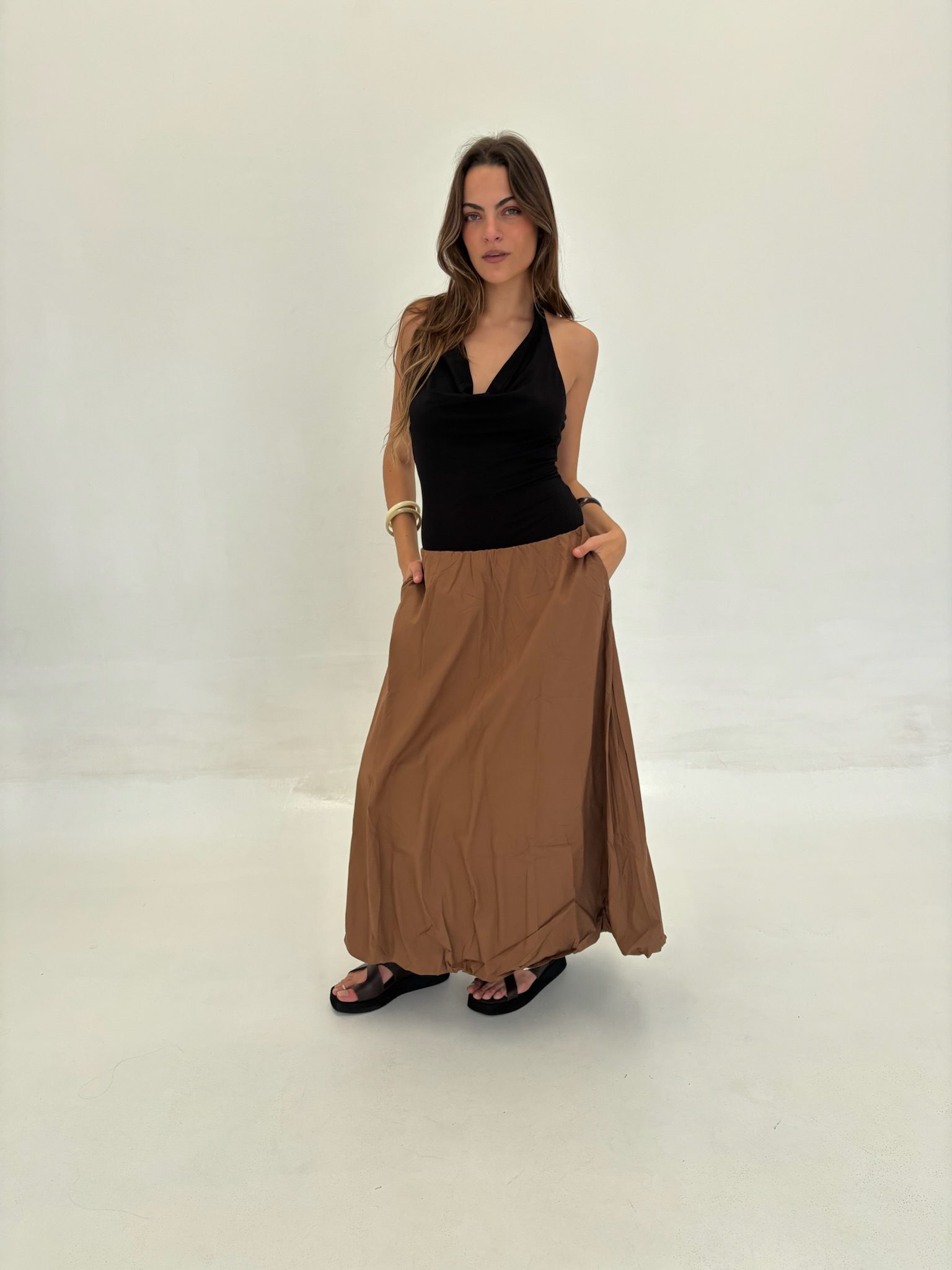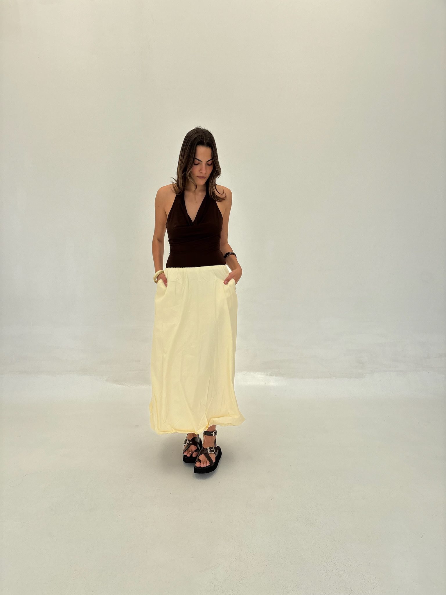 El Body Abuchonado es una prenda de diseño entallado. Cuenta con un cuello redondo y mangas largas con un efecto abuchonado en los hombros. Es un body versátil para combinar con diferentes partes de abajo, como pantalones o faldas.