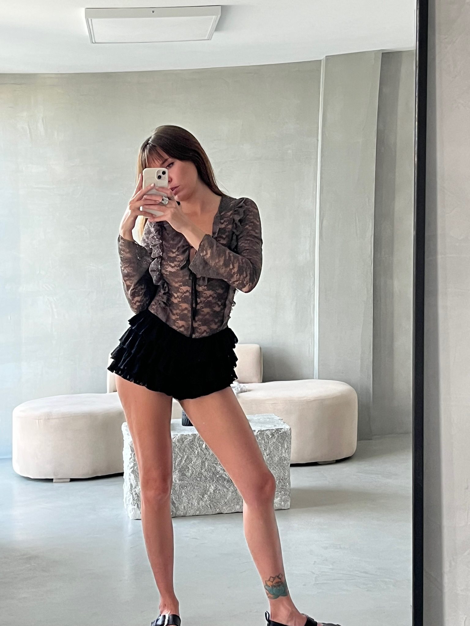 El body Olivia es la pieza que le faltaba a tus noches. Con un diseño de encaje súper sensual y elegante, este body no es solo para ocasiones especiales, es para cuando vos querés sentirte imparable. Los detalles de volados en el escote y las mangas le dan un toque romántico, mientras que el cordón en el frente te permite ajustarlo a tu gusto. Ponételo con un pantalón de cuero para un look de noche, o con un jean de tiro alto para un outfit que grite actitud. Es la prenda perfecta para salir, para una cita, o simplemente para sentirte poderosa y sexy en tu día a día.