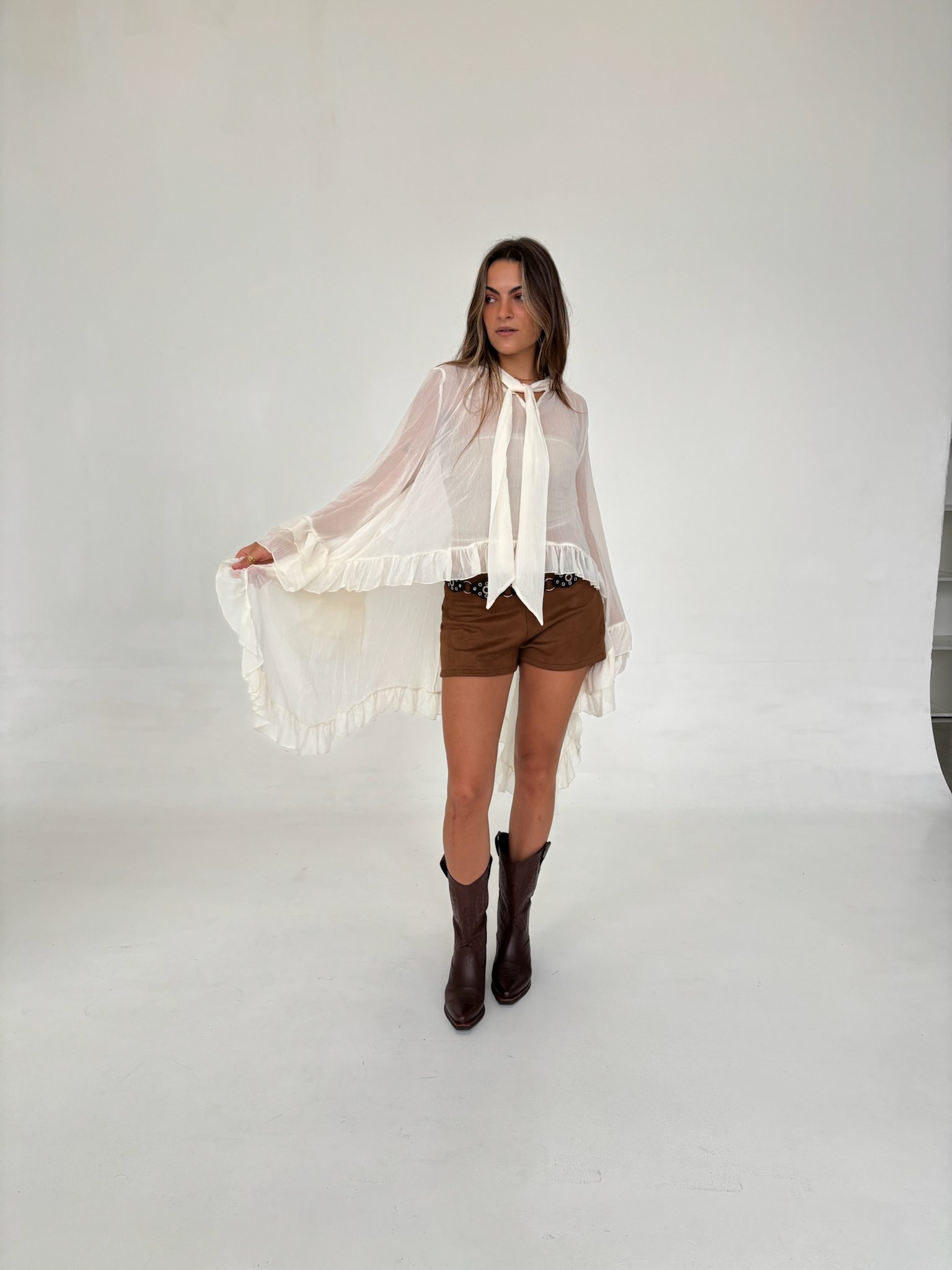 Esta prenda fusiona la estructura de una camisa clásica con la sensualidad de un top ajustable y cropped. Su corte es un esencial de Overwild para estilizar la figura y crear looks de alto impacto.
