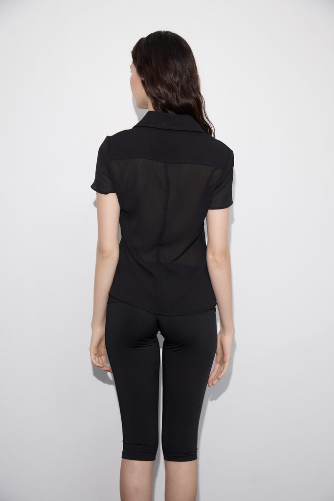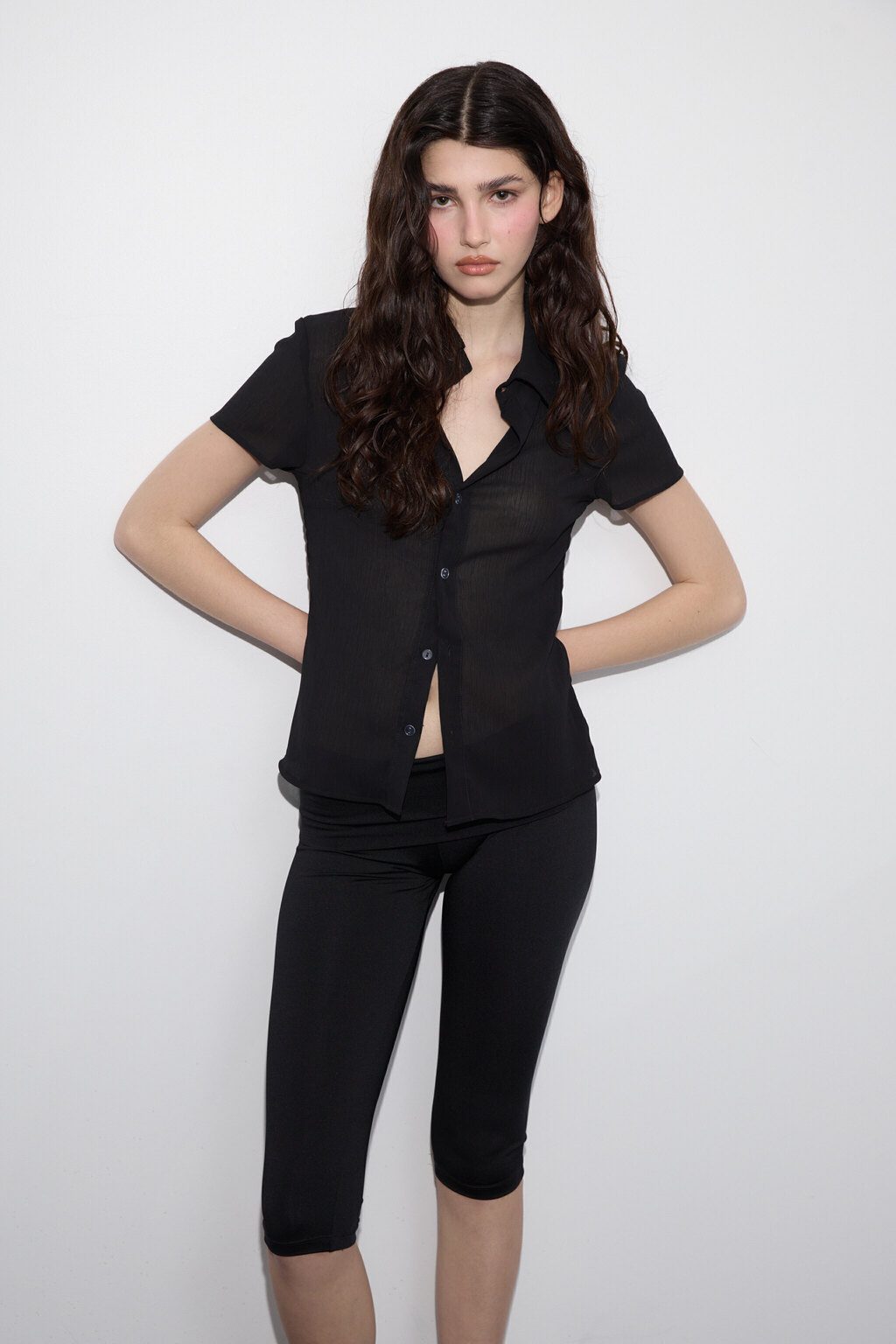 Camisa de bámbula liviana y transparente, de corte al cuerpo y manga corta. Fresca y cómoda.