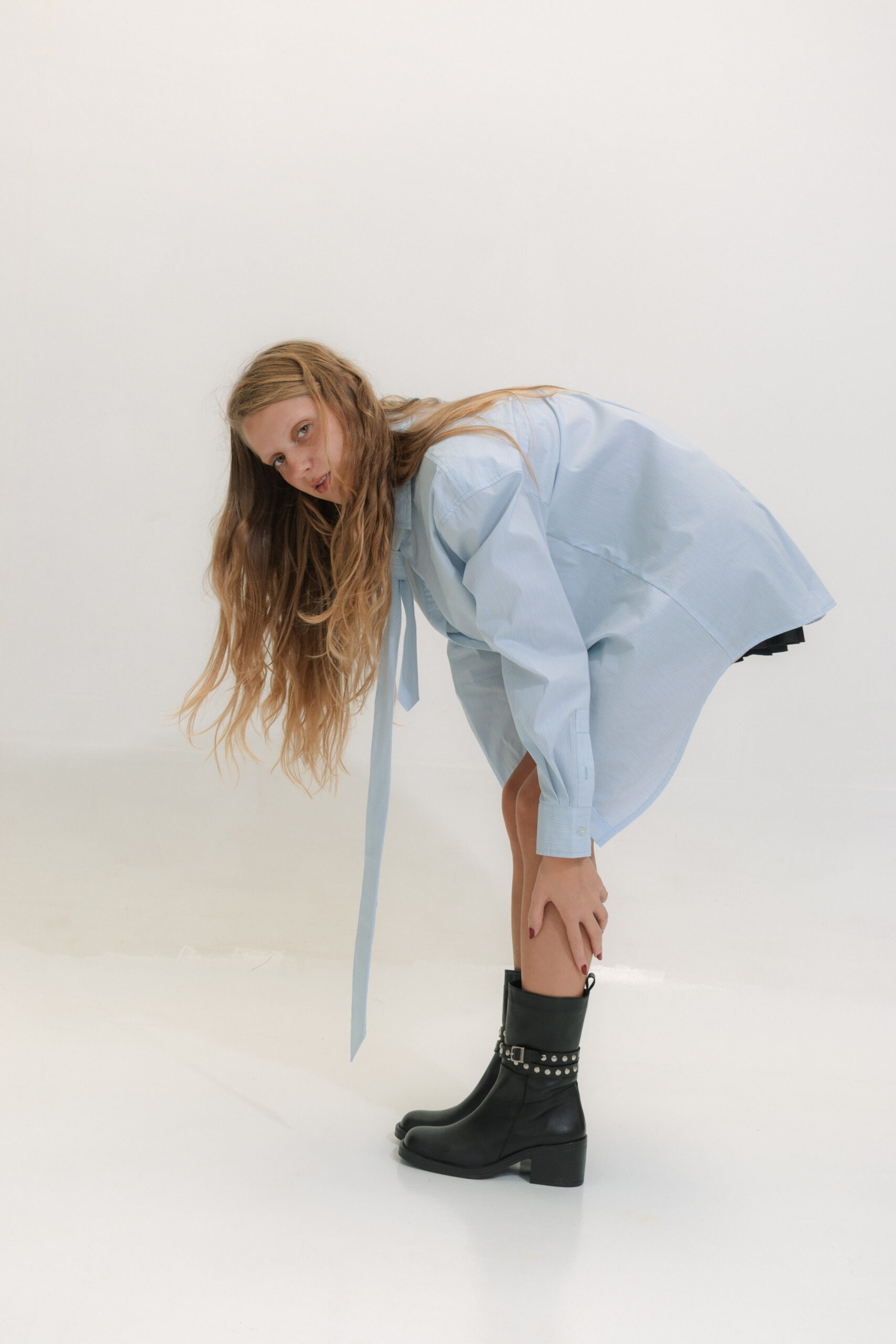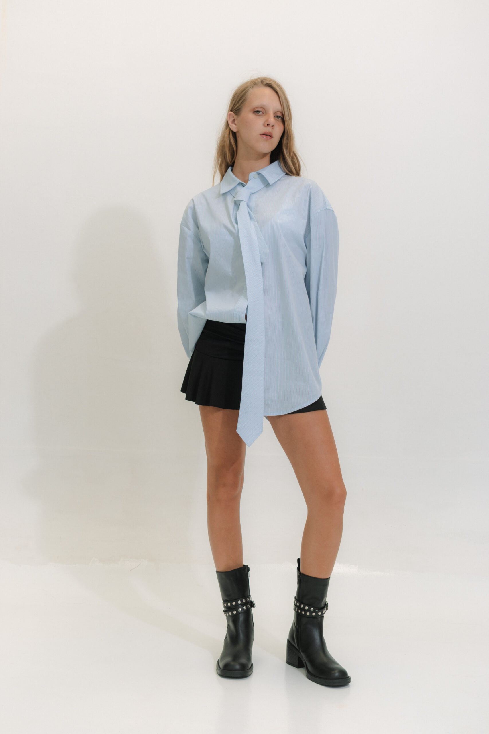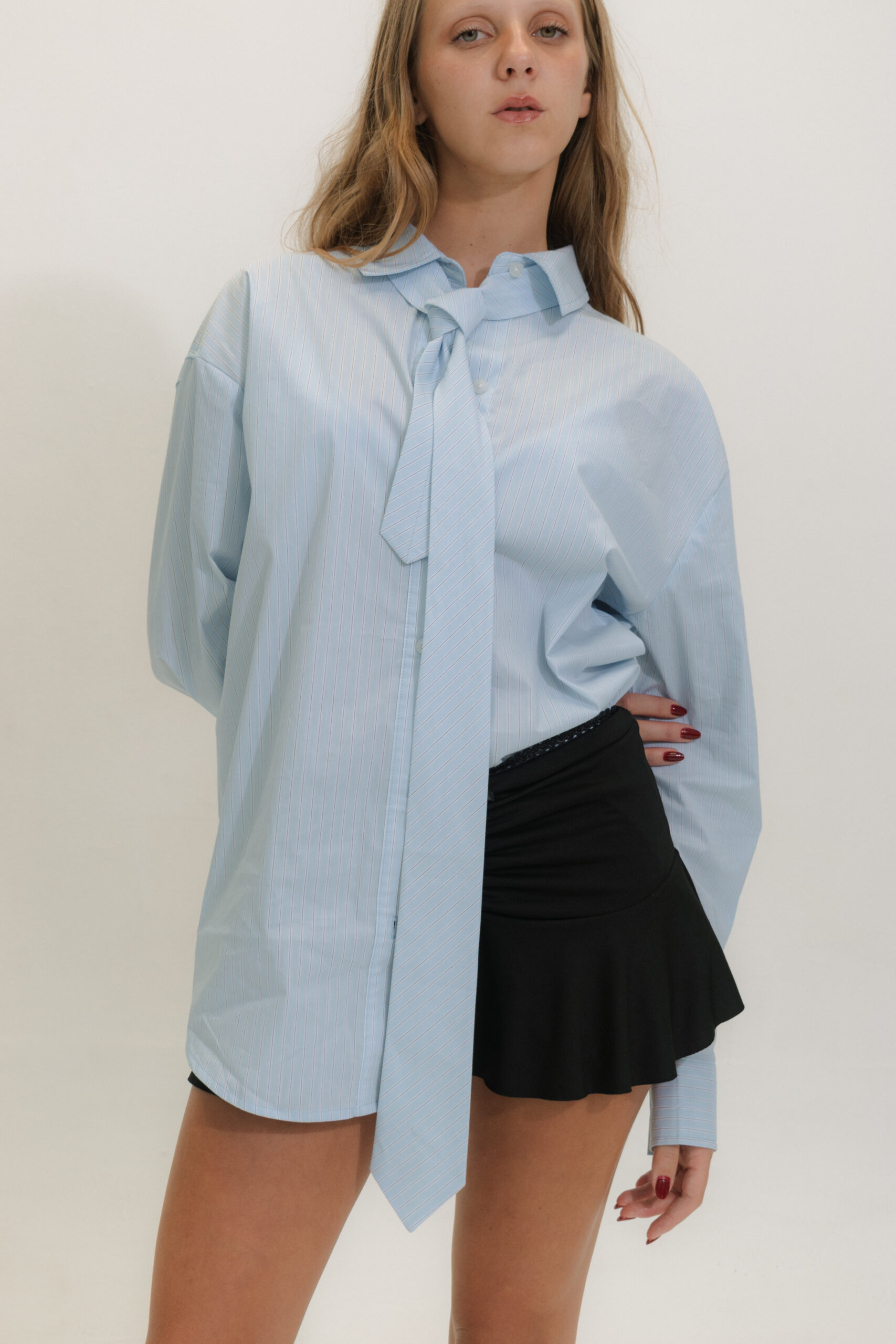Camisa de silueta amplia y relajada (oversized) confeccionada en popelina de algodón de alta calidad. Presenta hombros caídos, cuello camisero clásico y un largo extendido que aporta versatilidad: ideal para usar como prenda principal, abierta como sobrecamisa o anudada para un look más relajado. Incluye puños abotonados y una caída fluida que garantiza comodidad sin perder la estructura. Una prenda esencial para un estilo minimalista y moderno. Viene con su corbata que se puede sacar, no esta adherida a la prenda, para mayor versatilidad de looks