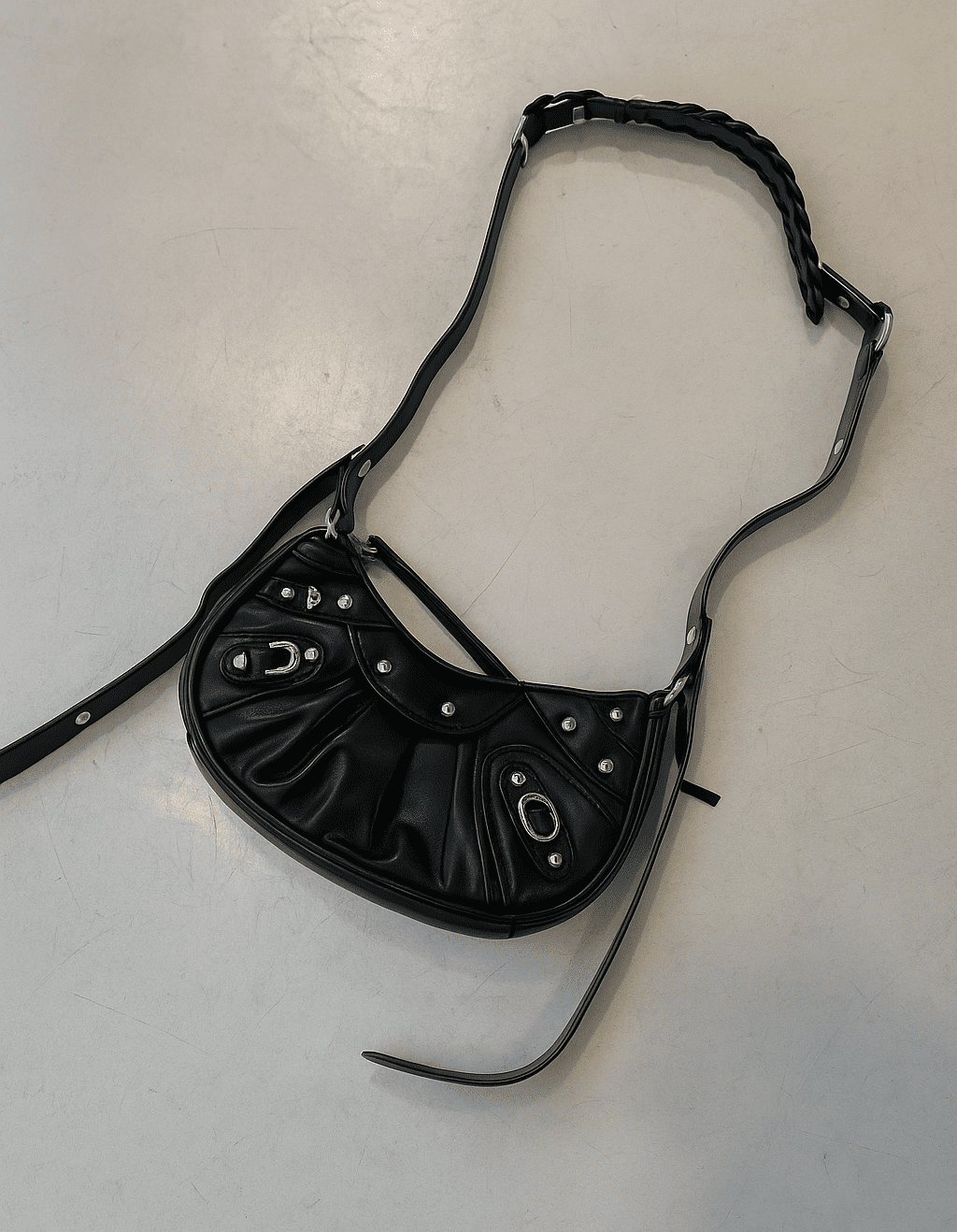 La Cartera KITTY es un bolso de hombro con un diseño semi-redondeado. Está confeccionada en cuero sintético y presenta detalles de tachas y hebillas que decoran la solapa. Su correa de hombro ajustable y su cierre de cremallera la convierten en un accesorio funcional para el uso diario.