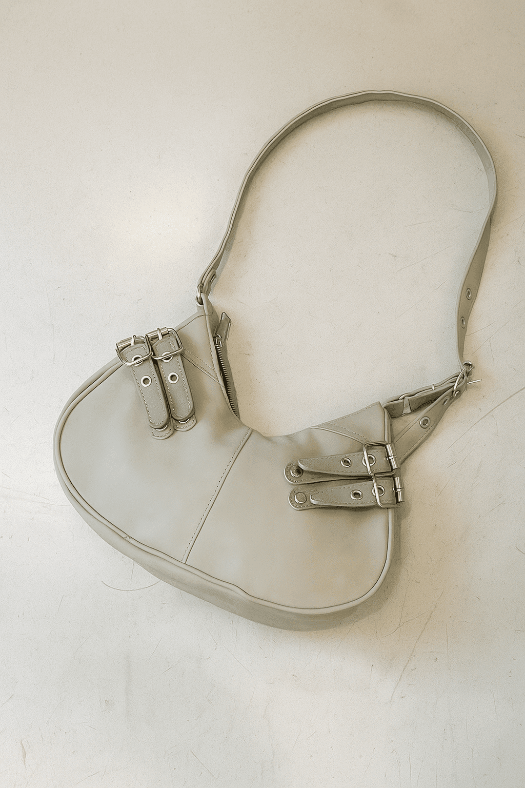 es un bolso de hombro con un diseño semi-redondeado. Está confeccionada en cuero sintético y presenta detalles de tachas y hebillas que decoran la solapa. Su correa de hombro ajustable y su cierre de cremallera la convierten en un accesorio funcional para el uso diario.