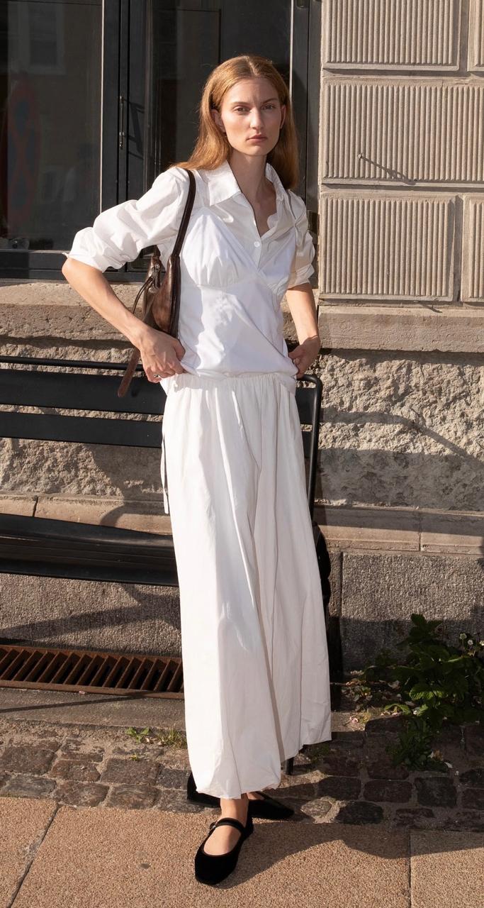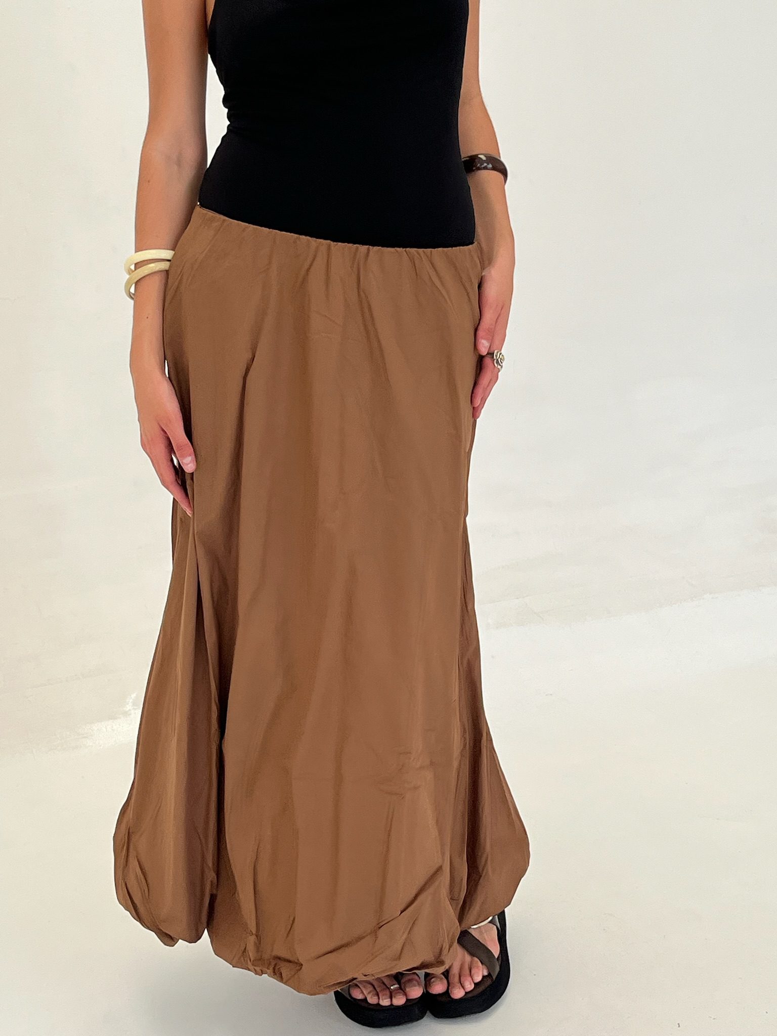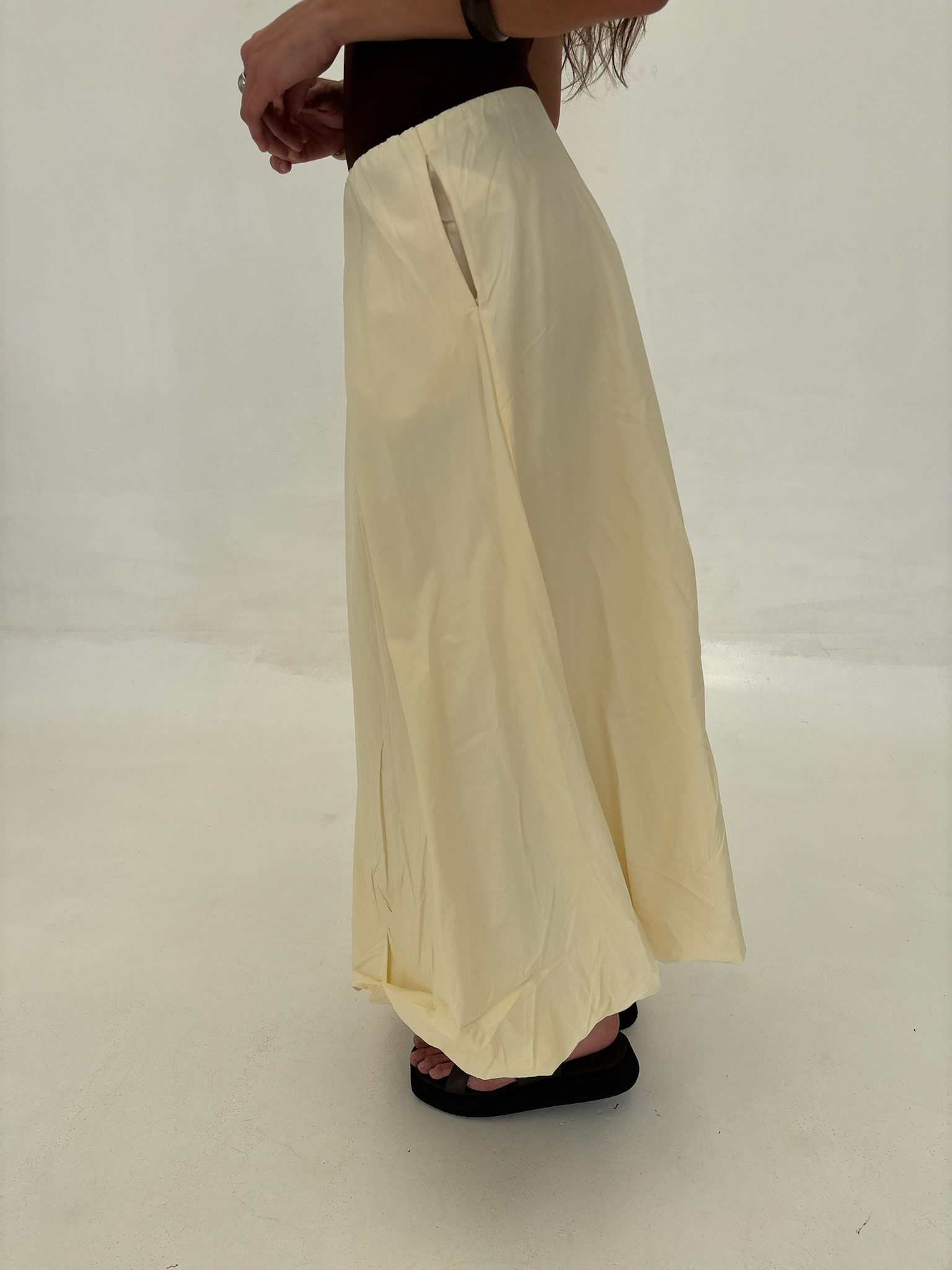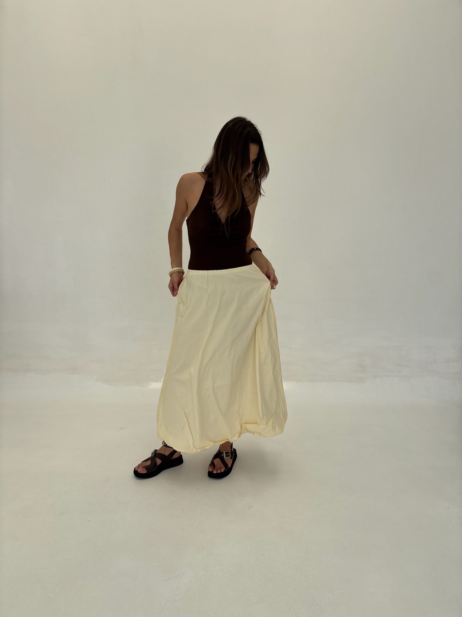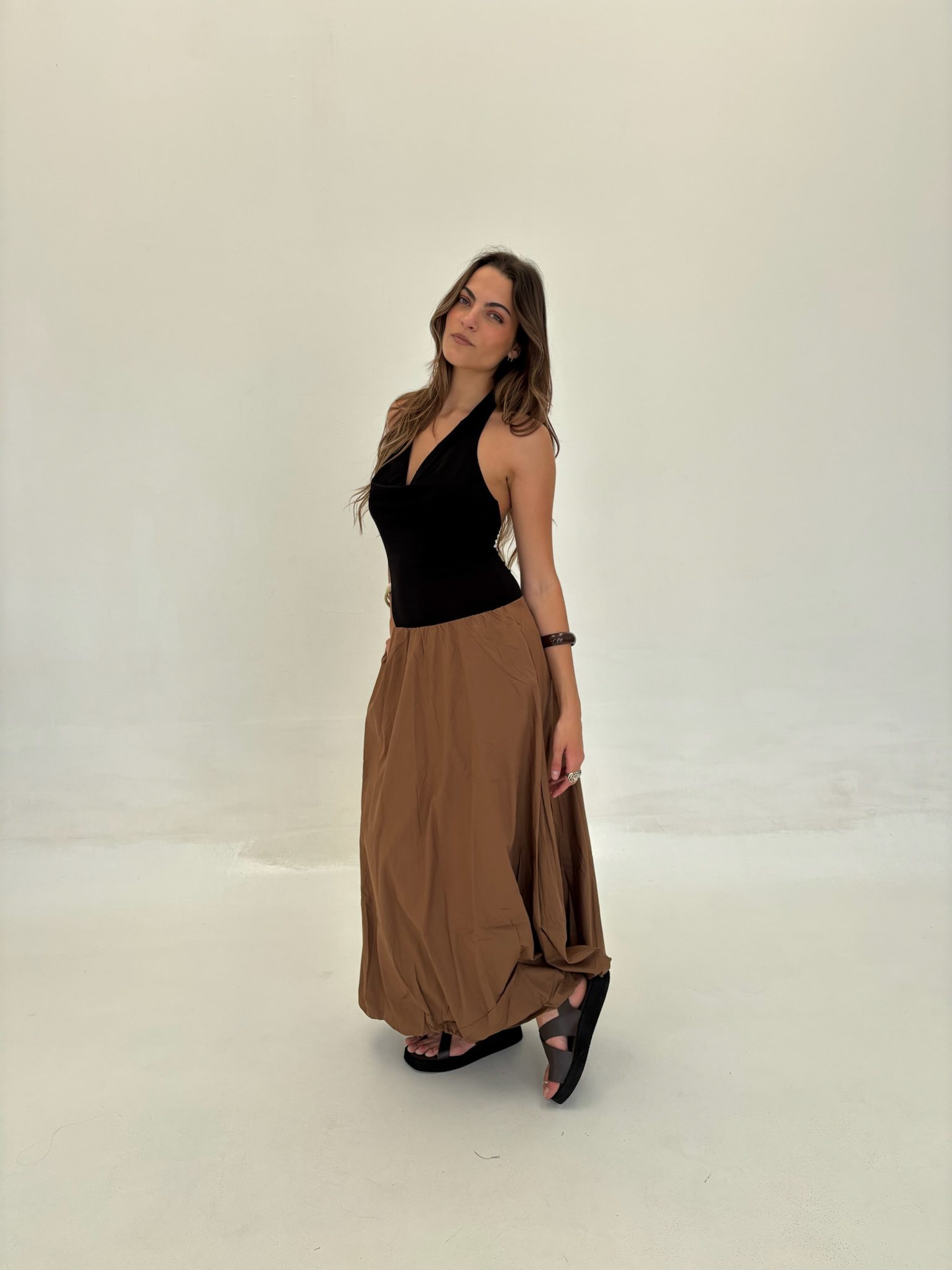 La Falda Baloon Larga es una prenda de diseño amplio con un efecto abullonado en el bajo. Está confeccionada en crepe de punto y su silueta la convierte en una pieza que se adapta tanto a un estilo formal como a un look casual.