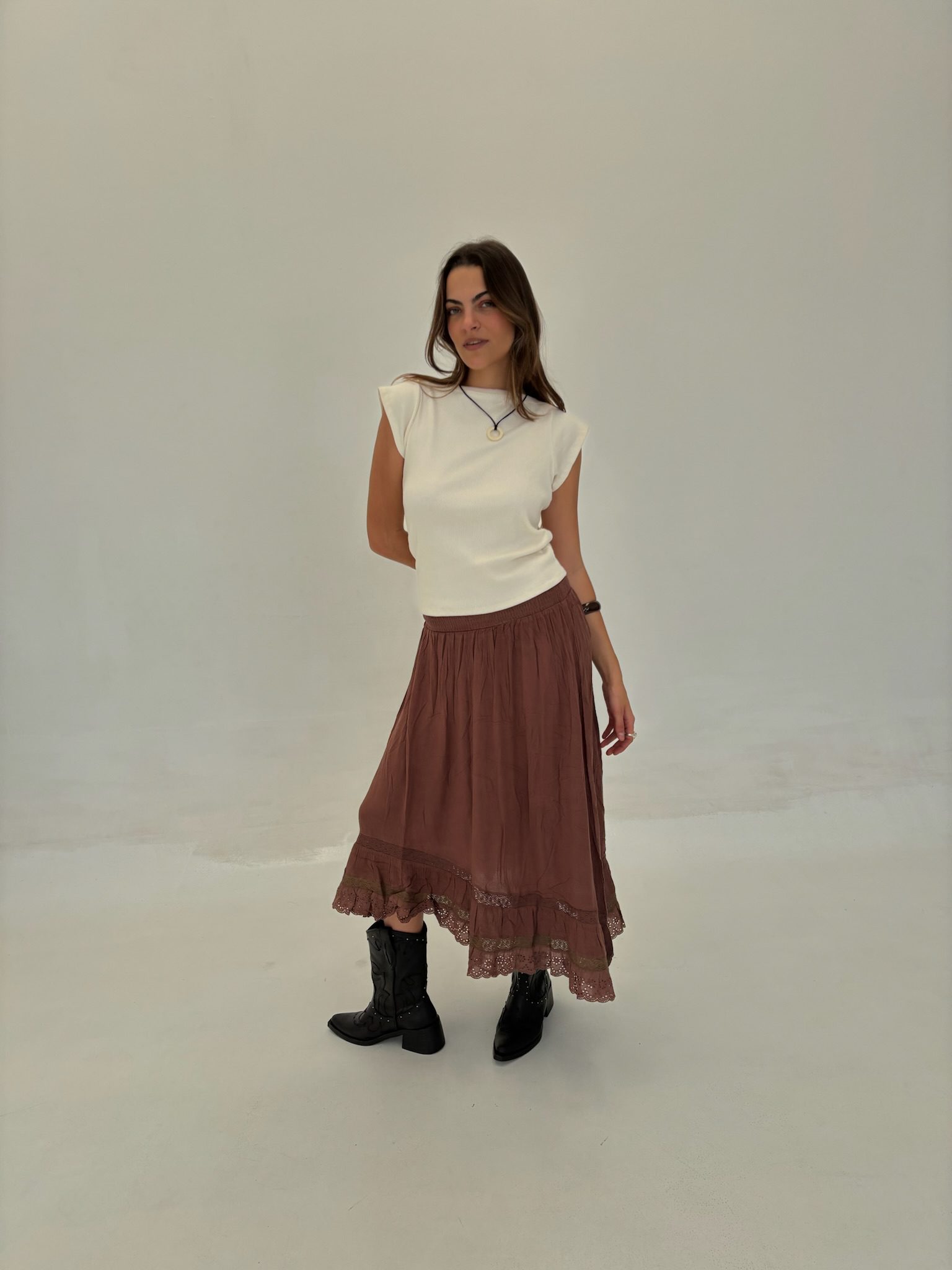 La Falda Bambula es una prenda con un diseño de volados en cascada que le otorgan movimiento y una textura distintiva. Cuenta con una puntilla que decora los bordes de cada volado. Es una prenda versátil, ideal para armar un look casual o un estilo más bohemio.