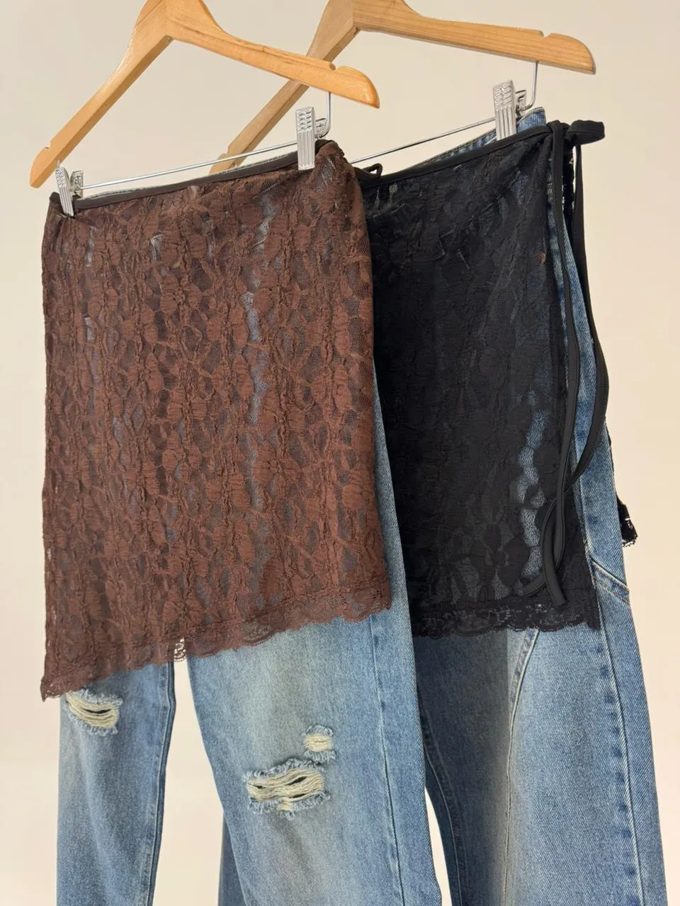 . Una falda de encaje con transparencias y lazos laterales pensada para llevar el layering al siguiente nivel. Usala sobre un jean, sobre un pantalón sastrero o con tu lencería favorita para un look de noche súper dark-romántico.