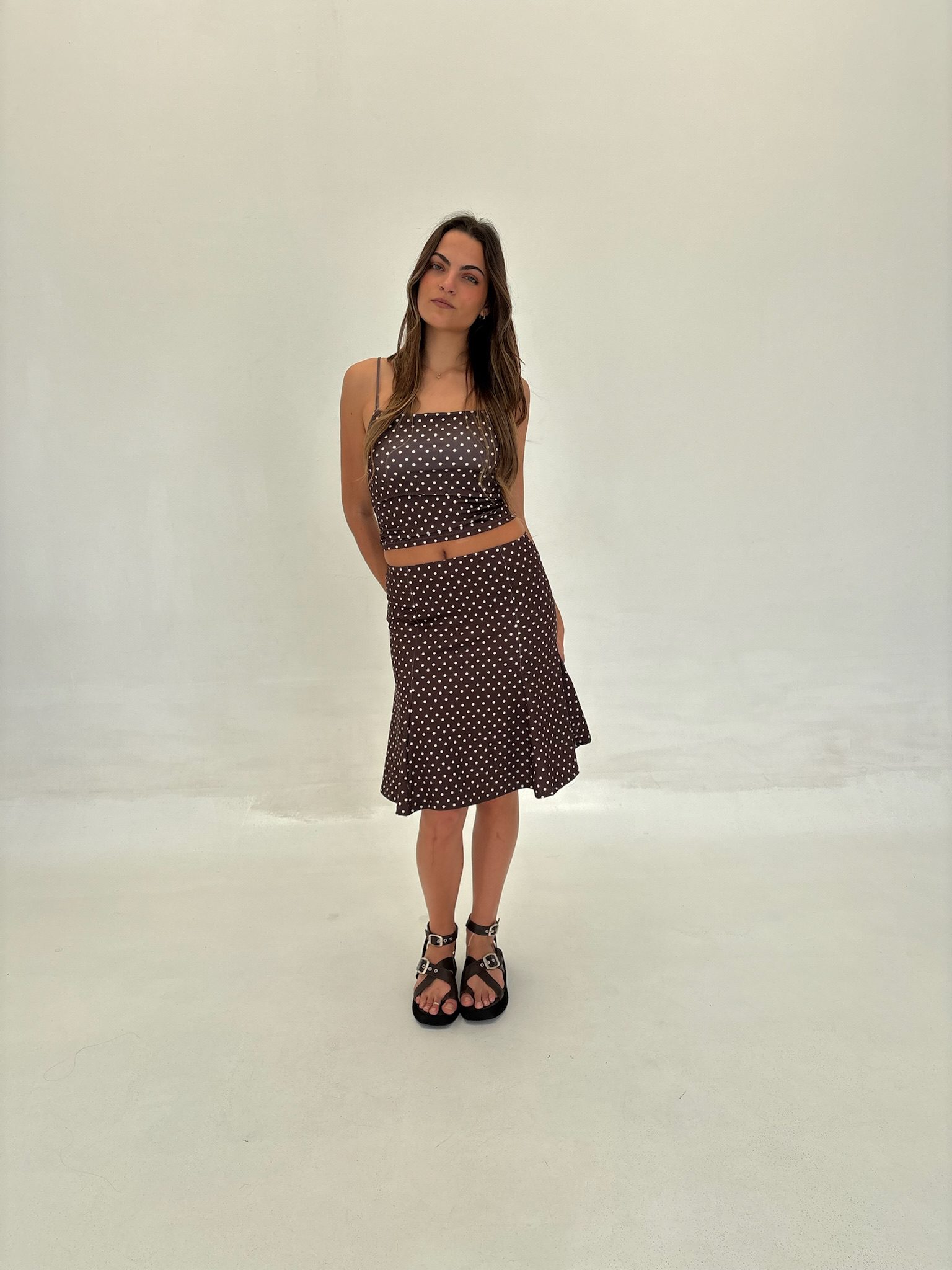 La Falda Midi Lunares es una pieza que evoca romanticismo con un toque moderno y overwild. Confeccionada en una tela suave y fluida, se mueve con cada uno de tus pasos, creando un look lleno de gracia. Su corte midi y el estampado de lunares clásicos la convierten en un básico atemporal, mientras que el detalle de la espalda con top a juego (si se vende en conjunto, si no, se puede mencionar como opción de combinación) le da un aire sexy y audaz.