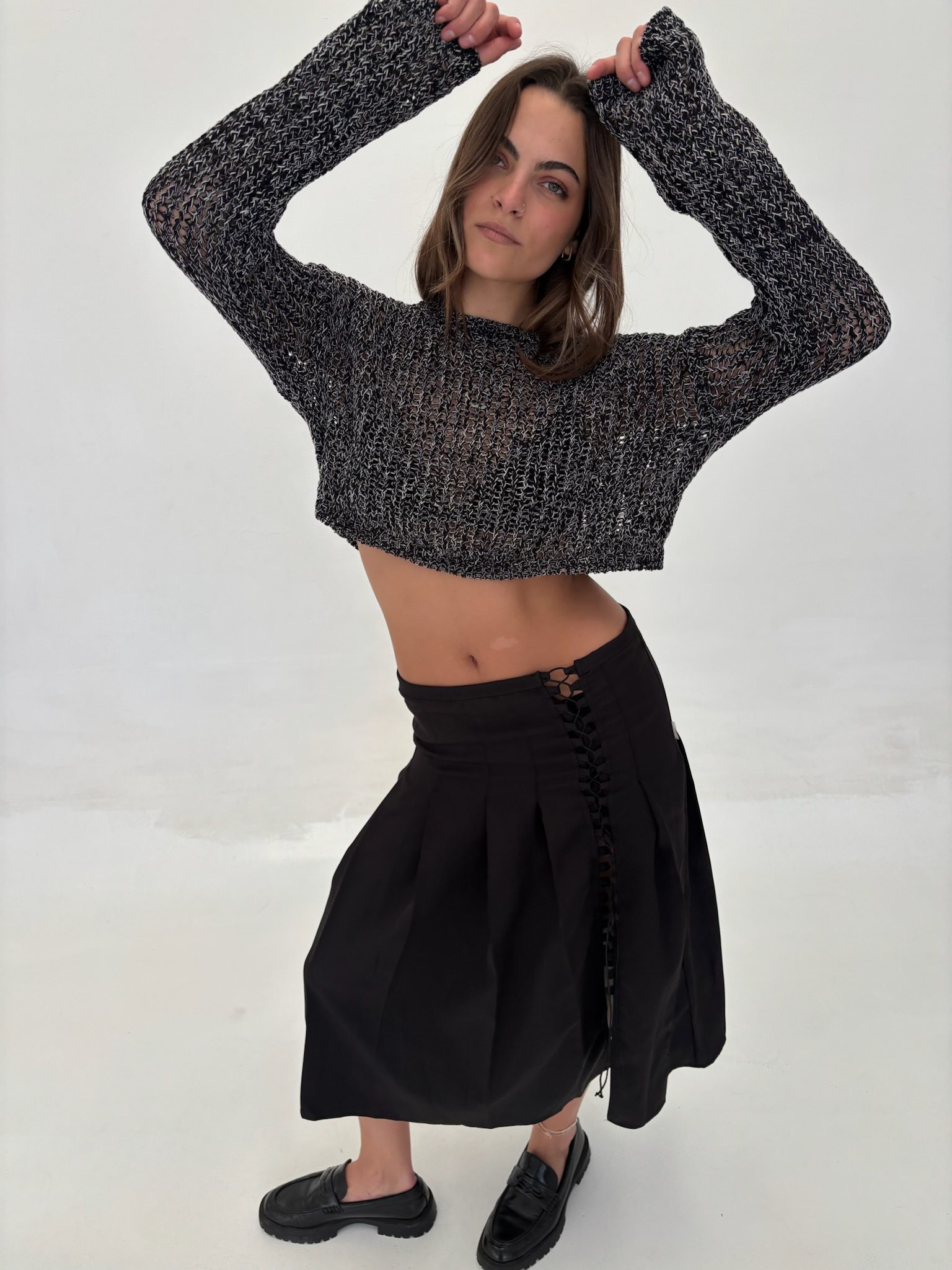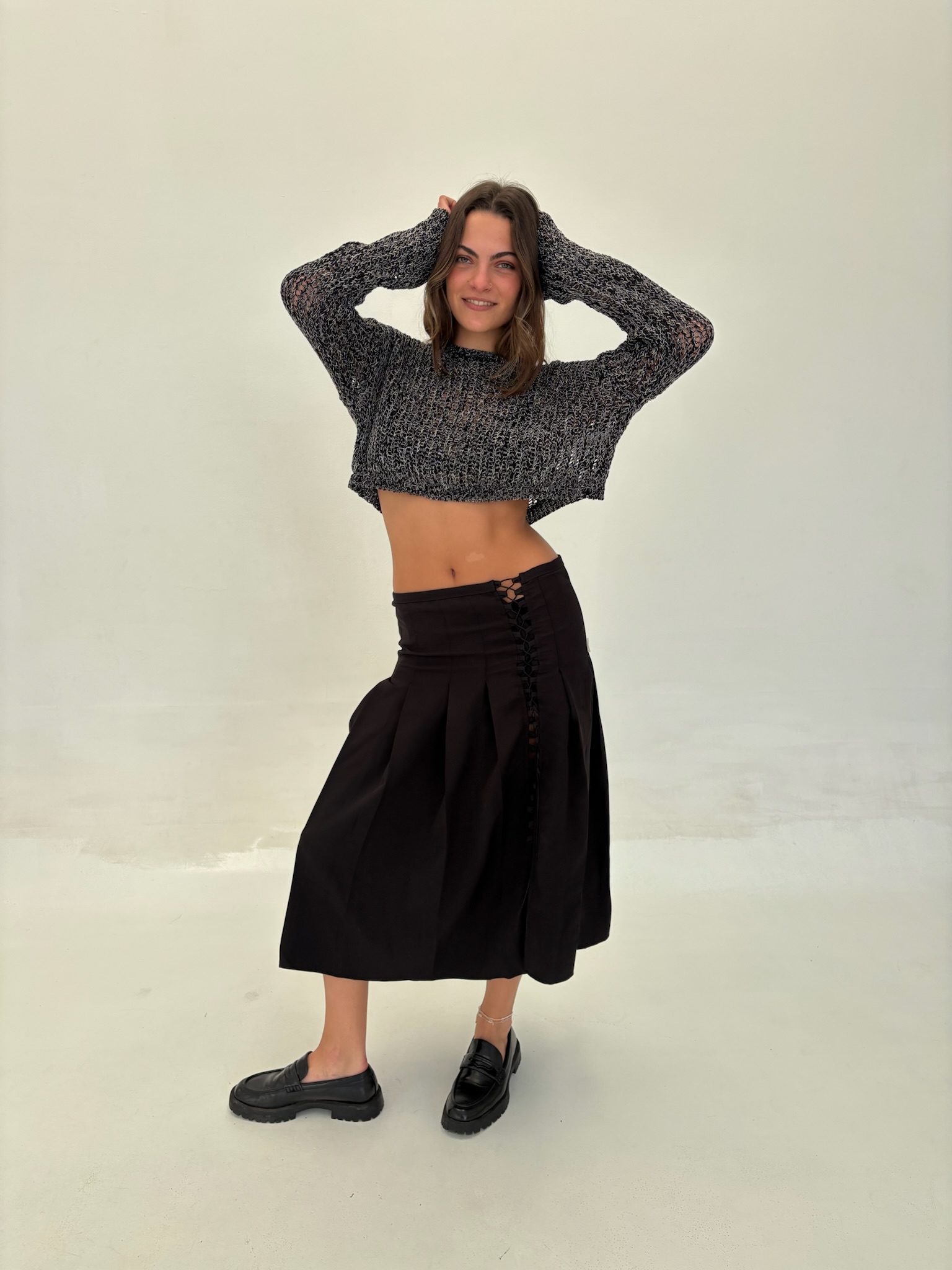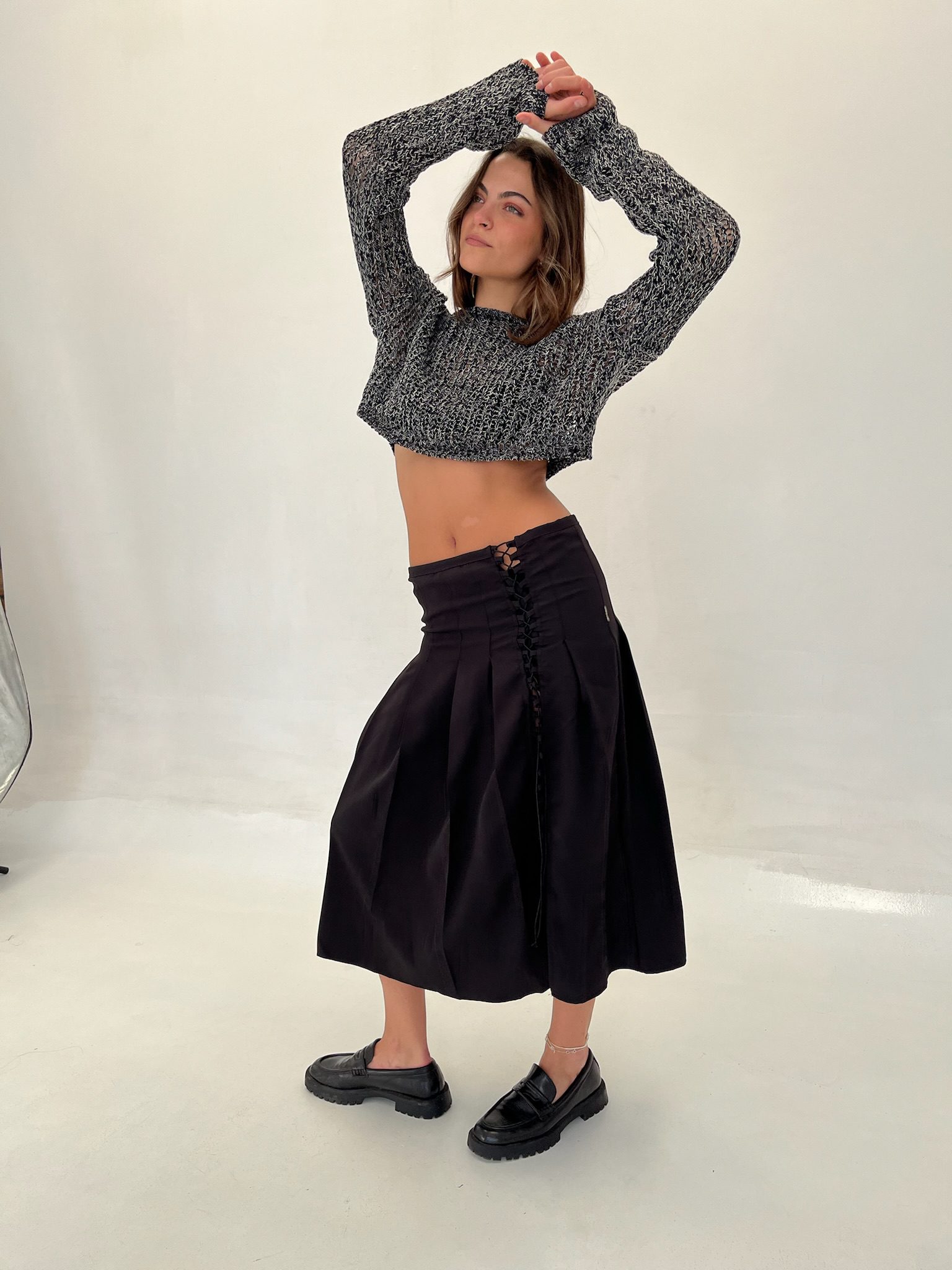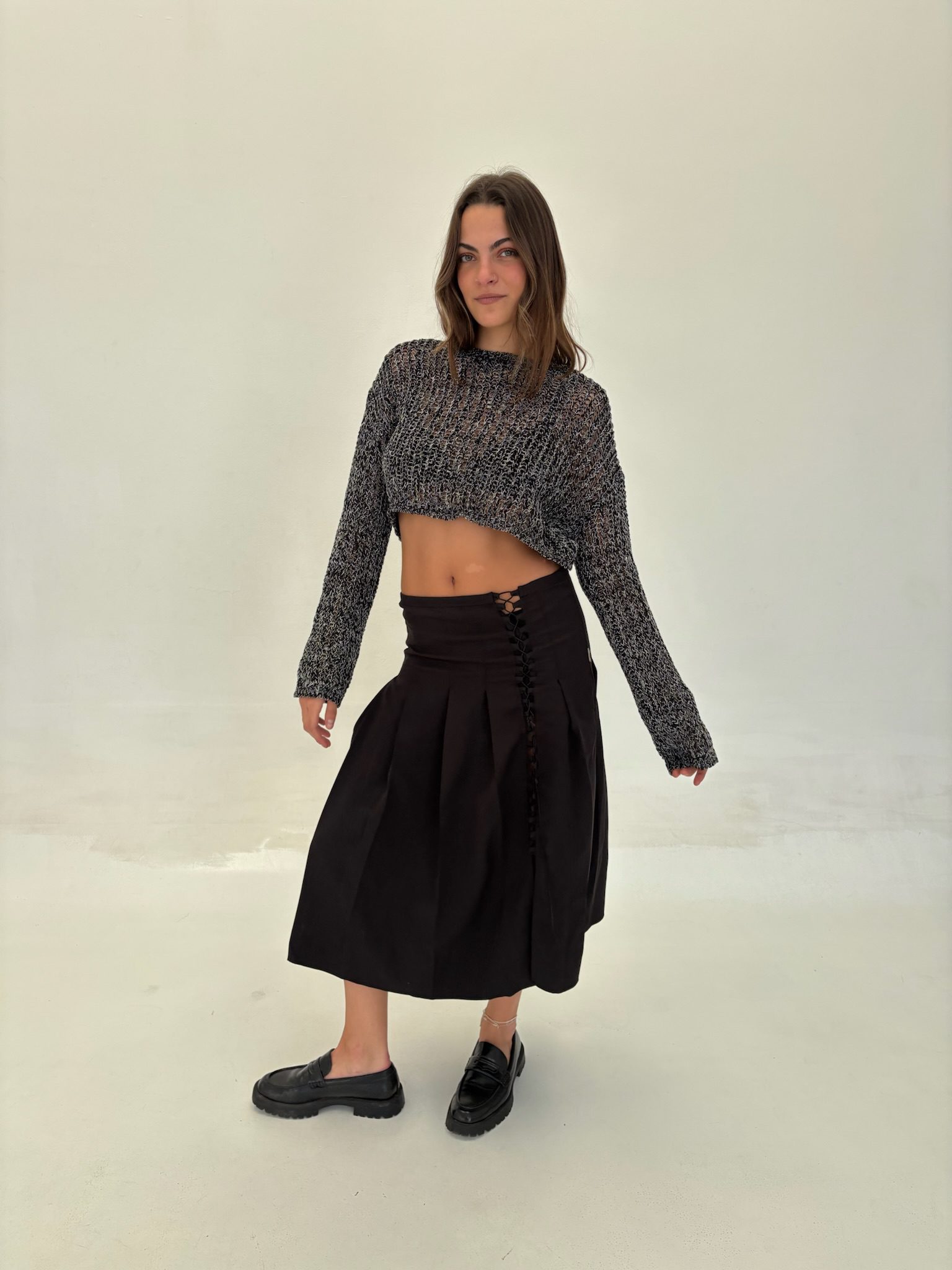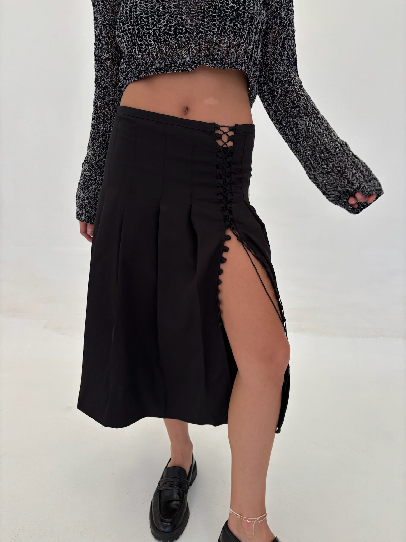 La FALDA MIDI RETORNO es la fusión perfecta entre la sastrería sofisticada y el estilo edgy. Con un elegante corte midi y confeccionada en un tejido liso de excelente caída, su detalle de lazada frontal/lateral tipo corset no solo ajusta, sino que crea un atrevido split. Una prenda de alto impacto que redefine el concepto de falda negra.