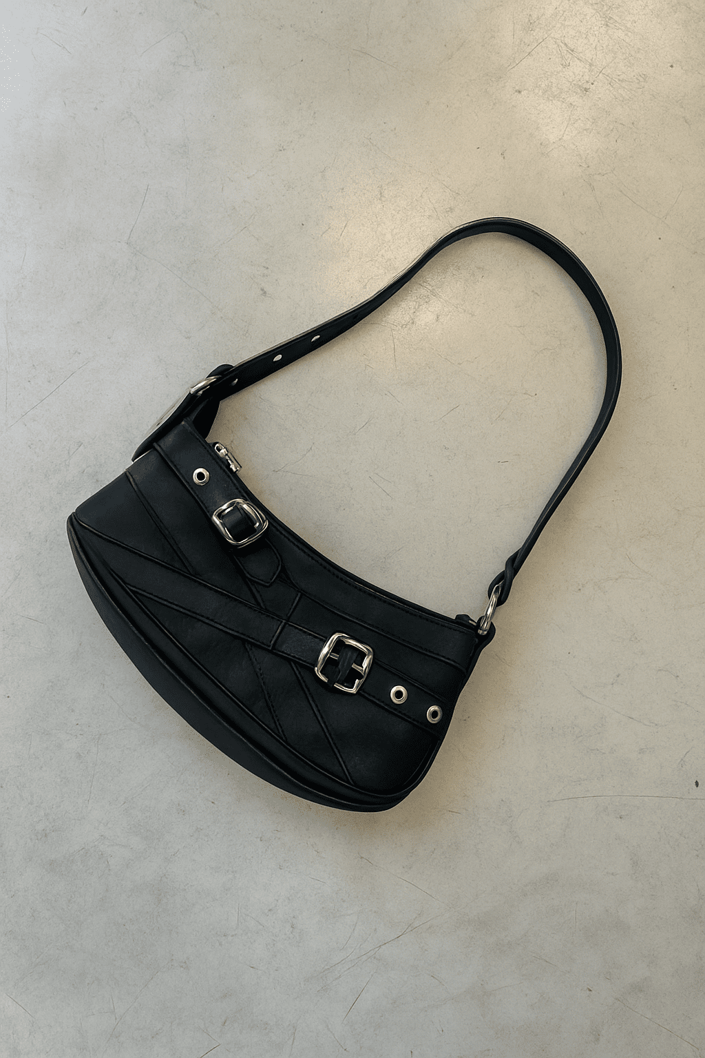 La Mini Cartera es un bolso de hombro de diseño compacto y alargado. Está confeccionada en cuero sintético de color negro y presenta detalles de hebillas decorativas en los costados de la abertura principal. La cartera tiene un asa larga para llevarla al hombro y viene acompañada de un llavero de metal.