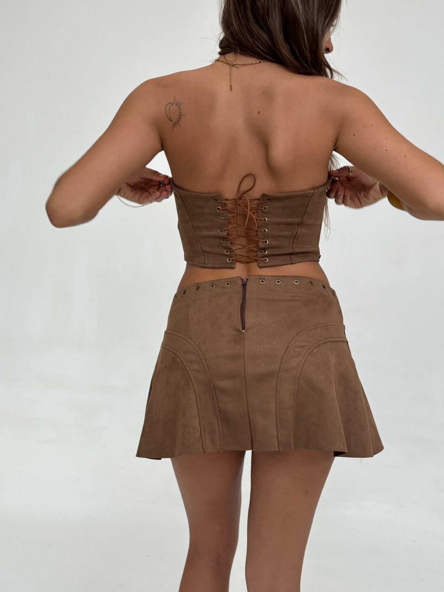 La MINI BRONCA es el conjunto de dos piezas más impactante de la temporada. Confeccionado en gamuza suave, presenta un Top corsé bandeau con lazo ajustable en la espalda y una Mini Falda Skater de tiro bajo. Ambos destacan por los detalles de tachas de metal que enmarcan la silueta, dándole un toque edgy y Western moderno.
