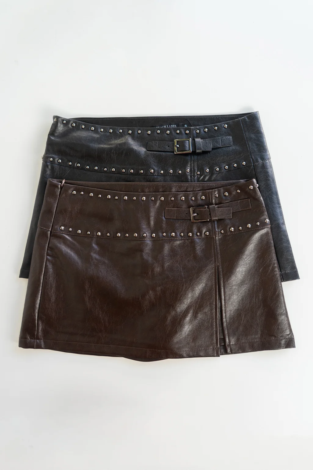 Confeccionada en cuero ecológico de alta calidad con un acabado semibrillante, esta mini destaca por su doble hilera de micro tachas plateadas y su detalle de hebilla lateral que refuerza su estética rebelde. Su corte evasé y la pequeña abertura frontal le dan movilidad y un toque audaz, convirtiéndola en el complemento perfecto para nuestros sweaters oversized o camisas entalladas.