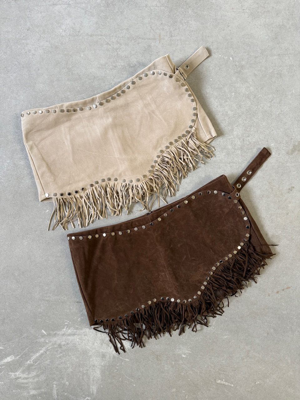 Mini falda de corte wrap (cruzado) con textura gamuzada (suede), perfecta para un look festivalero y audaz. Destaca por su diseño asimétrico con flecos largos y fluidos en el bajo, que añaden movimiento. Adornada con tachas metálicas plateadas que bordean el corte, realzando el estilo rock-boho. Se cierra con un strap ajustable en el lateral.