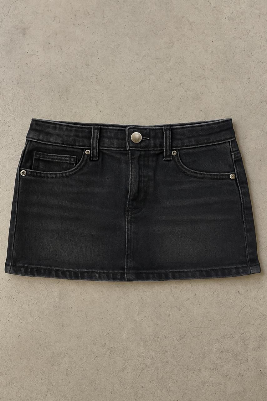 Diseñada para un calce tiro bajo que alarga la figura y define la silueta. Esta mini falda está confeccionada en denim de color negro intenso, garantizando un fit impecable.