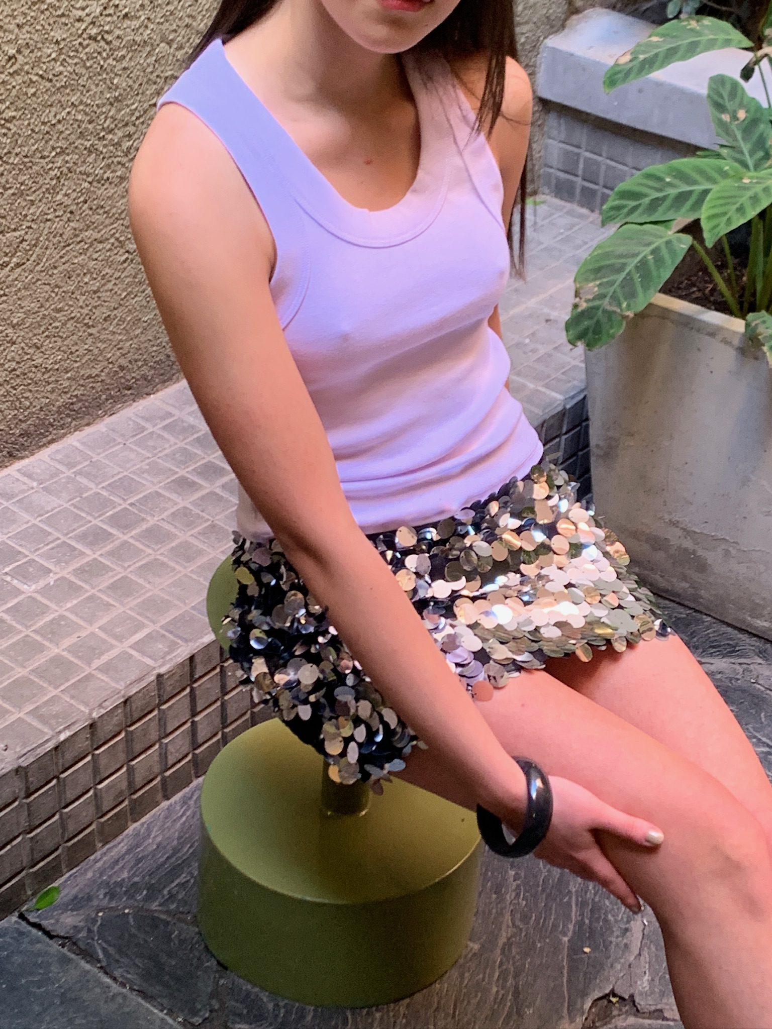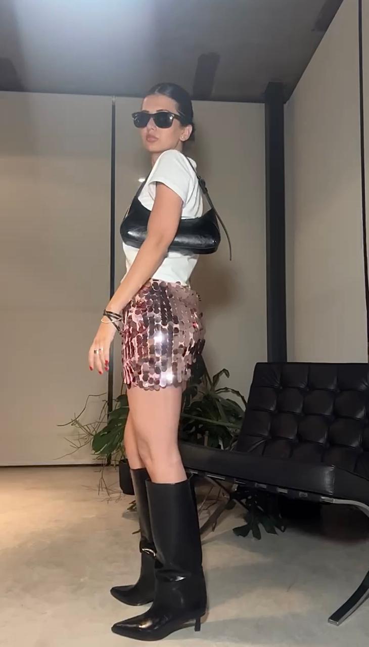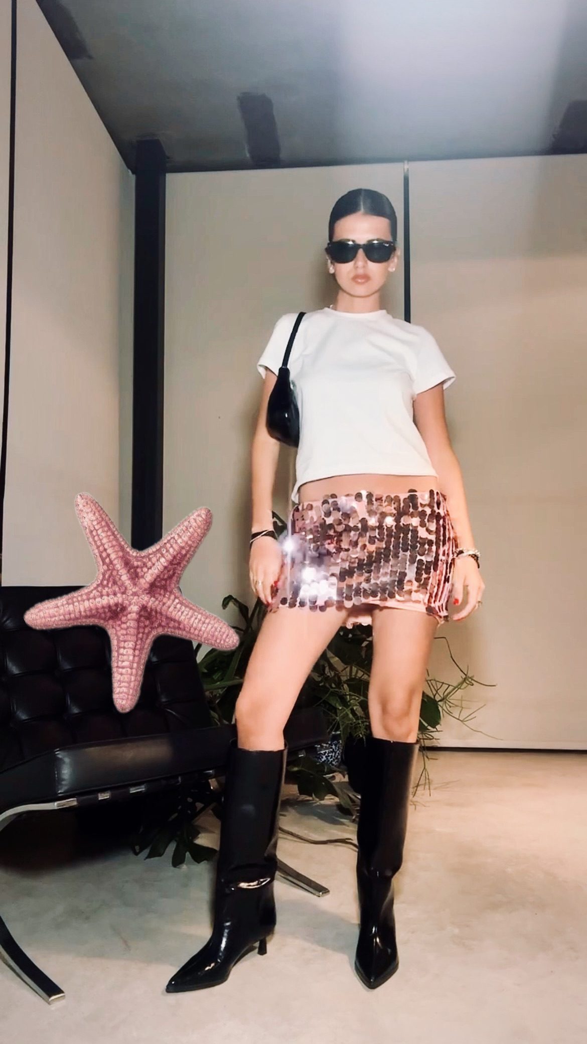 Su nombre lo dice todo: esta pollera te convierte en una bola de espejos andante. Confeccionada con una base ajustada, está recubierta de grandes lentejuelas circulares o piezas reflectantes que capturan y dispersan la luz con cada movimiento, creando un efecto dinámico y espectacular.