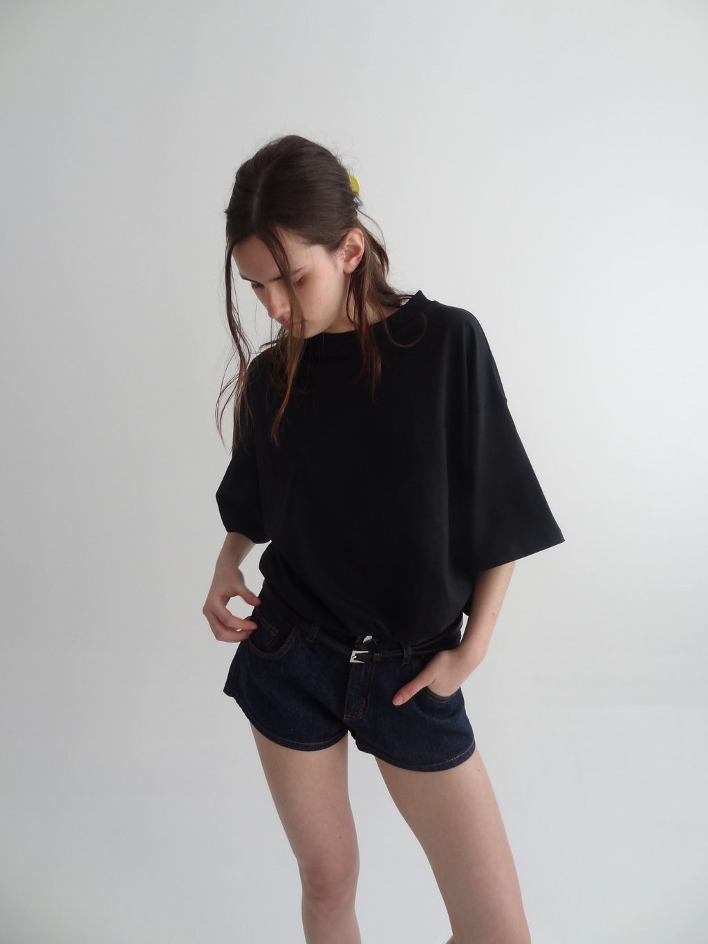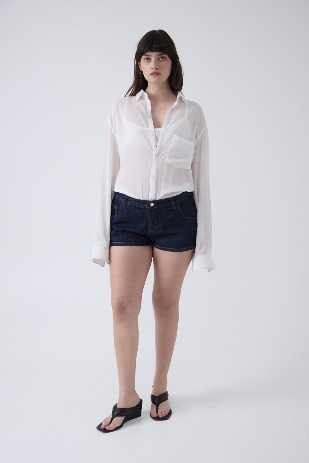 Short de denim rígido de 13 oz, tiro bajo/medio, con cuatro bolsillos y terminación con dobladillo. Silueta clásica y estructura firme.