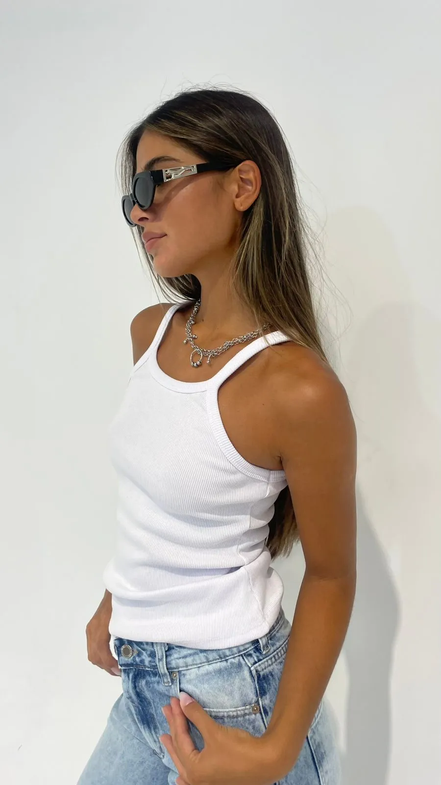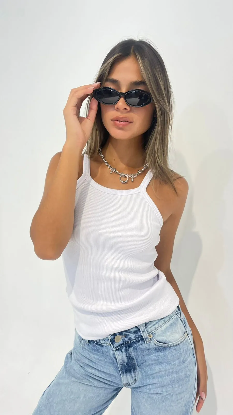 Musculosa de diseño clásico y minimalista confeccionada en morley premium de algodón con elastano. Presenta un escote redondo profundo y breteles finos que aportan delicadeza y frescura al diseño. Su calce entallado se adapta cómodamente al cuerpo, convirtiéndola en un básico indispensable y versátil para usar como prenda única en días cálidos o como base de cualquier look en capas.