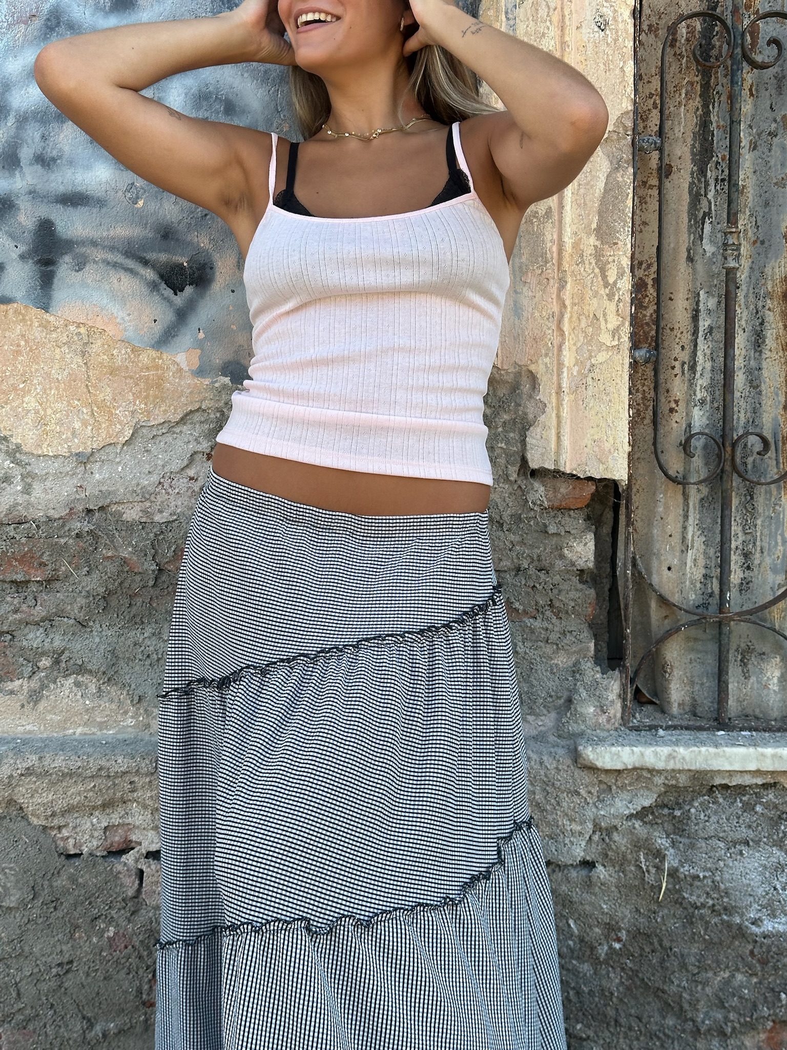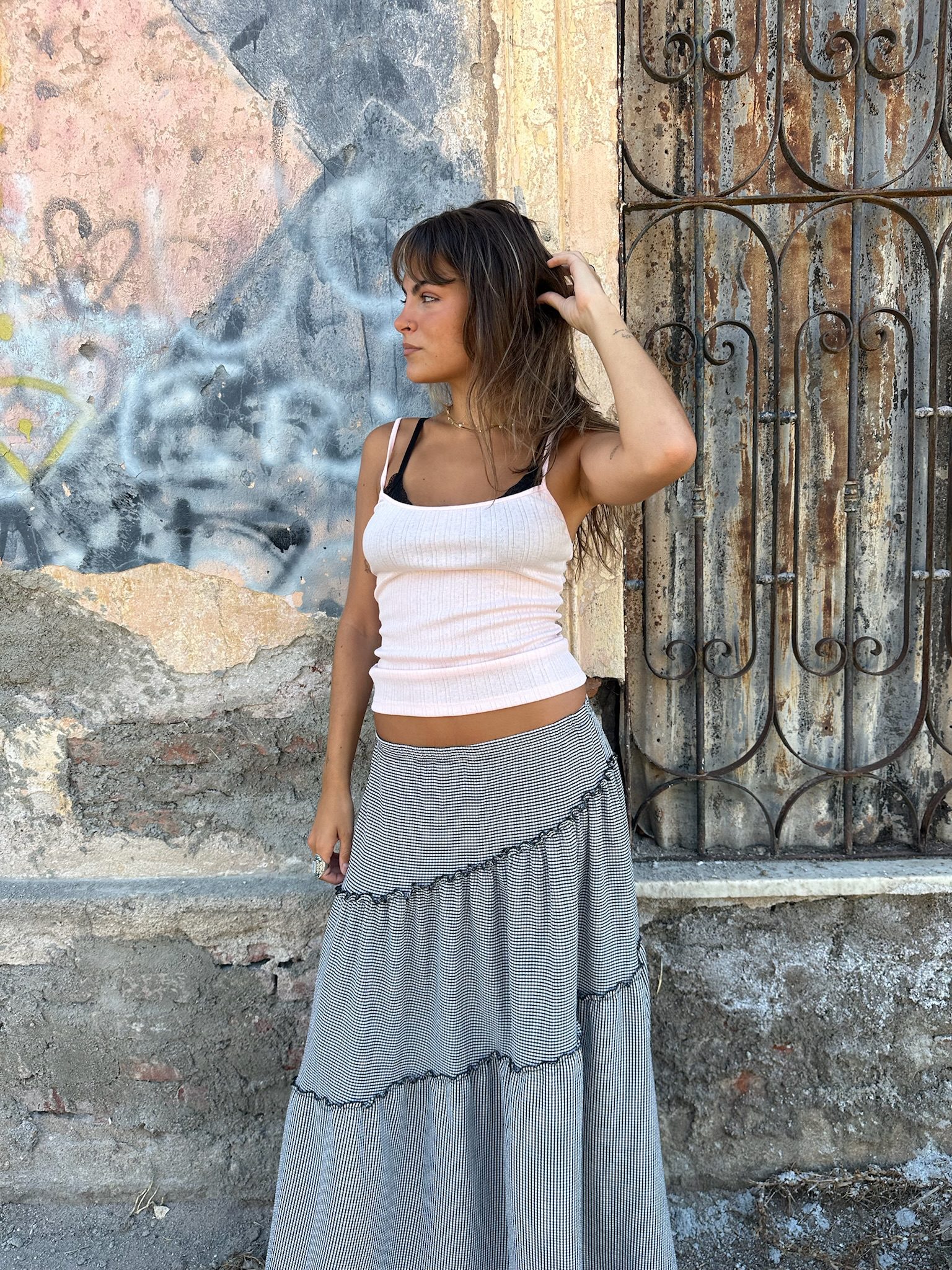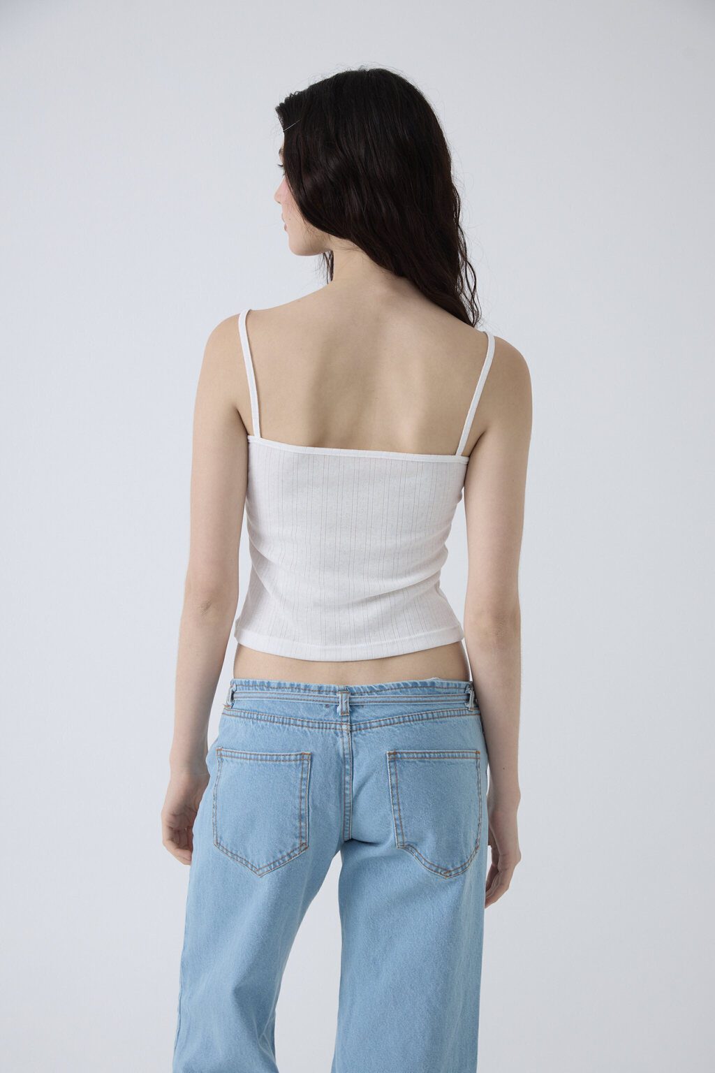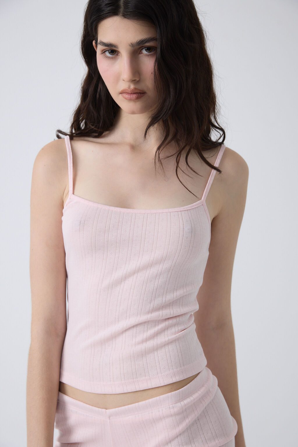 Musculosa tank de tiras finas en rib calado 100% algodón. Suave, liviana y parte de la cápsula Naked.