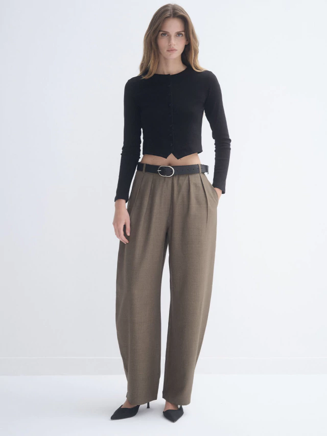 Pantalón barrel con dos pinzas, elástico en la espalda y bolsillo con tapa no funcional en la espalda.