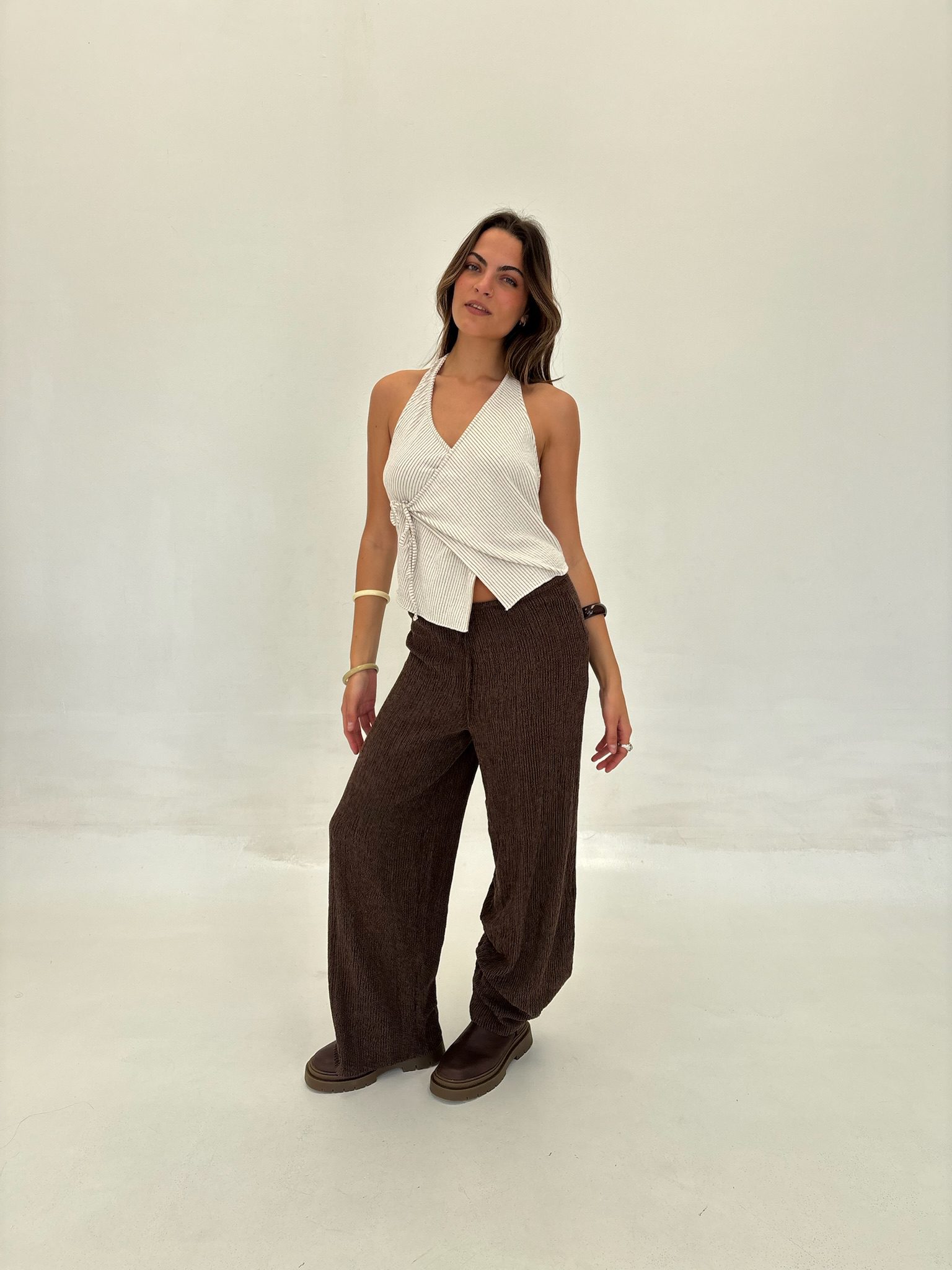 Podés combinarlo de mil maneras. Para un look relajado, usalo con un top básico o la Camisa Ojalillos para un outfit atrevido. Para un estilo más chic, combinalo con un top ajustado y sandalias de tiras. El color neutro te permite jugar con prendas y accesorios de todos los colores, haciendo de este pantalón un básico versátil en tu armario. Es una prenda que te invita a la creatividad y a crear looks que son pura expresión de tu estilo.
