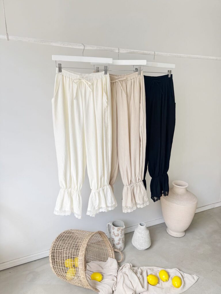 Pantalón corte aladin de tela liviana, ideal para el verano o looks relajados. Cuenta con elástico en la cintura y terminación en puntilla con bordado calado en los tobillos, que le da un toque boho chic y delicado. Súper fresco, con bolsillos y cordón.