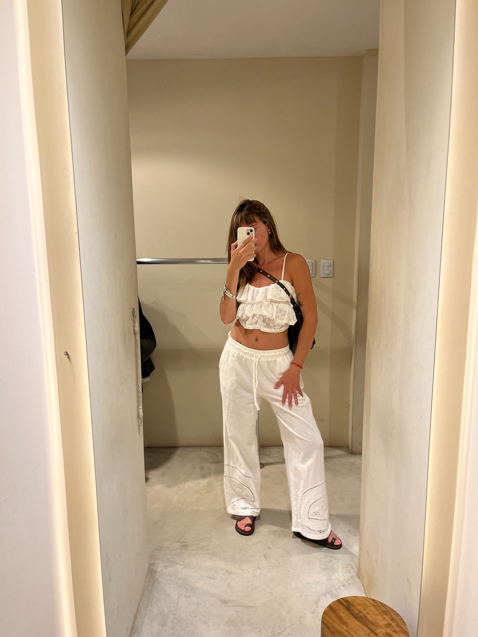 Pantalón de lino blanco con calce holgado y cintura elastizada con cordón ajustable. El diseño presenta un detalle de calado y bordado a la altura de los tobillos. Una prenda fresca y liviana, ideal para looks de verano y boho chic