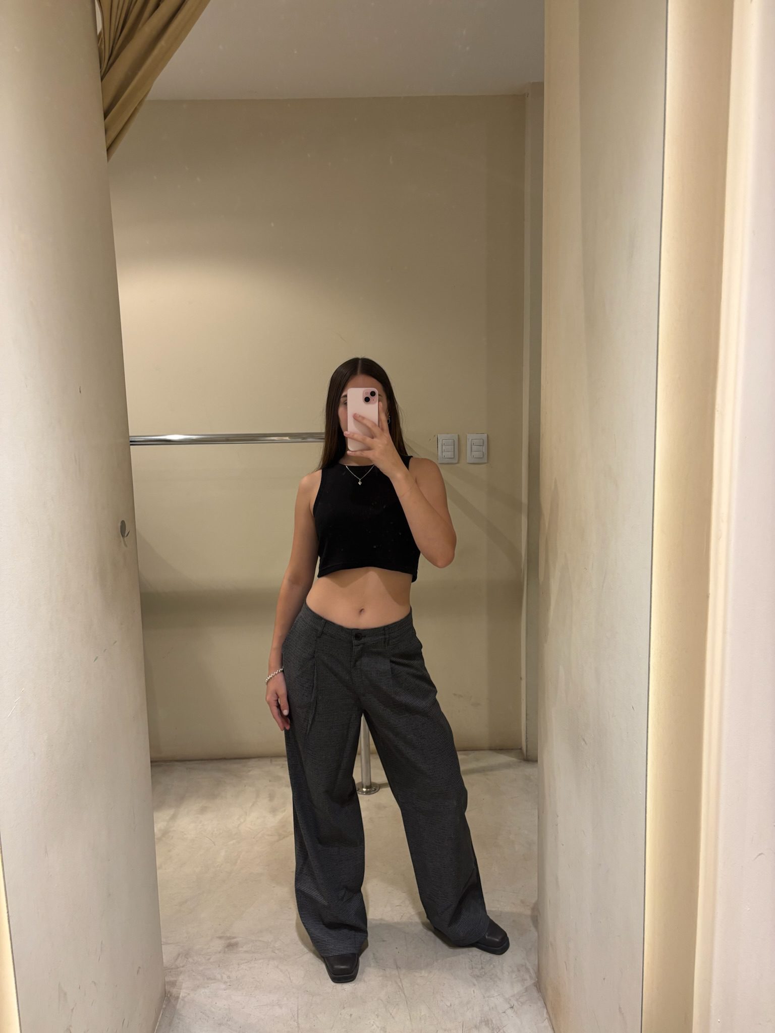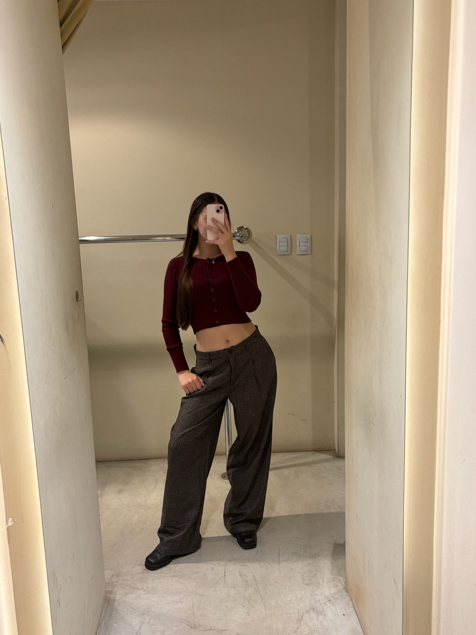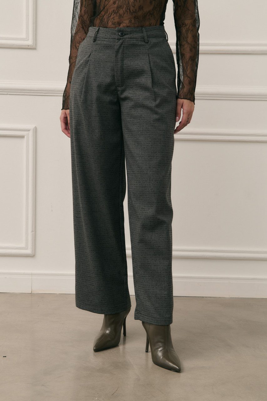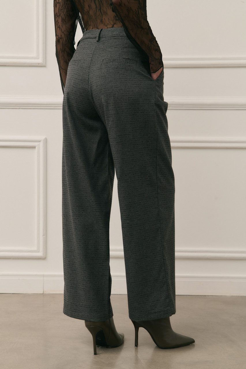 Pantalón de corte recto y tiro alto/medio con estampa clásica cuadrillé. Una prenda estructurada y atemporal que combina la elegancia del sastrero con un estilo urbano. Posee pinzas delanteras para un calce perfecto y presillas para cinturón.