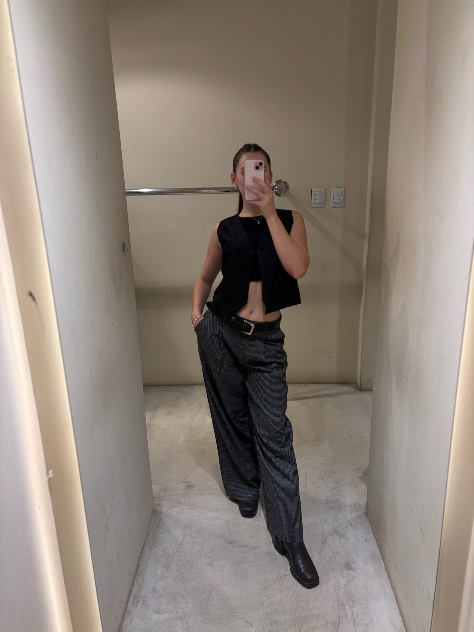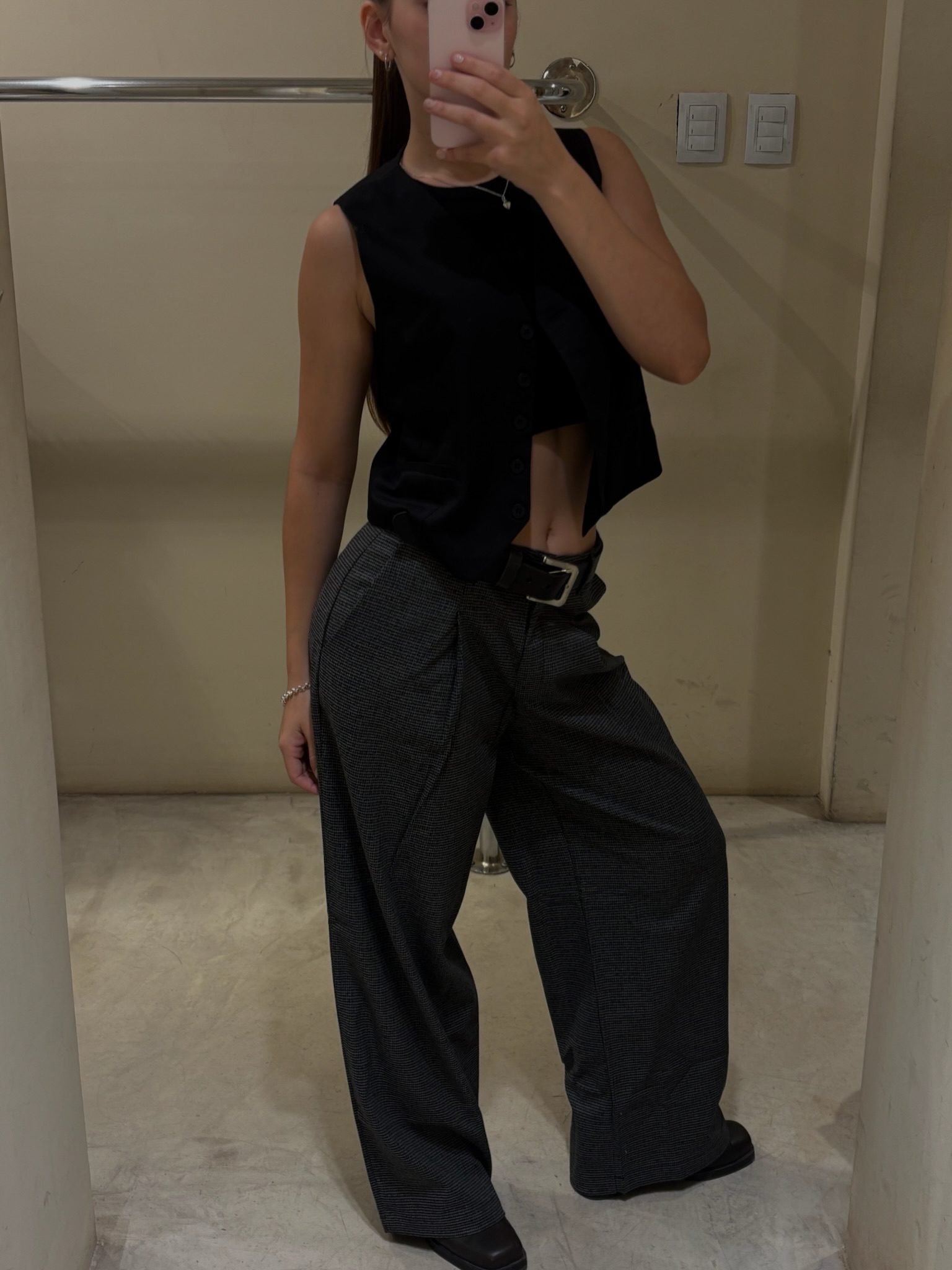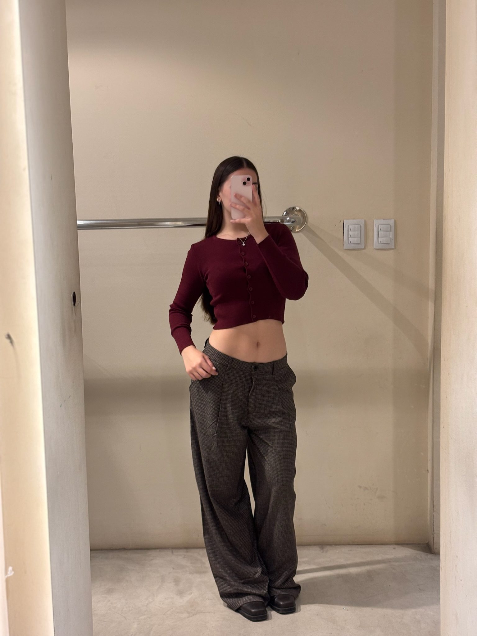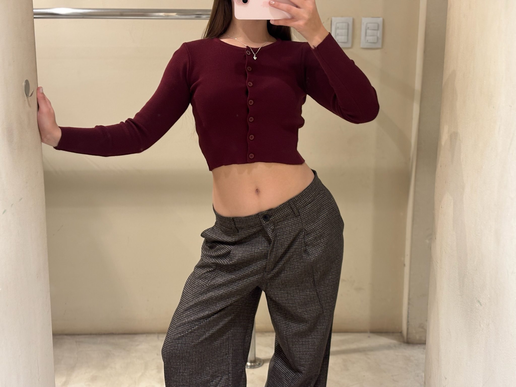 Pantalón de corte recto y tiro alto/medio con estampa clásica cuadrillé. Una prenda estructurada y atemporal que combina la elegancia del sastrero con un estilo urbano. Posee pinzas delanteras para un calce perfecto y presillas para cinturón.
