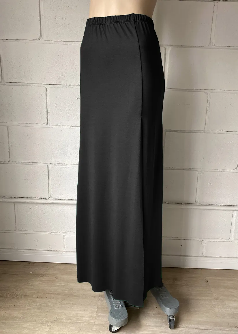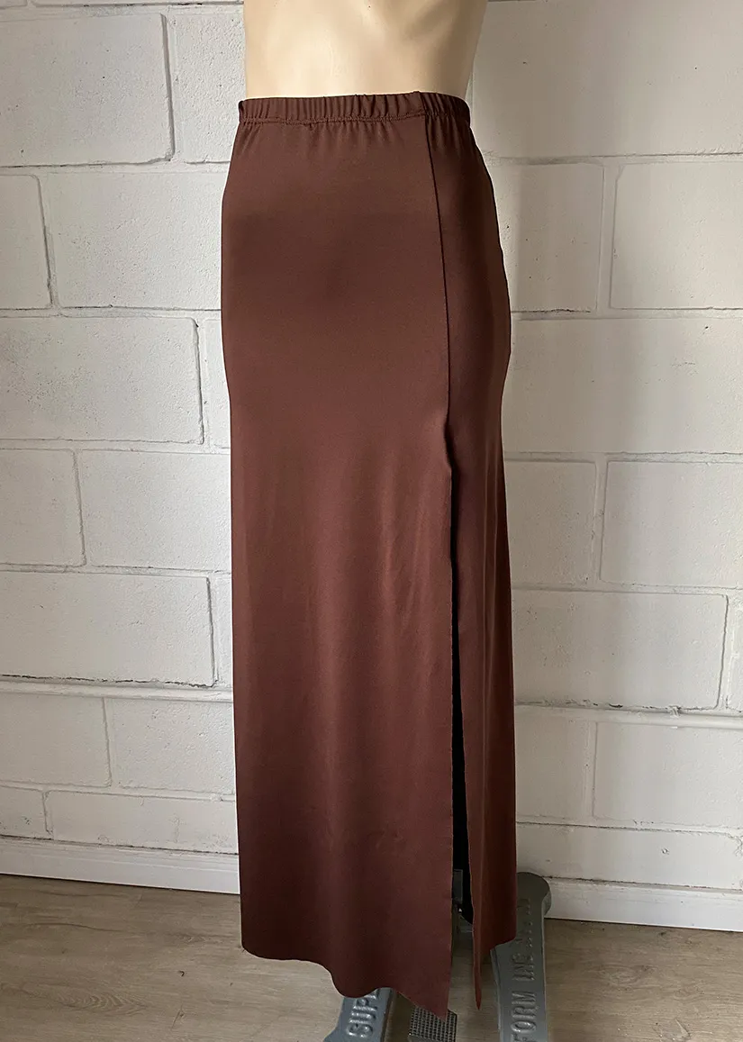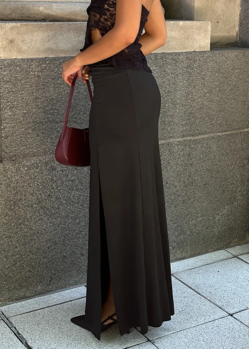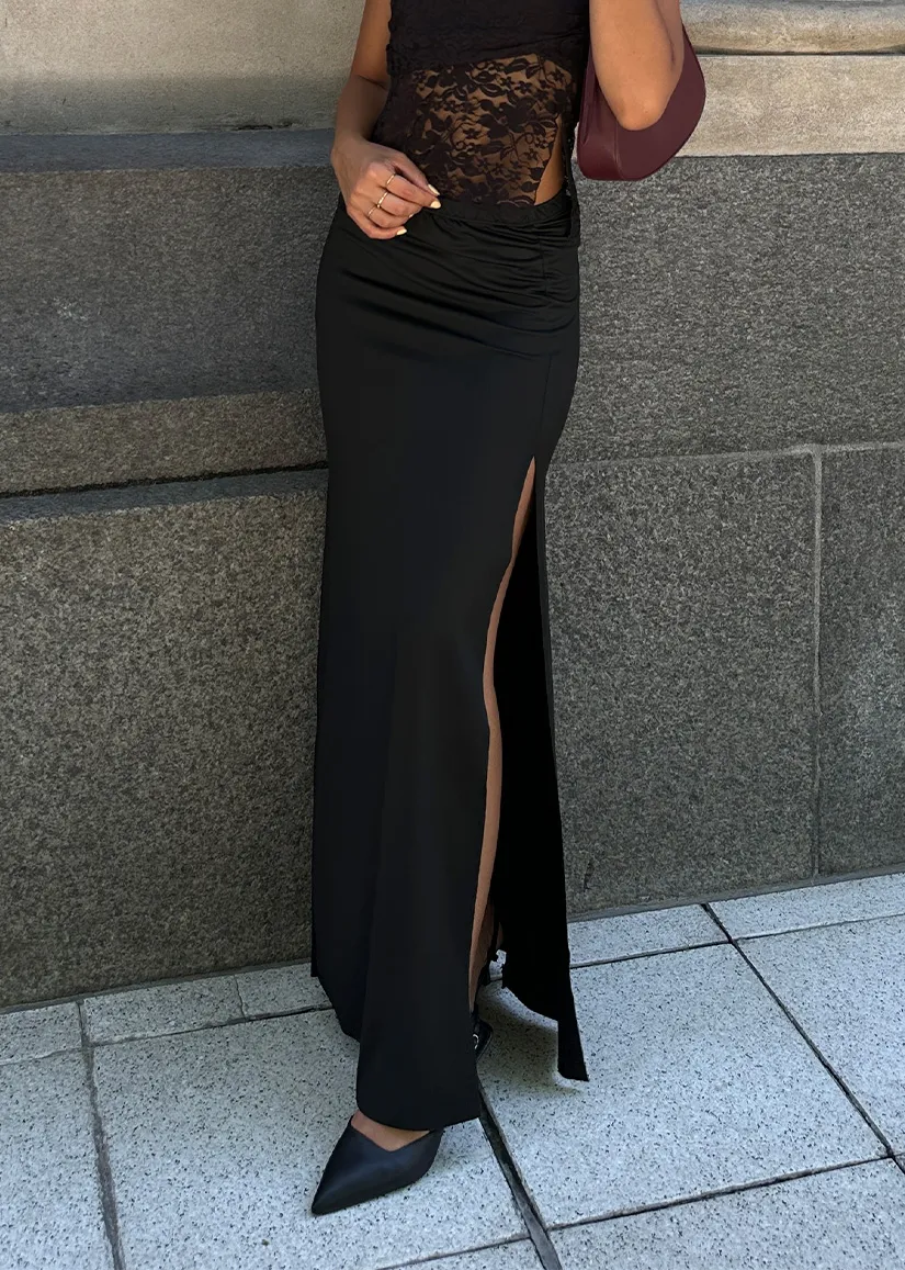 Confeccionada en un tejido micro liso de alta calidad, esta pollera maxi se ajusta sutilmente a tu figura, brindando una caída impecable y un tacto suave. Su diseño se destaca por un tajo alto al frente que no solo le confiere un aire sensual y moderno, sino que también permite una total libertad de movimiento. El fruncido delicado en un lateral de la cintura añade un detalle de diseño que realza la silueta.