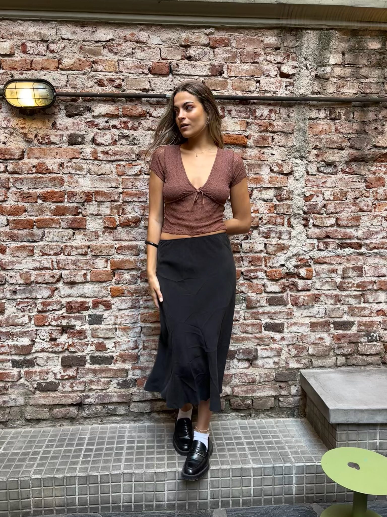El diseño simple (corte al bies o corte A) y la cintura cómoda hacen de esta pollera un básico de alta rotación, ideal para crear un contraste de texturas con los tops de encaje o lentejuelas de la colección.
