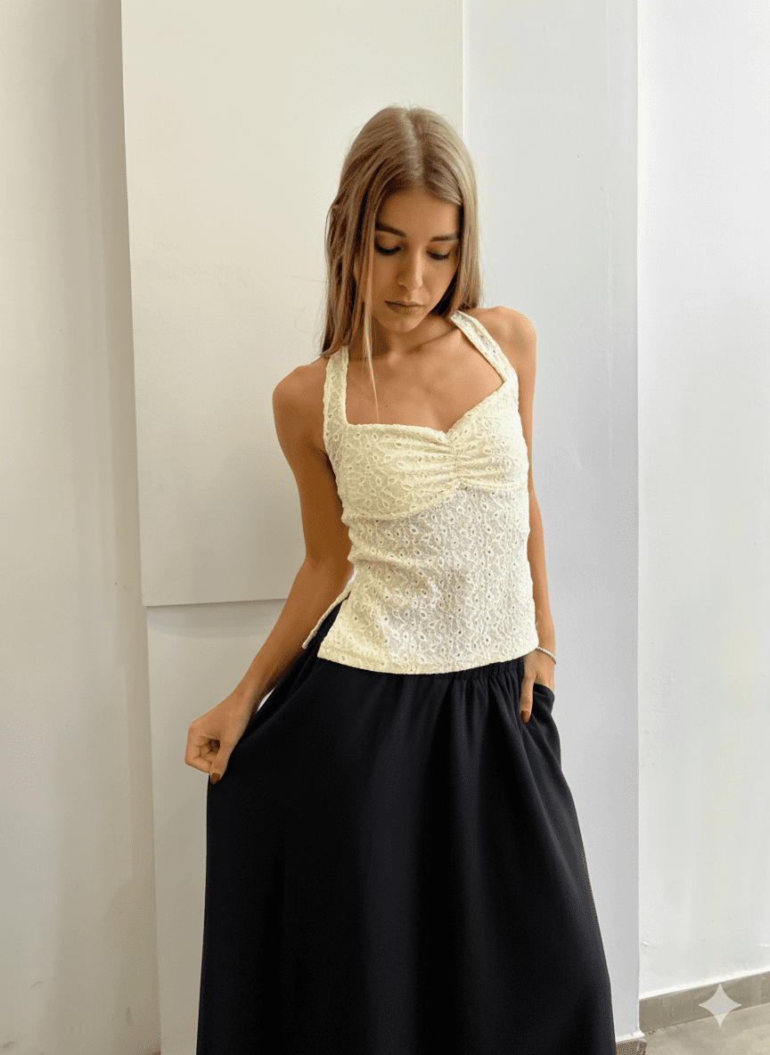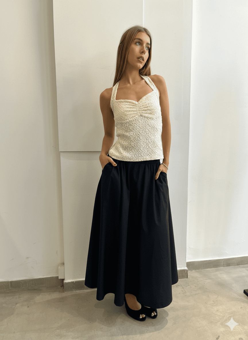 La POLLERA SANTORINI es una prenda de diseño maxi, confeccionada en poplin de algodón 100%. Su principal característica es el gran volumen y caída, ofreciendo una silueta dramática y cómoda. Incluye bolsillos laterales funcionales y un elástico/cierre en la cintura para un ajuste perfecto.
