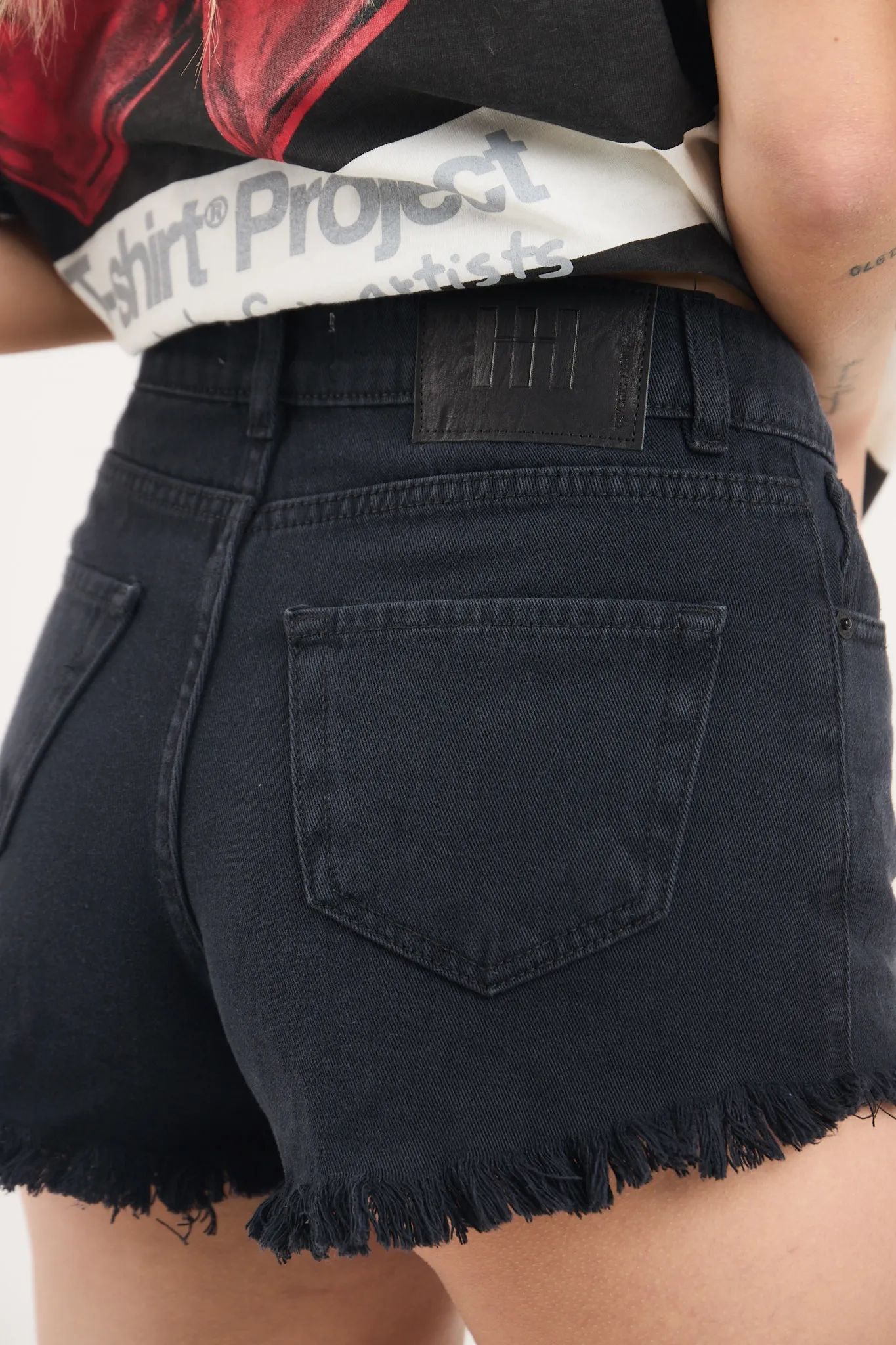 Un short con un corte que estiliza al máximo: el High Waist (Tiro Alto), que define la cintura y alarga las piernas. Confeccionado en denim Stone Black (negro/gris oscuro desgastado) de jean 100% algodón con leve lycra para un fit duradero.