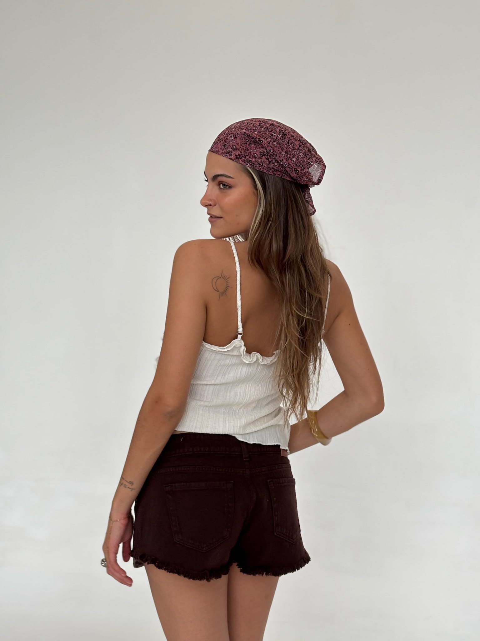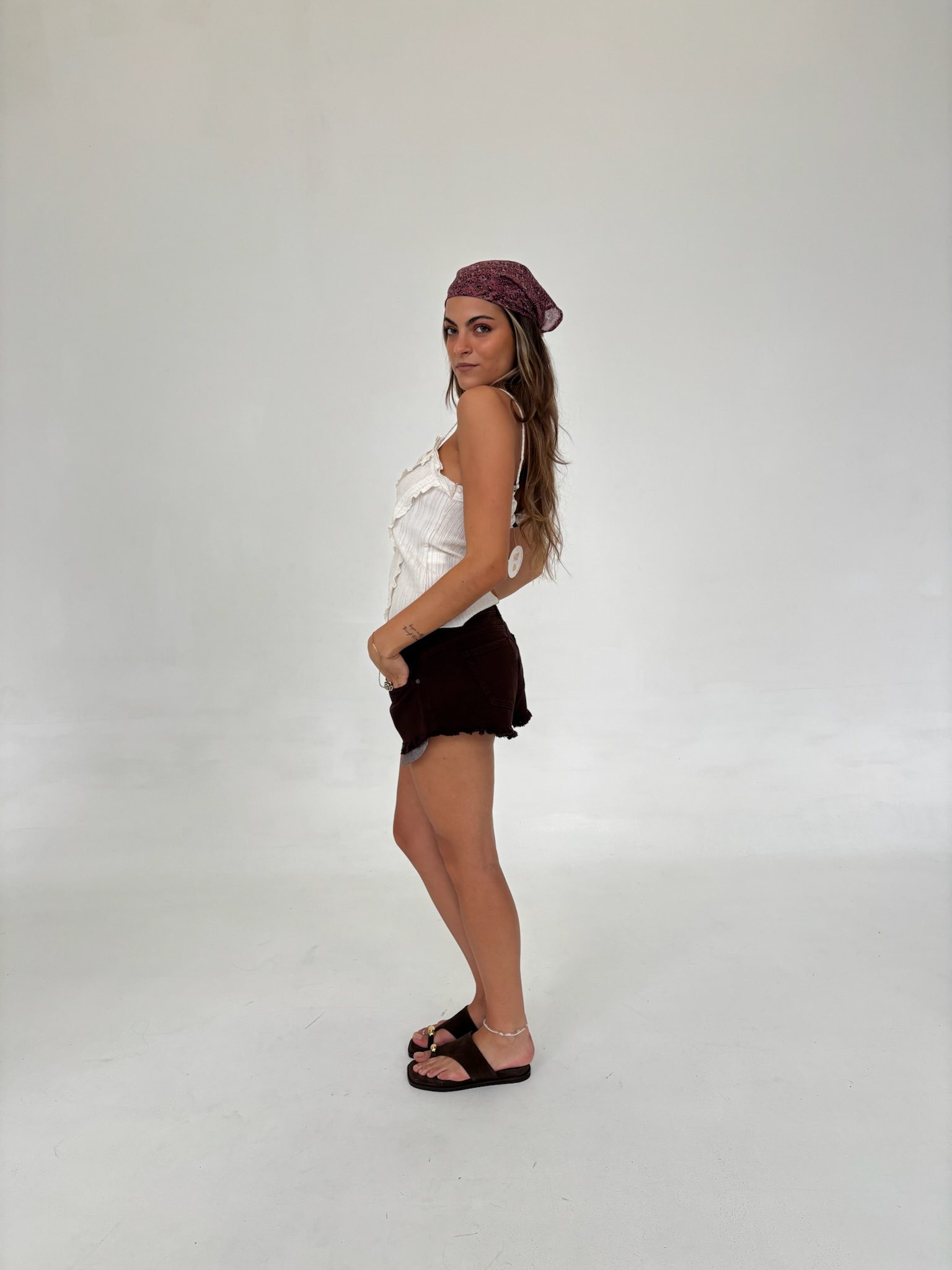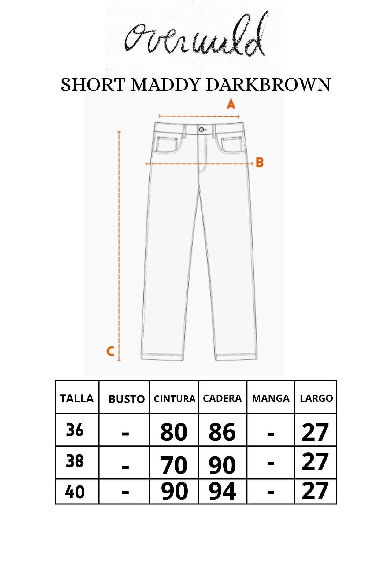 El SHORT MADDY DARKBROWN es la pieza statement inspirada en el resurgimiento del tiro bajo. Su color marrón oscuro le da una base sofisticada, contrastando con el atrevido bajo desflecado y la sutil revelación del reverso gris de la tela. Un mini short imprescindible para la temporada.