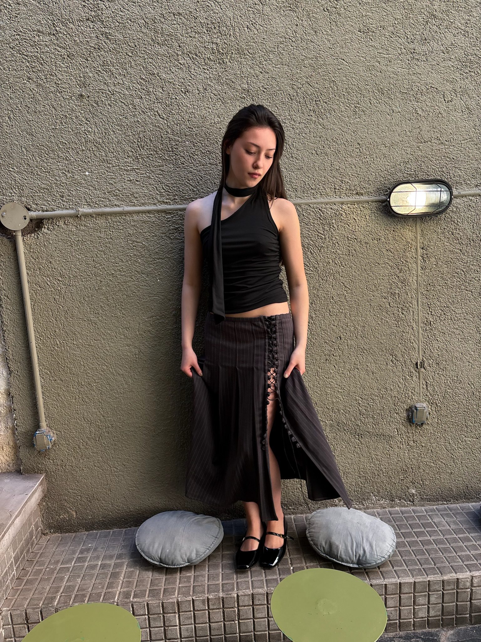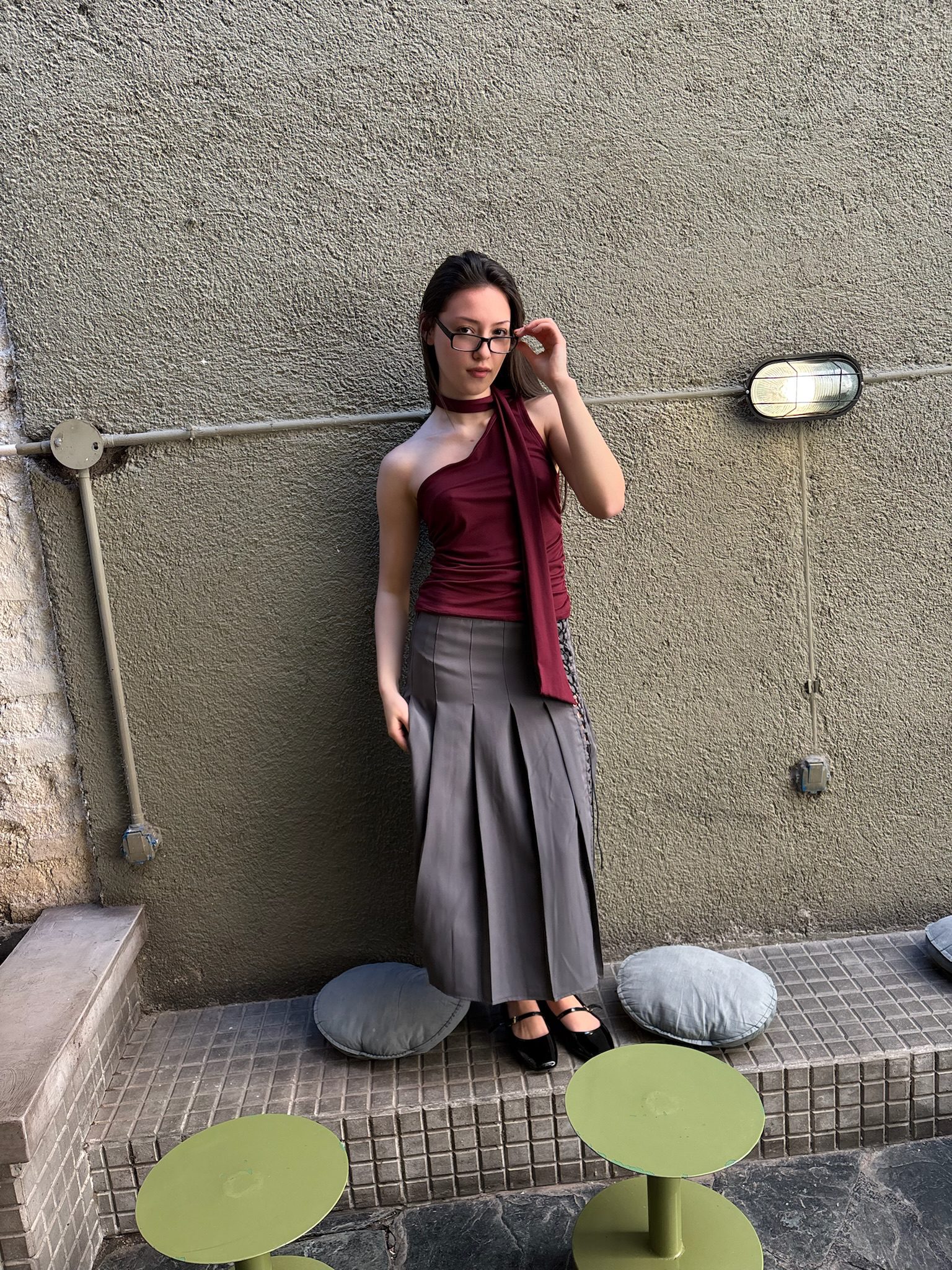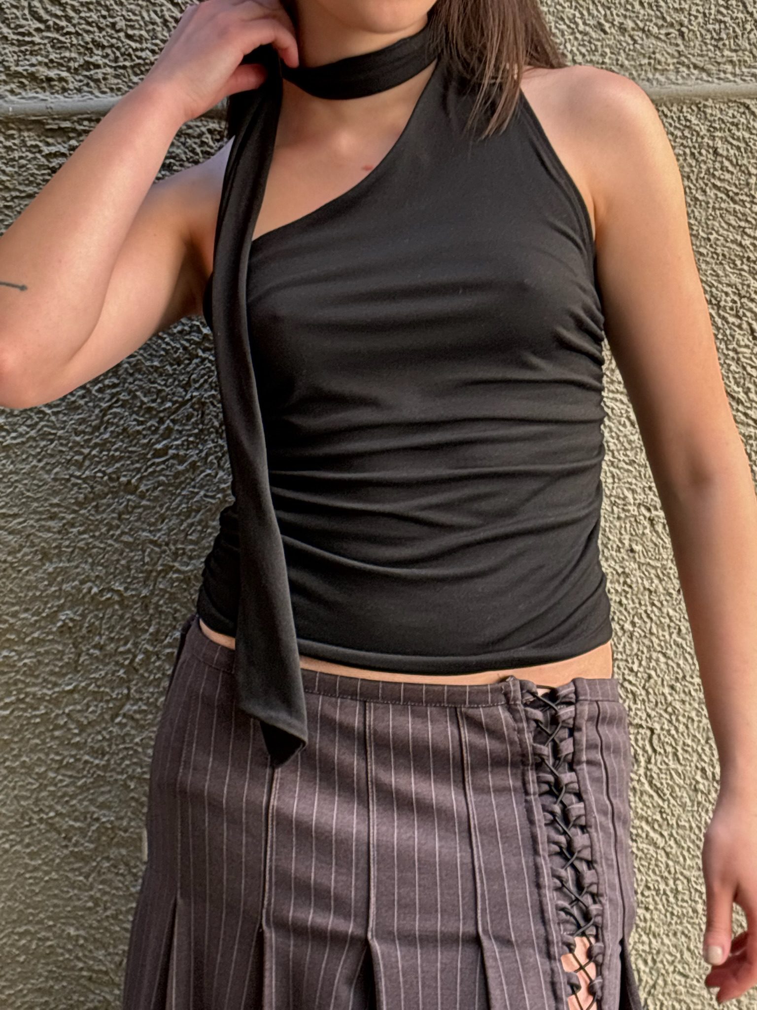 El diseño asimétrico de un solo hombro, acompañado de una manga larga que se extiende en una sofisticada tira anudable, crea una silueta vanguardista y sensual. Además, los delicados frunces laterales realzan tu figura de forma sutil y femenina.