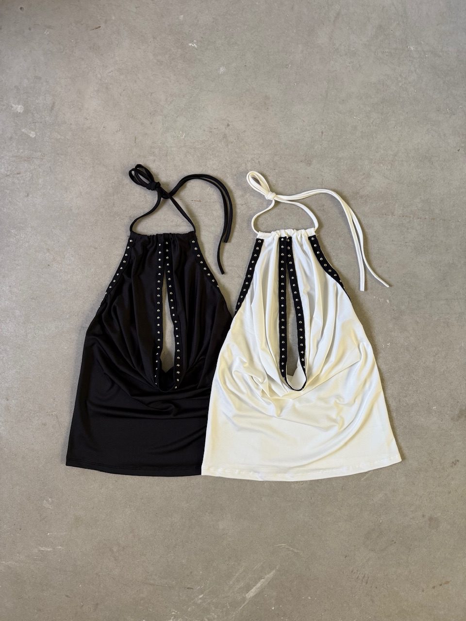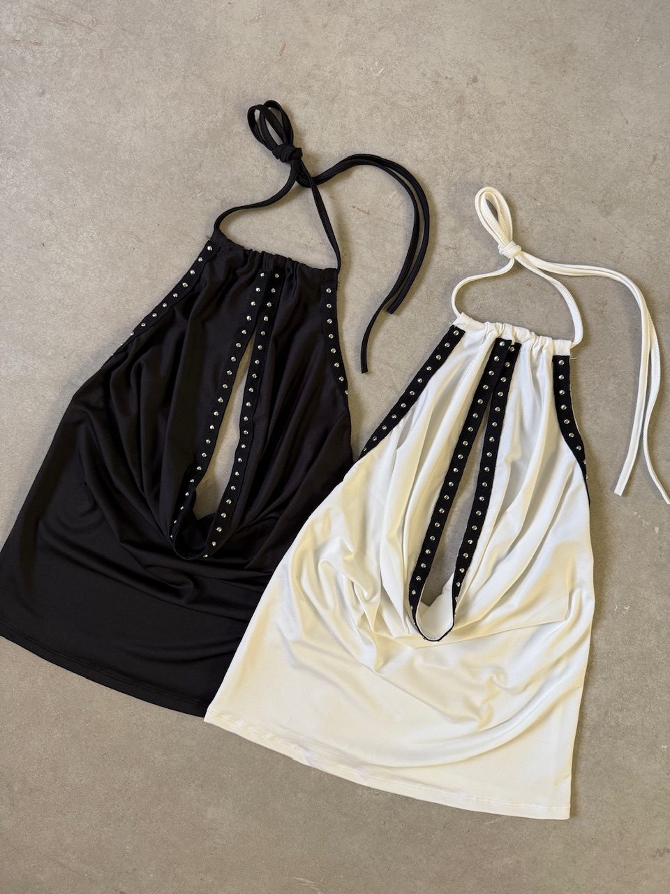 Top de fiesta y noche con cuello halter y detalle de buche o drapeado suave que cae elegantemente en el frente. Confeccionado en un tejido de punto elástico y liso, es cómodo y favorecedor. El escote está adornado con tachas metálicas plateadas que bordean la abertura central, dándole un toque rockero y glam. Se ata en la nuca con tiras ajustables.