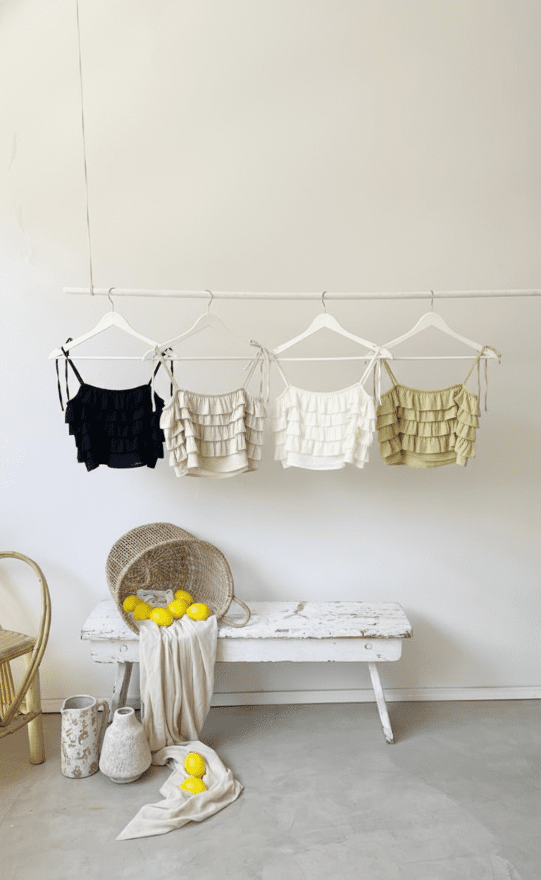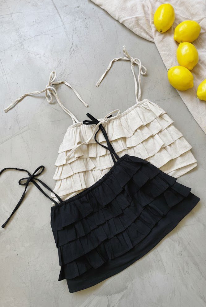 top con tirantes finos para atar con detalles de volados, confeccionado en lino italiano.