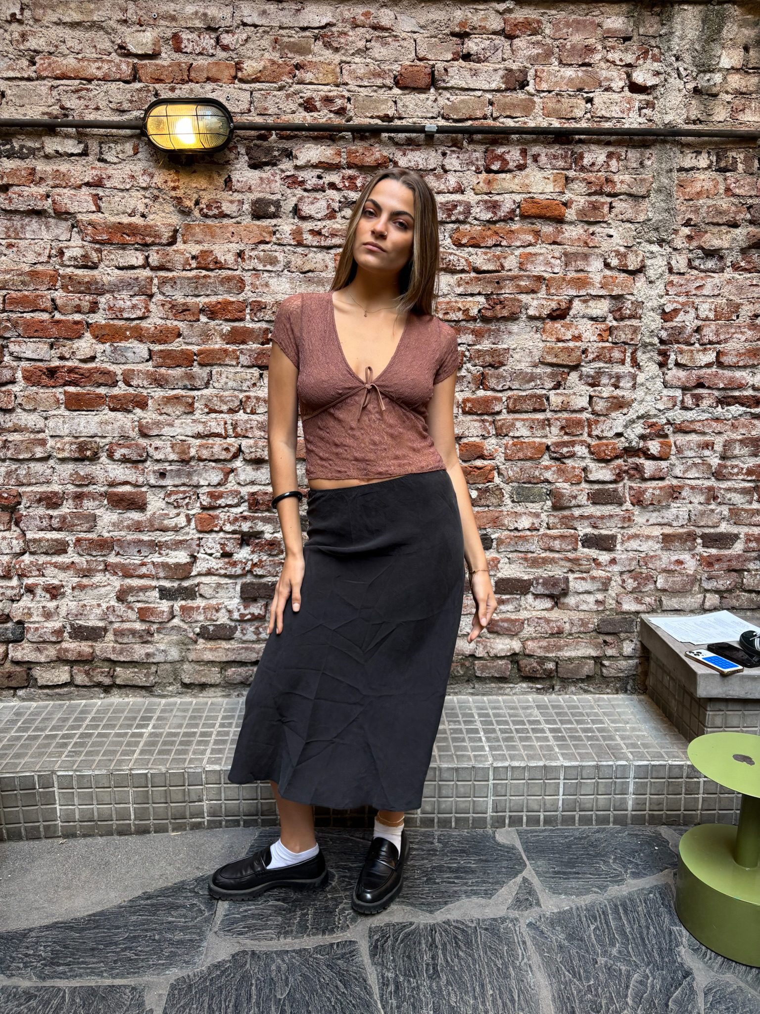 Confeccionado en un tejido de encaje o textura fina, este top de corte corto (cropped) y ajustado realza la figura de manera sutil. El escote en V es favorecedor, pero el verdadero protagonista es el lazo (ribbon) central.