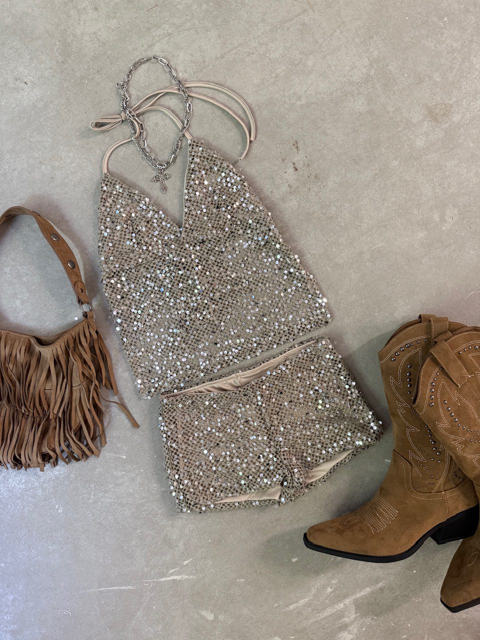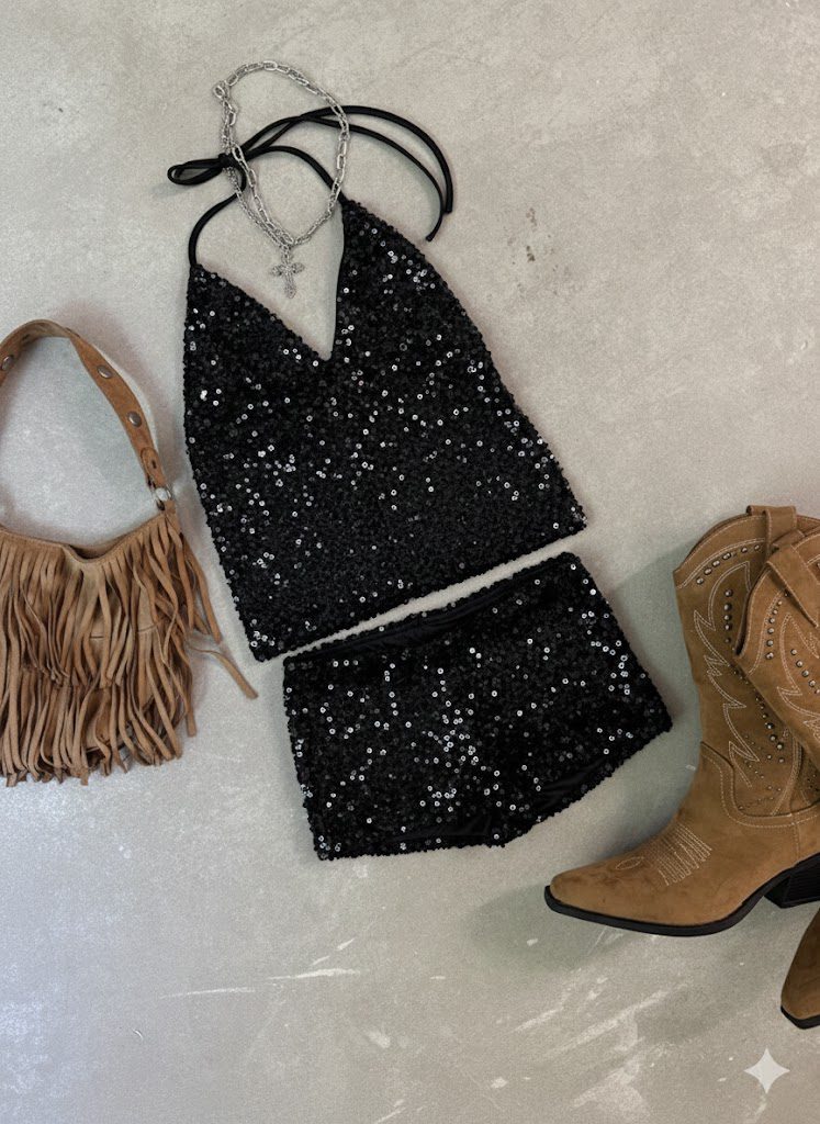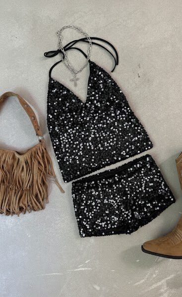 Top de noche y glamour con un favorecedor escote triangular (corte halter). Confeccionado en tejido con lentejuelas que cubren toda la prenda, asegurando un brillo espectacular. Su diseño se completa con una espalda totalmente descubierta y lazos que se atan en la nuca y espalda, ofreciendo un ajuste personalizado. Una prenda esencial para quienes desean brillar en eventos, fiestas o salidas nocturnas