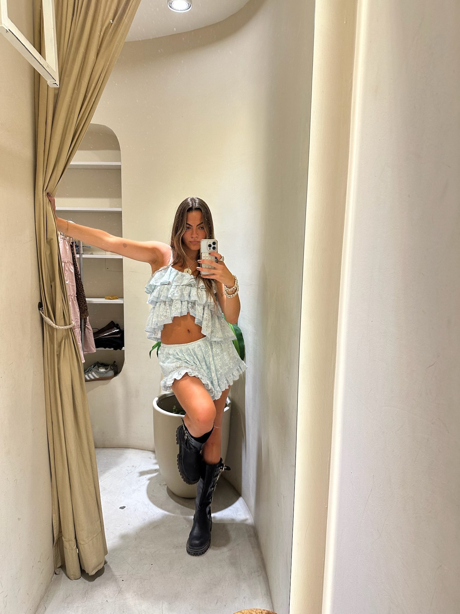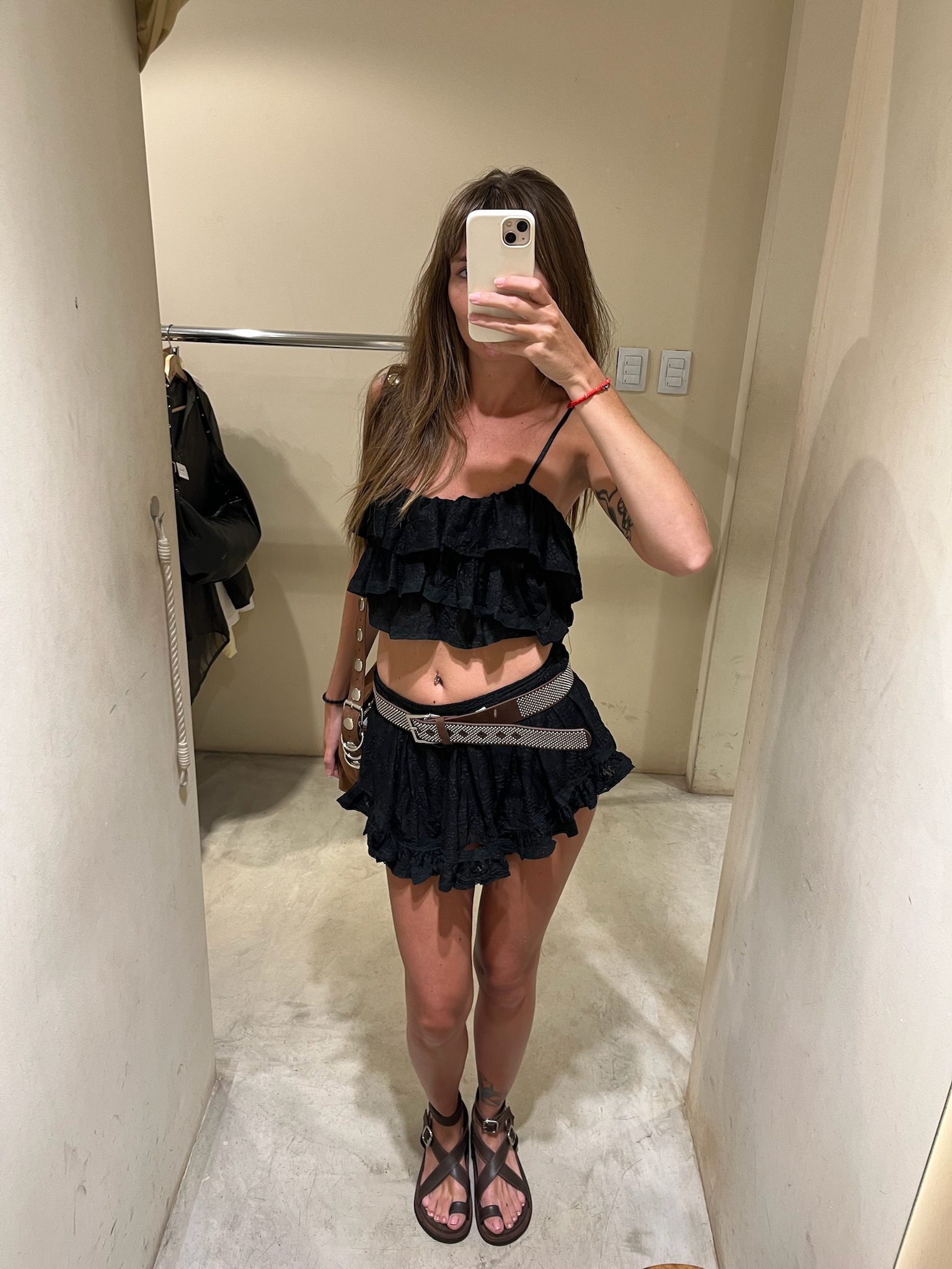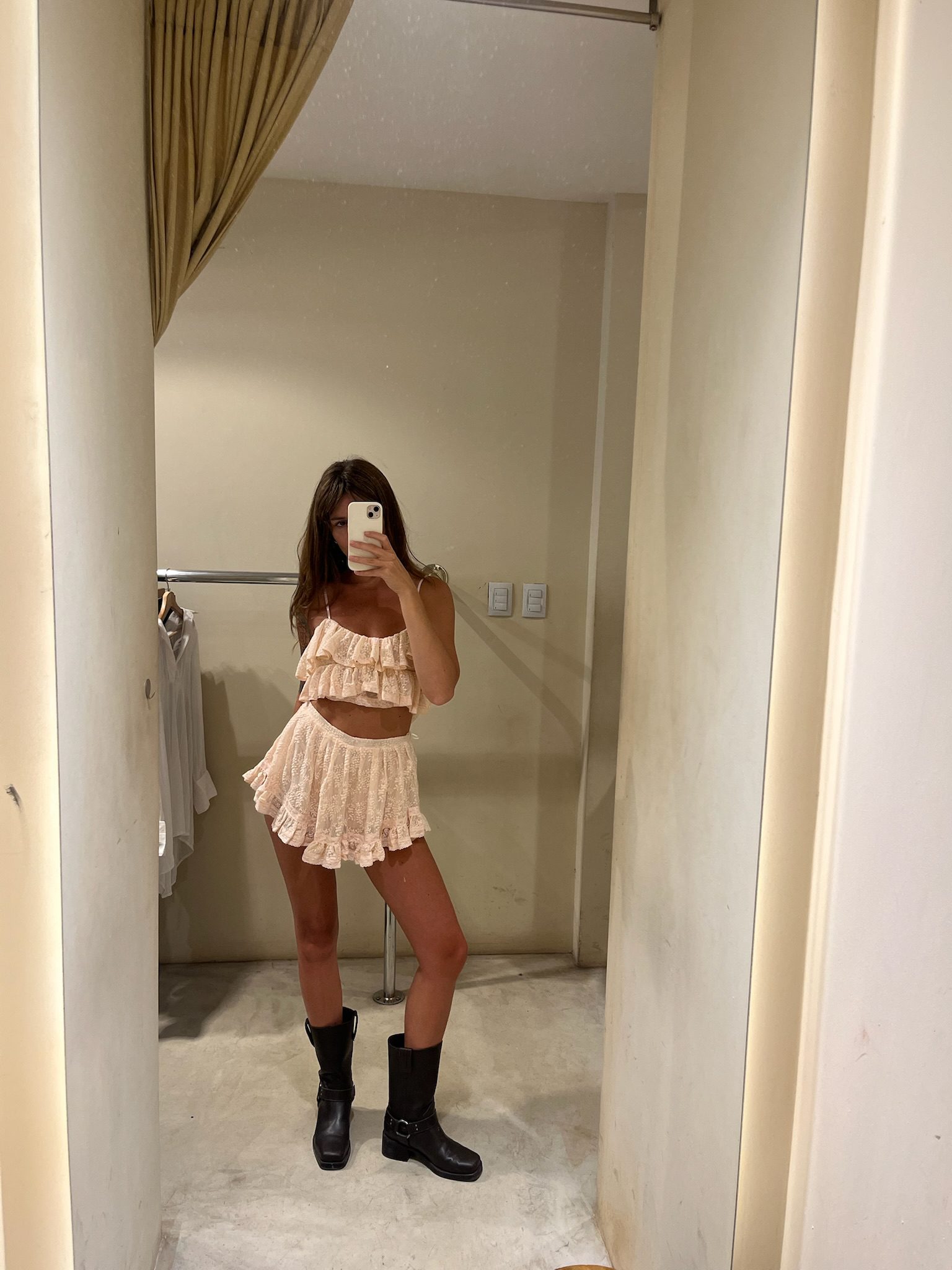 Enamorate de nuestro Top Volados, una pieza cargada de feminidad y detalles artesanales. Este diseño presenta un escote halter que se ata al cuello, dejando los hombros al descubierto para un look sofisticado. Lo que lo hace único son sus tres niveles de volados en encaje delicado, que aportan un volumen suave y mucho movimiento. Su color crema y la transparencia sutil del encaje lo convierten en la prenda ideal para combinar con denim blanco o tonos tierra, logrando un estilo boho-chic impecable.