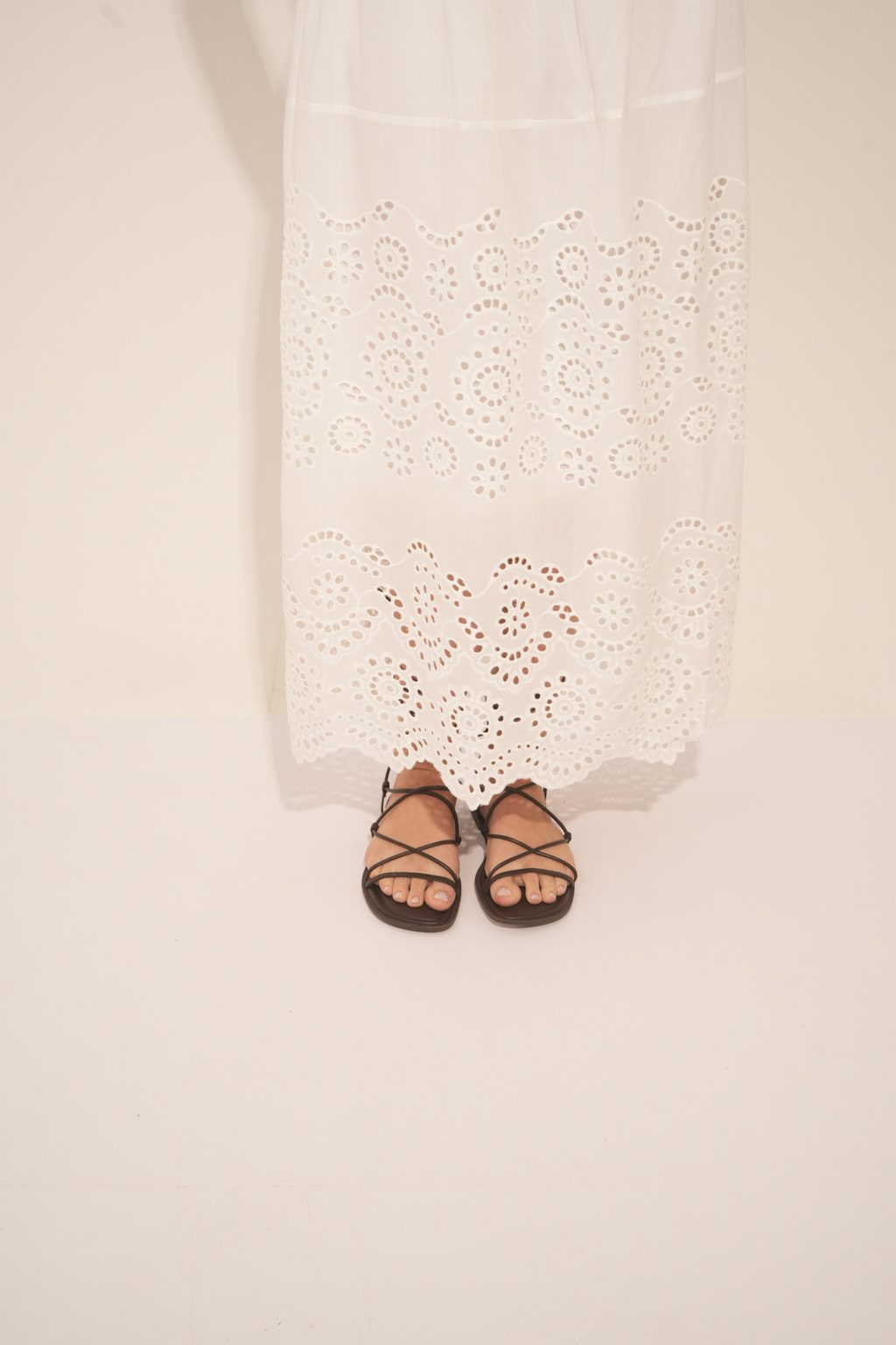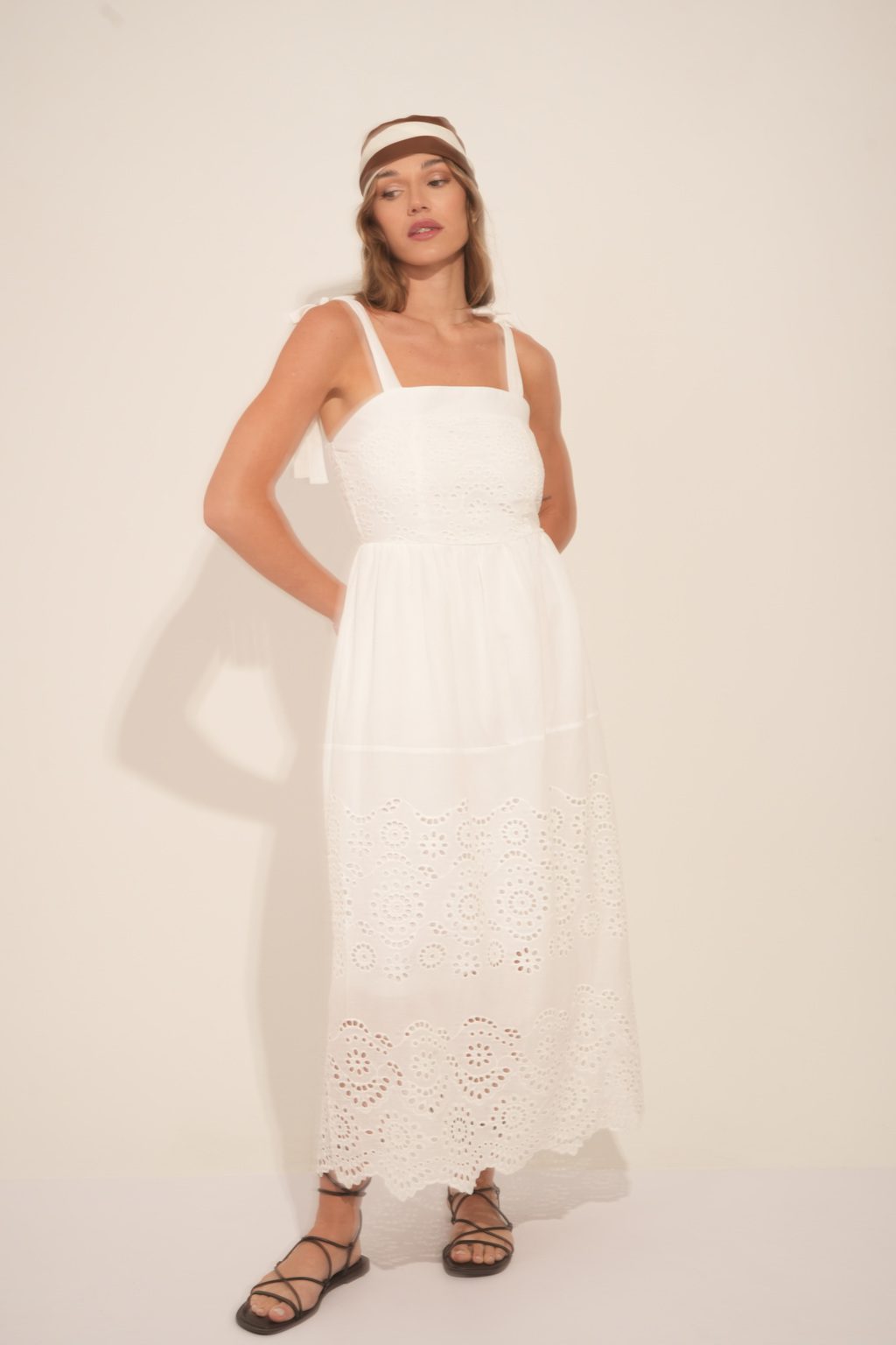 vestido escote cuadrado, corte midi con breteles regulables con lazo y elastico en espalda, confeccionado en broderi, talle único, pero abarca del S al L