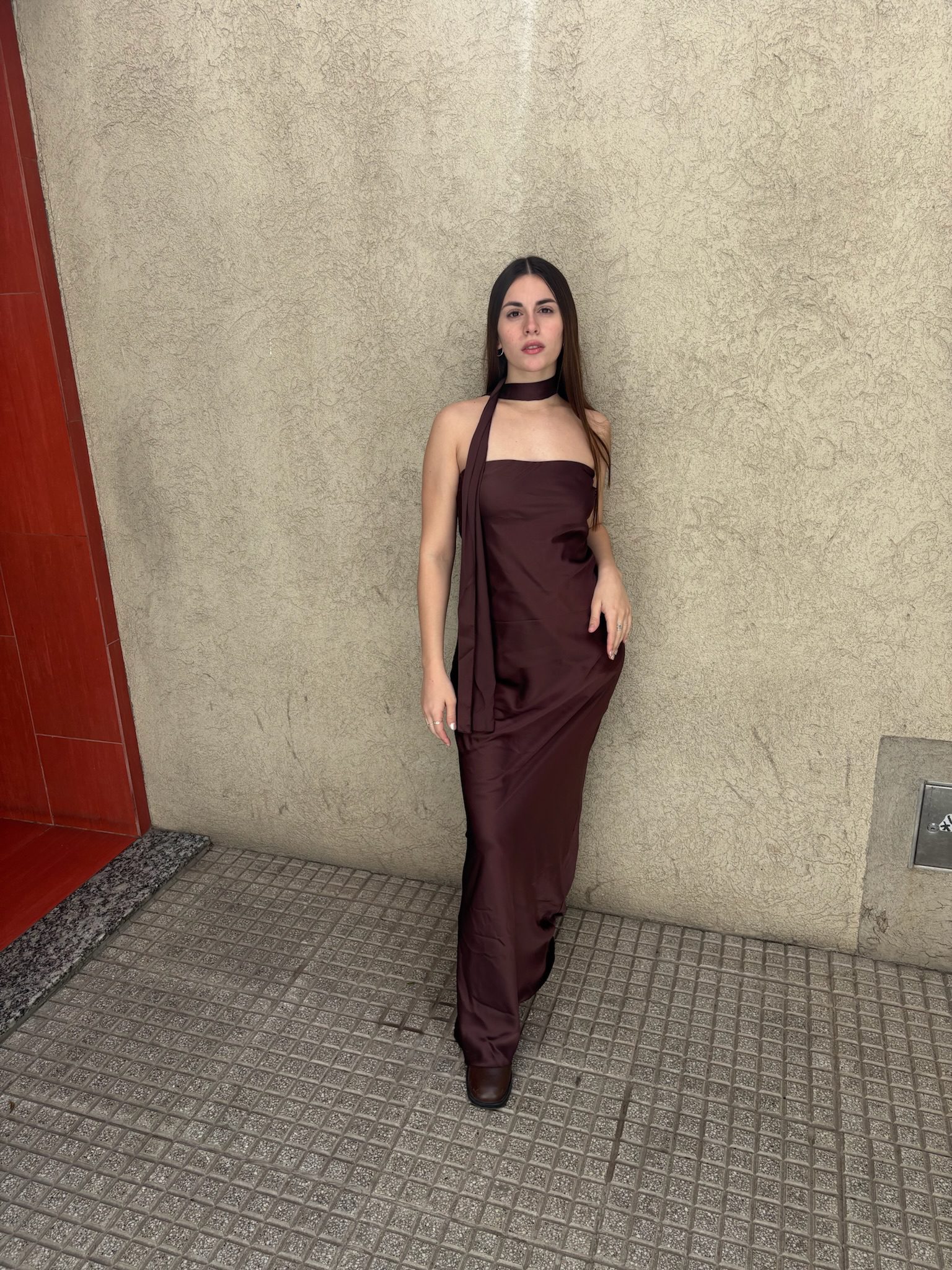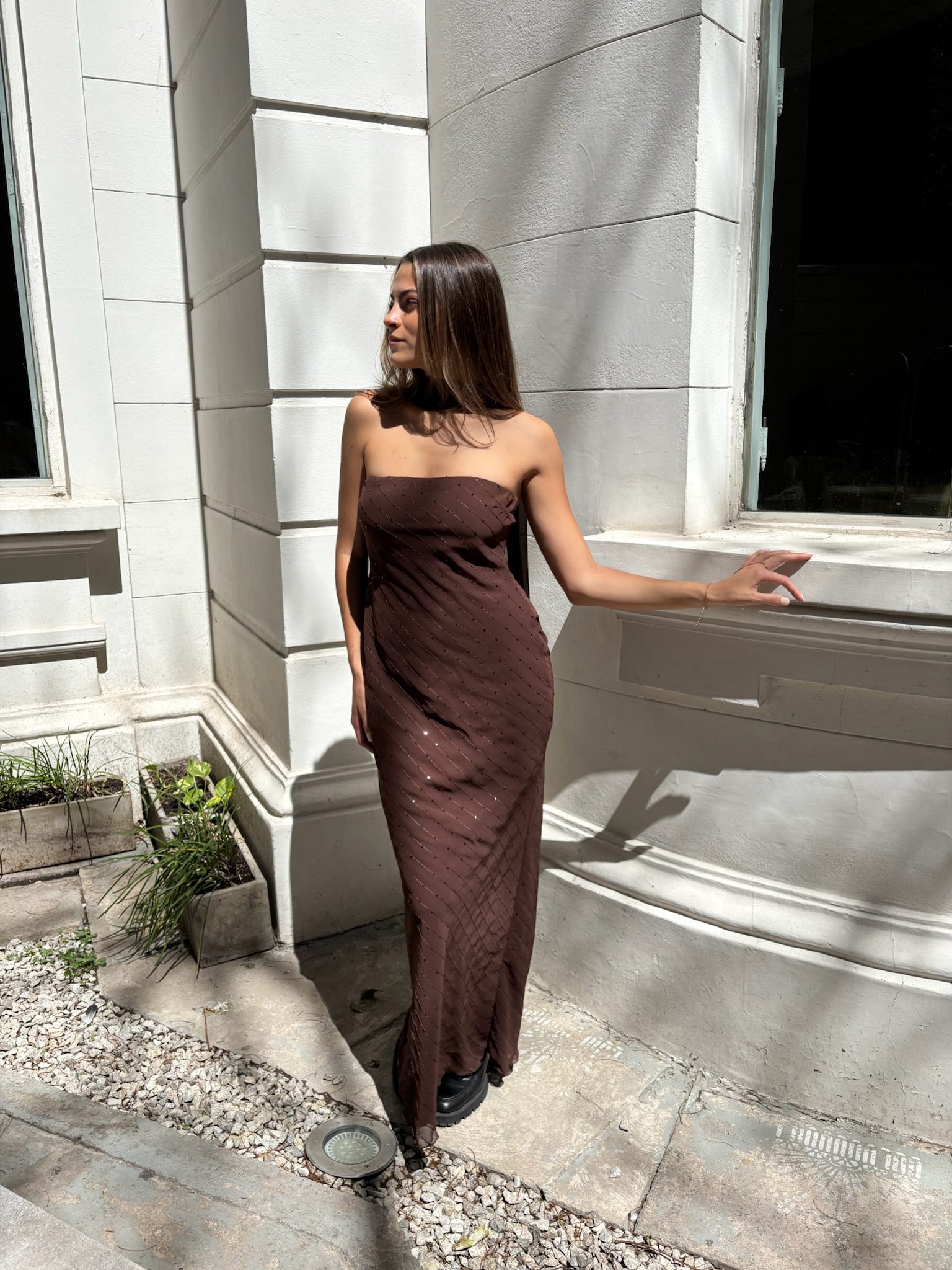 Su corte strapless (sin tirantes) es audaz y sofisticado, ideal para destacar hombros y cuello. Confeccionado en un tejido color marrón chocolate que abraza la figura, el vestido está salpicado de un patrón de brillo sutil que juega con la luz, brindando un efecto ‘estrella’ discreto y lujoso.