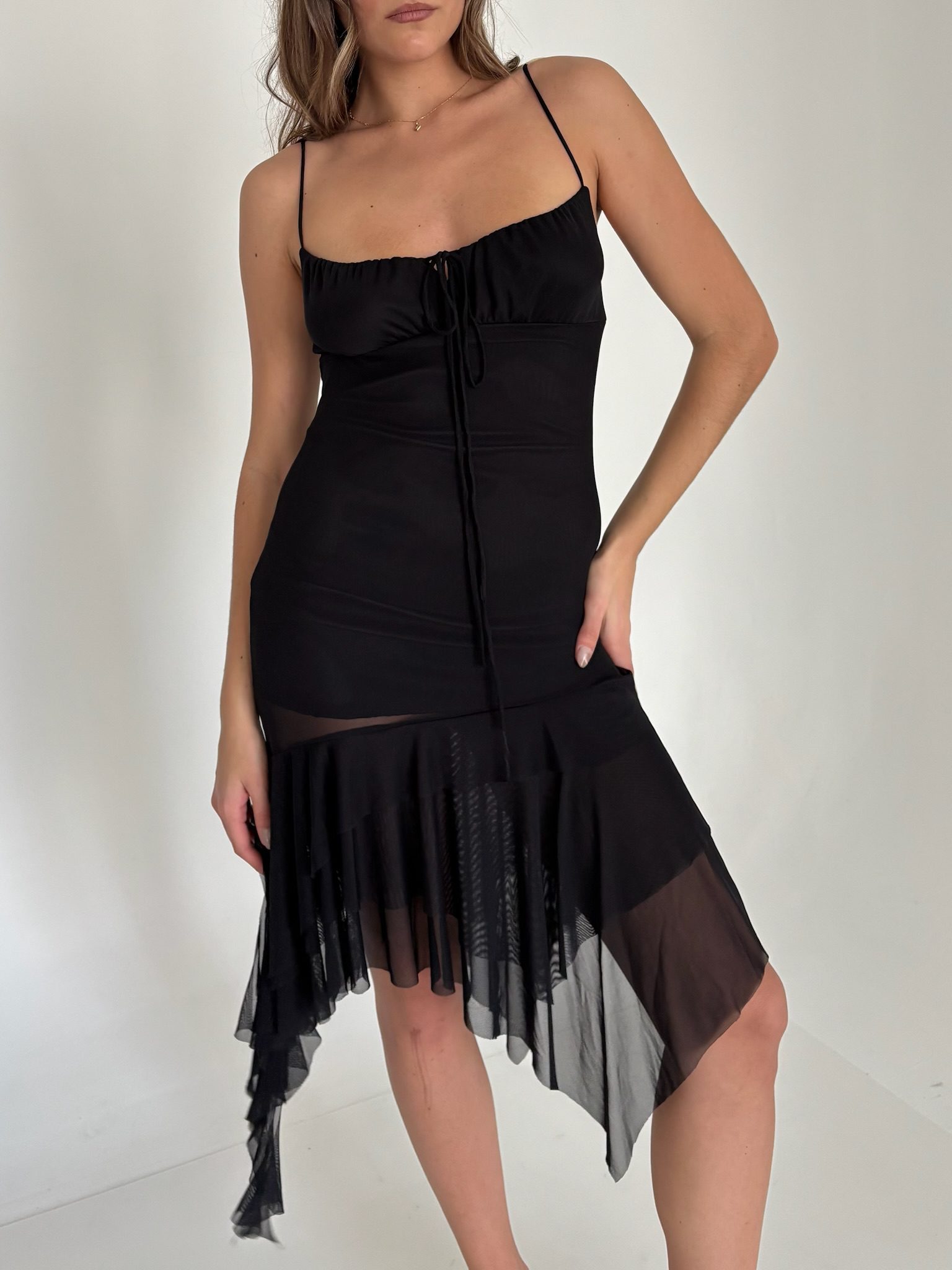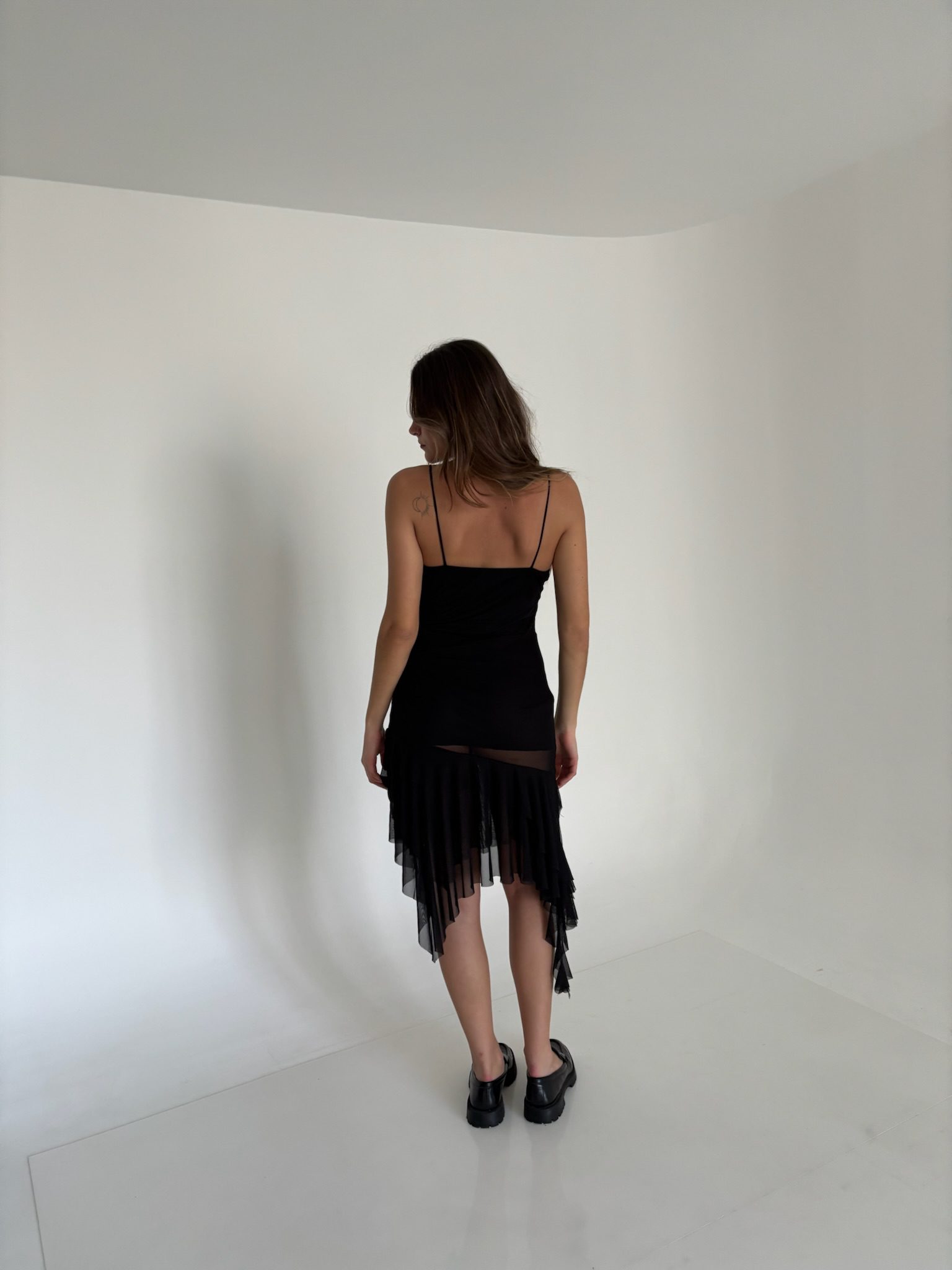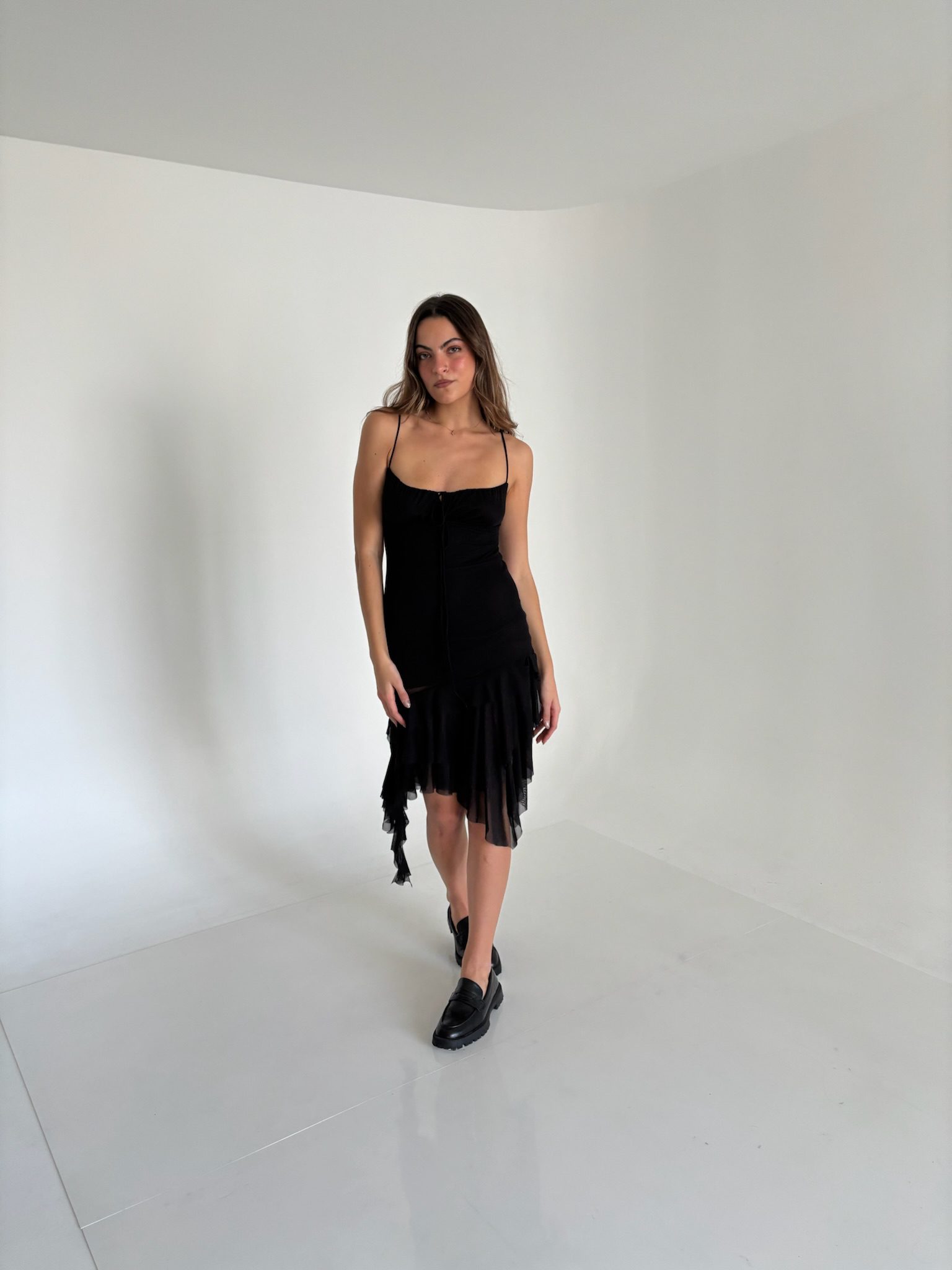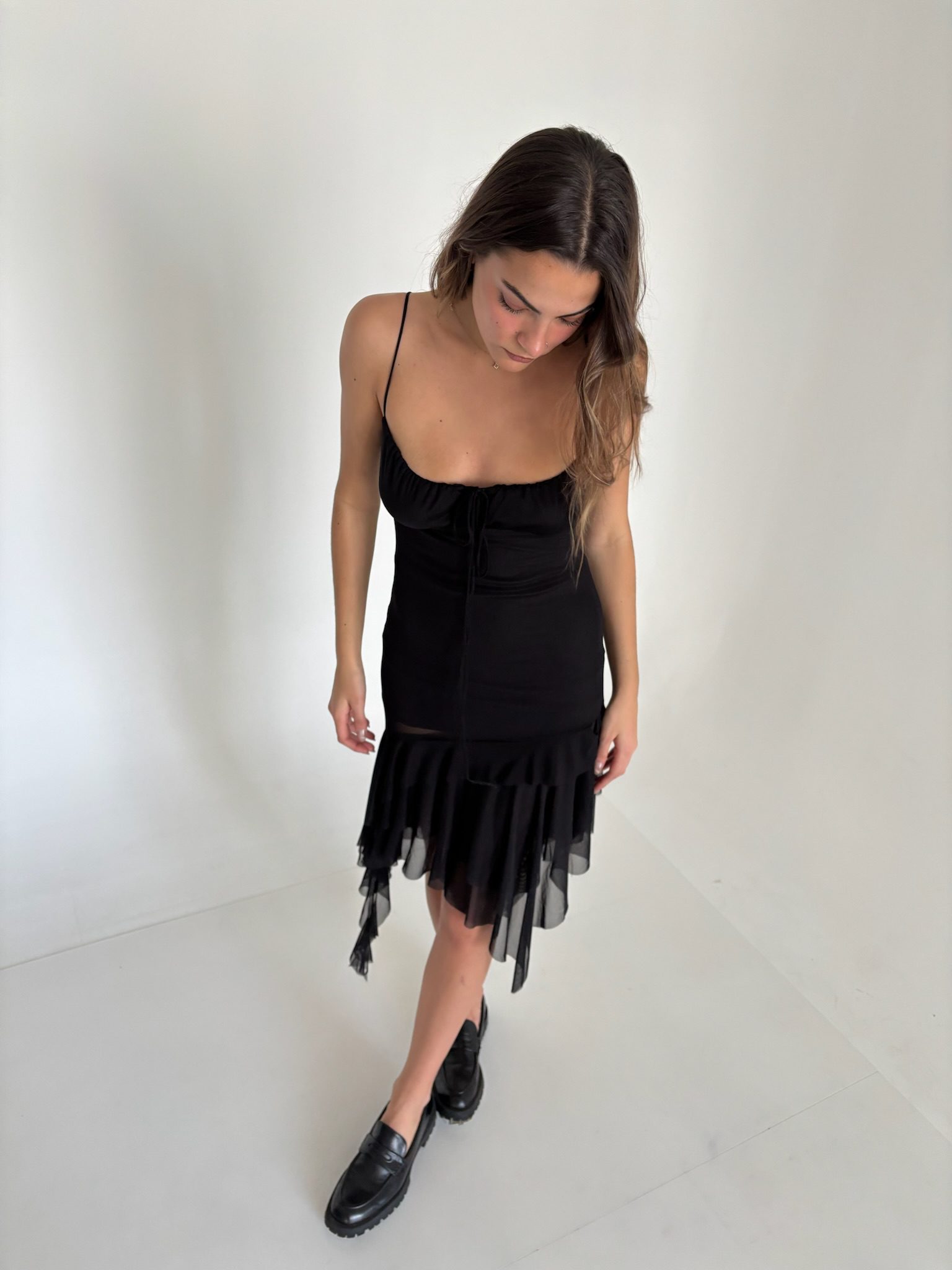 El vestido largo de gasa es la pieza que estabas esperando para brillar en tus eventos. Con un diseño de tirantes finos y un escote que se ajusta con un lazo, este vestido te hace sentir elegante y sexy al mismo tiempo. La falda con volados asimétricos de gasa le da un movimiento espectacular y un toque gótico que nos encanta. Es ideal para un festival de música, una salida a la noche o cualquier ocasión en la que quieras sentirte poderosa y con actitud.