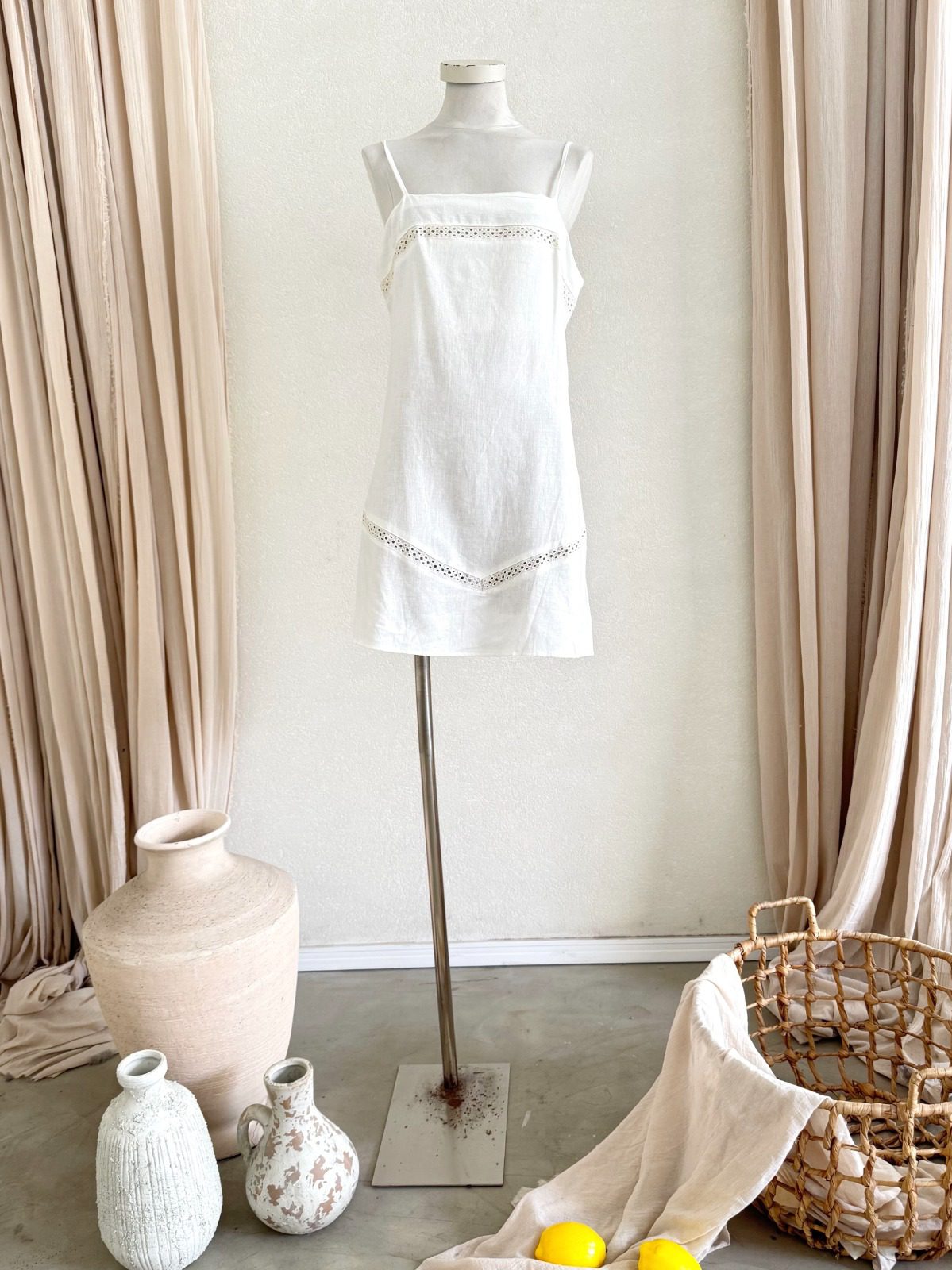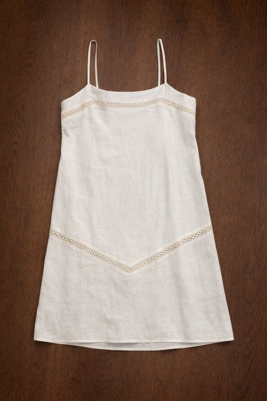 Vestido corto estilo A-line con tirantes finos ajustables. Confeccionado en exclusivo Lino Italiano, un tejido fresco y de alta calidad, ideal para el verano. El diseño presenta sutiles detalles de puntilla o lace trim en el escote y el bajo, dándole un toque boho y romántico.