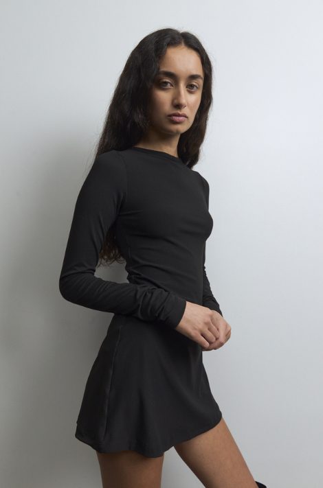 Vestido corto negro de mangas largas, con corte evasé que estiliza. Minimalista, sexy y versátil. Black essential.